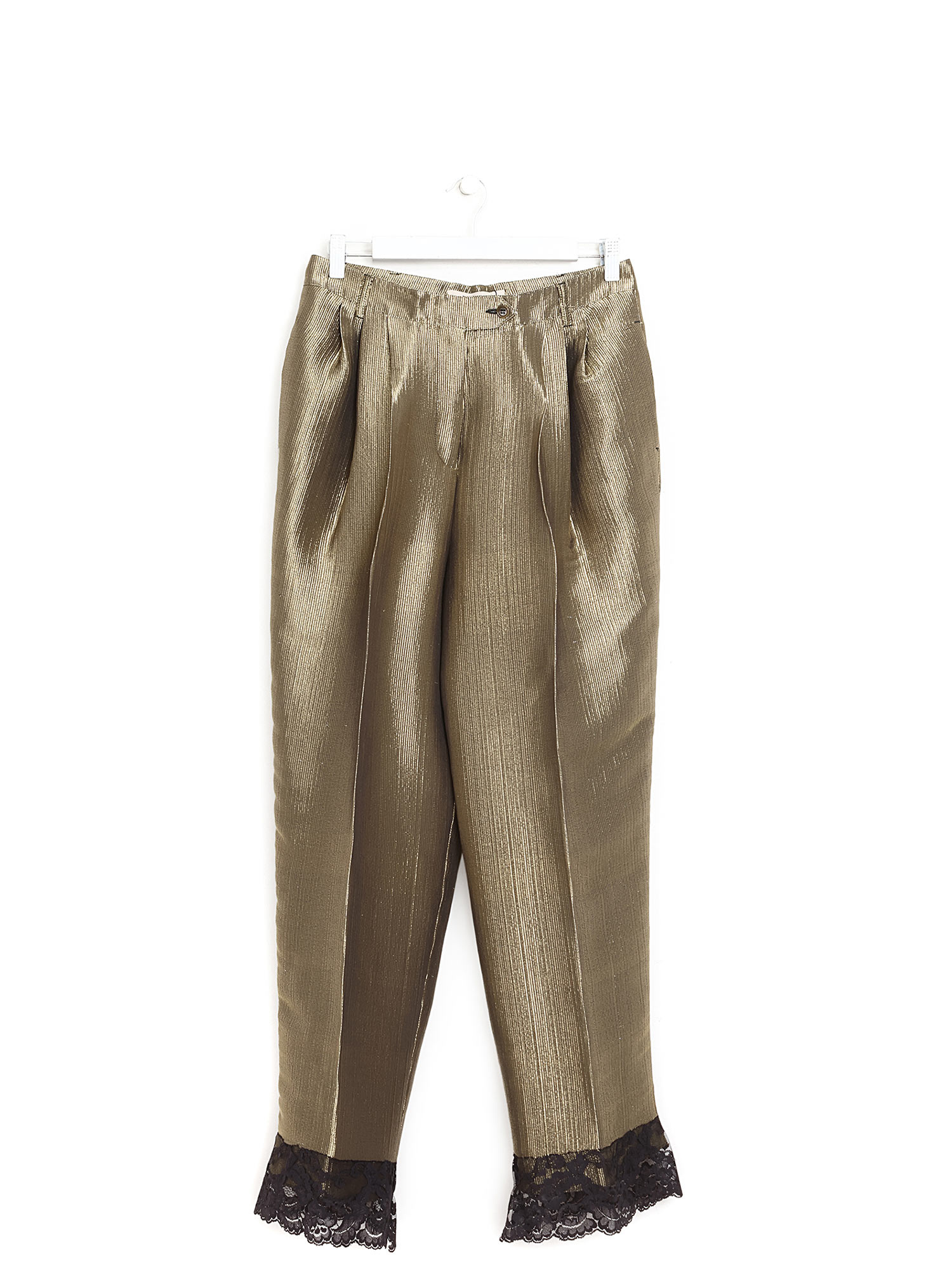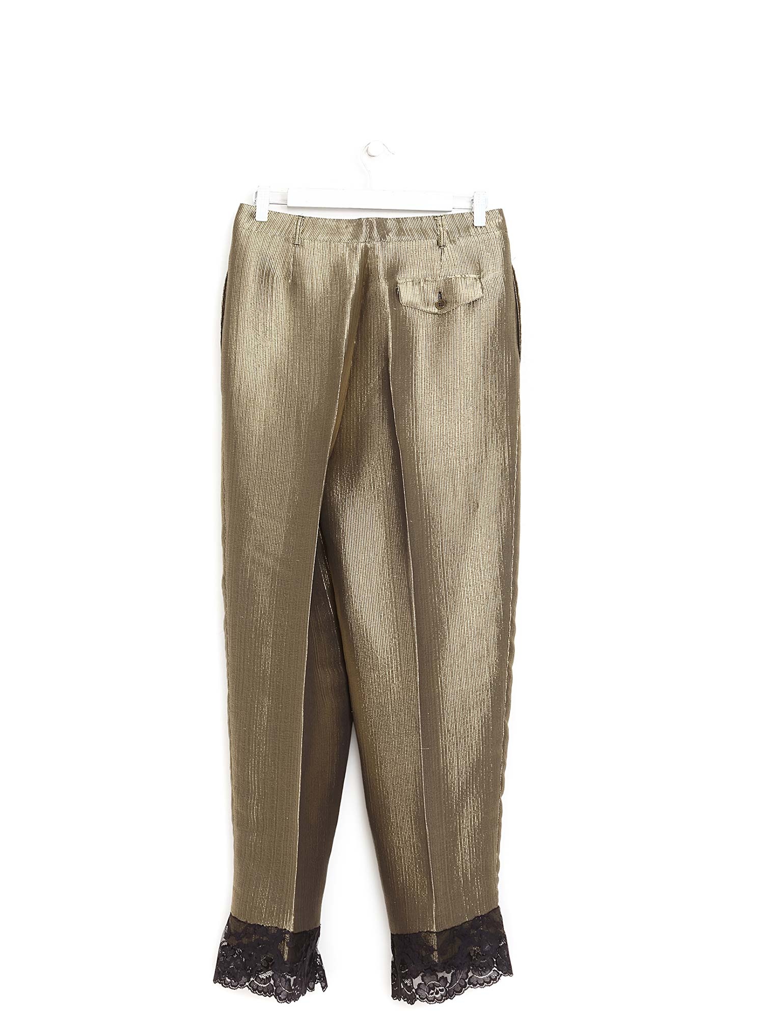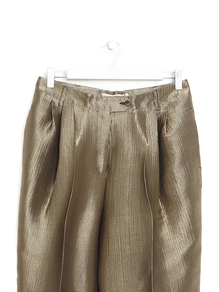 Pantalon à jambe droite en tissu métallique doré et noir. Détail plissé. Fermeture à glissière. Finition brillante.