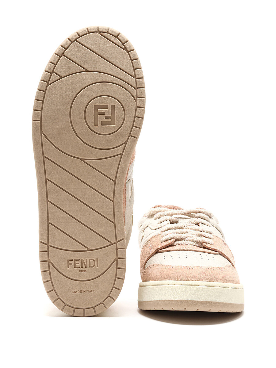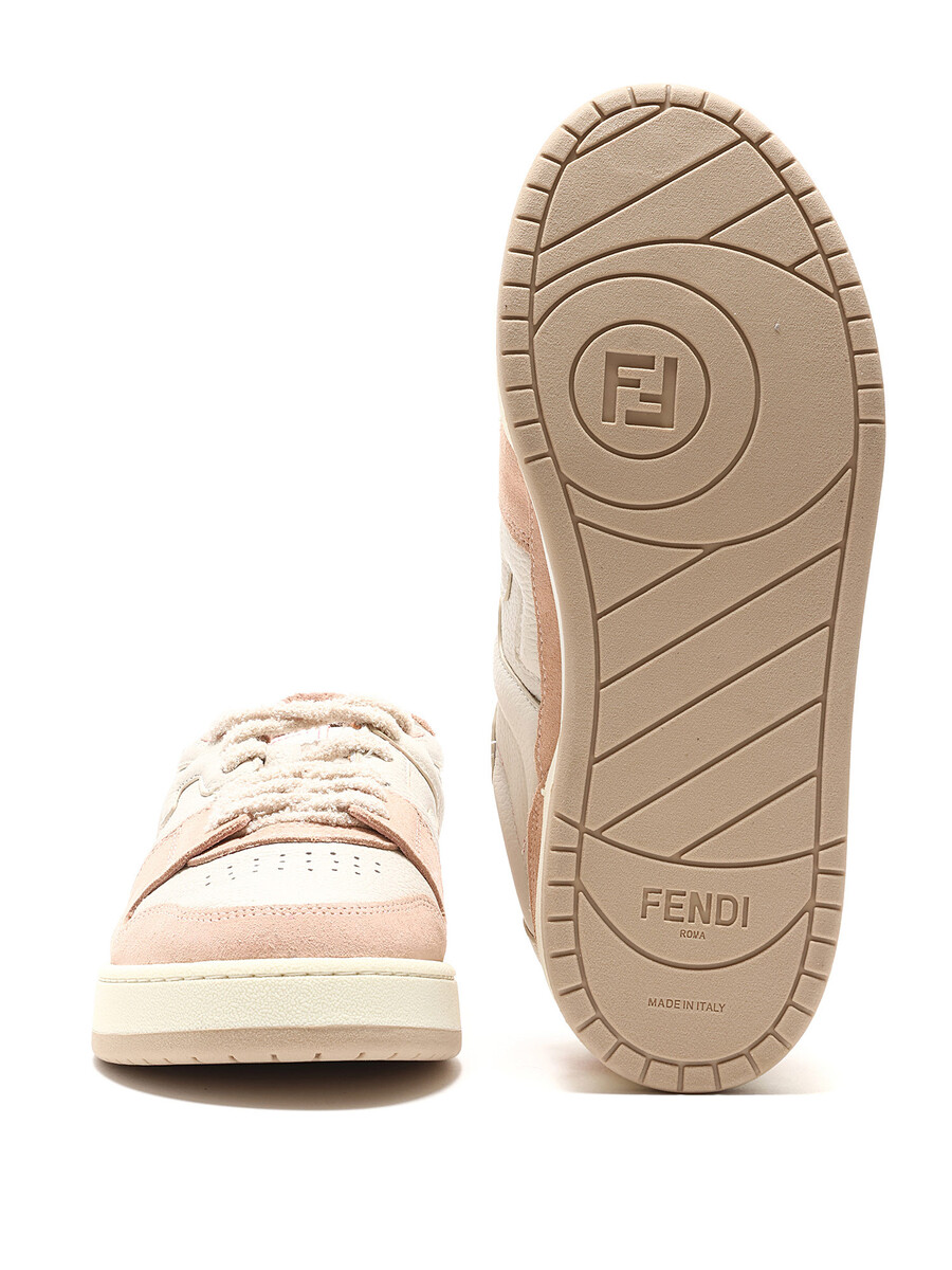 Baskets à design perforé en beige et crème. Fermeture à lacets. Style à bout rond. Semelle en caoutchouc. Marquage Fendi. Livrées avec boîte.