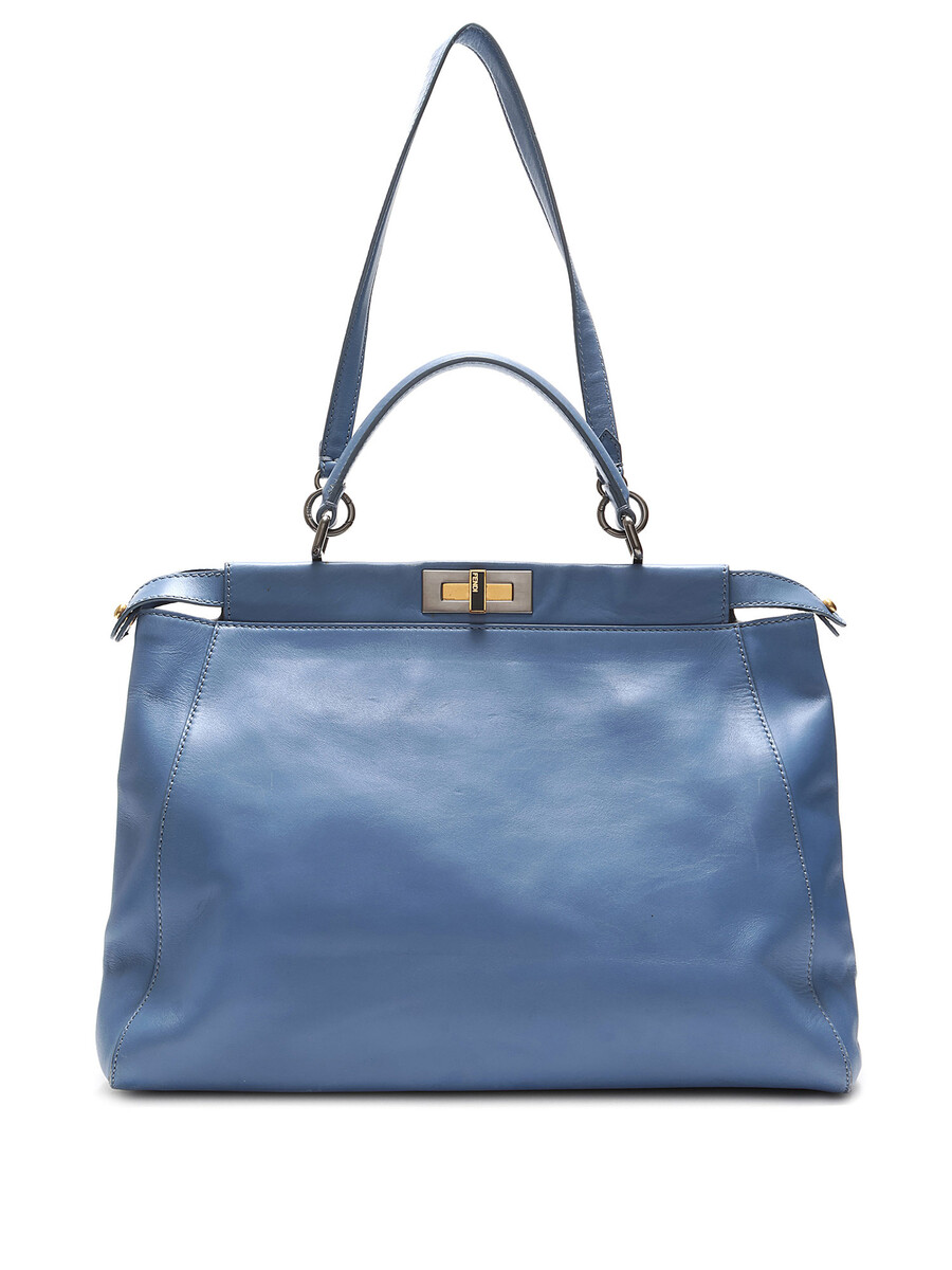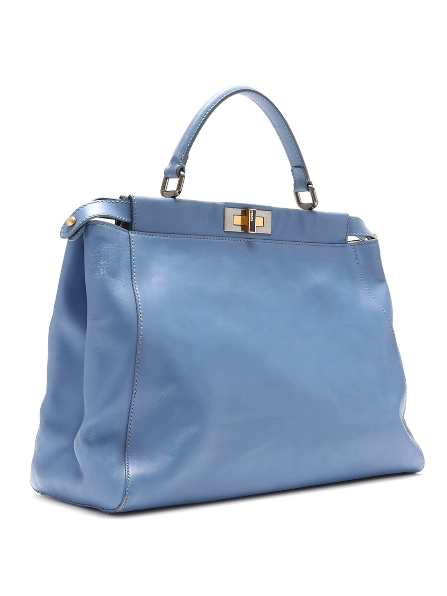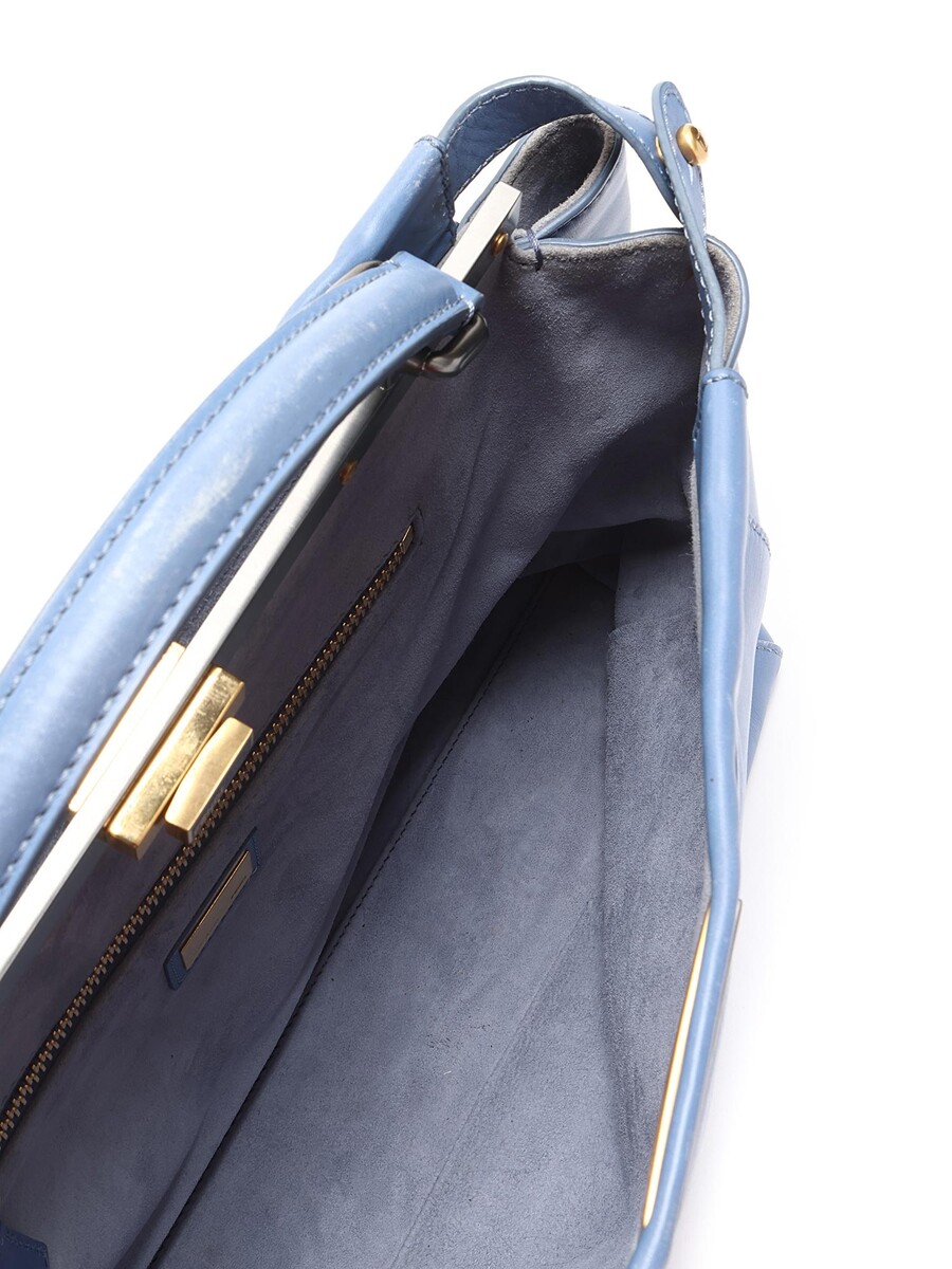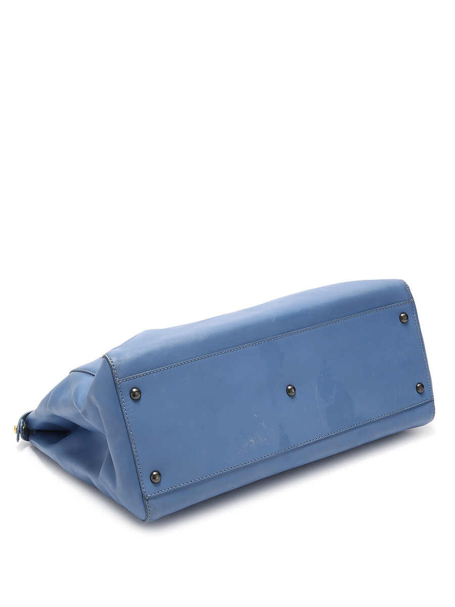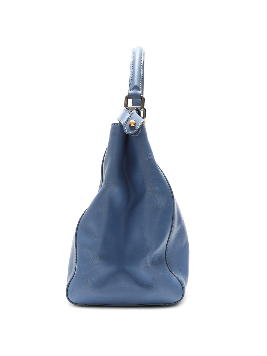 Cabas en cuir bleu avec fermeture à tourniquet. Anse supérieure et bandoulière amovible. Ferrures dorées.