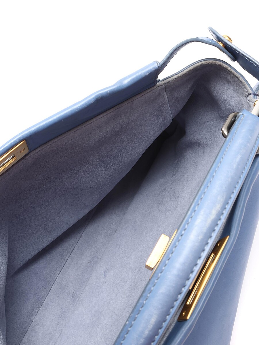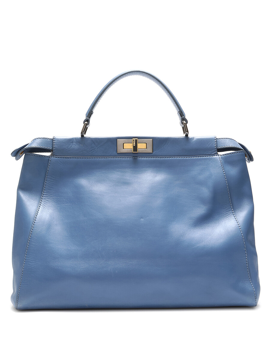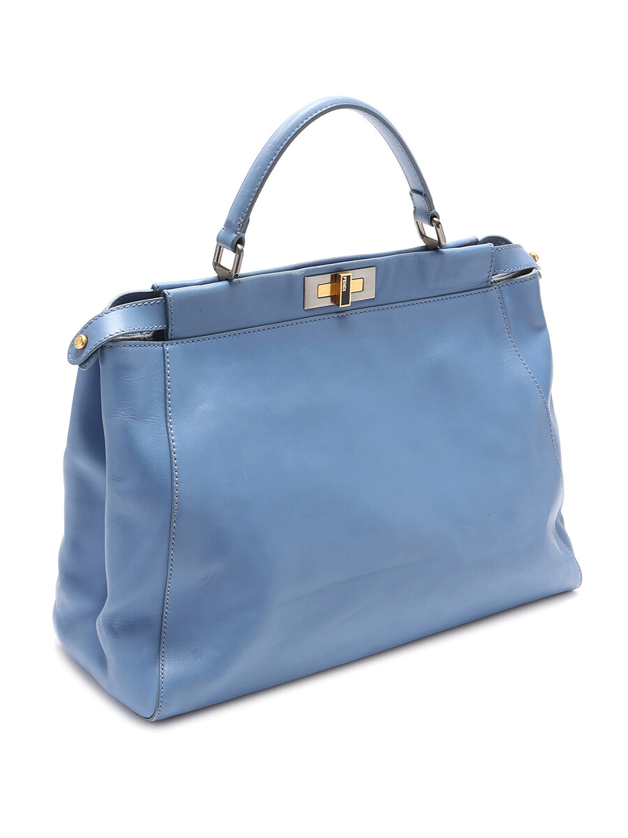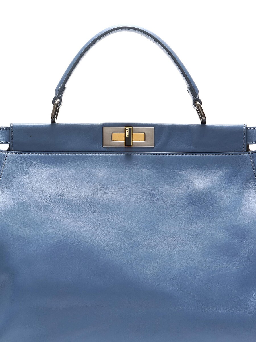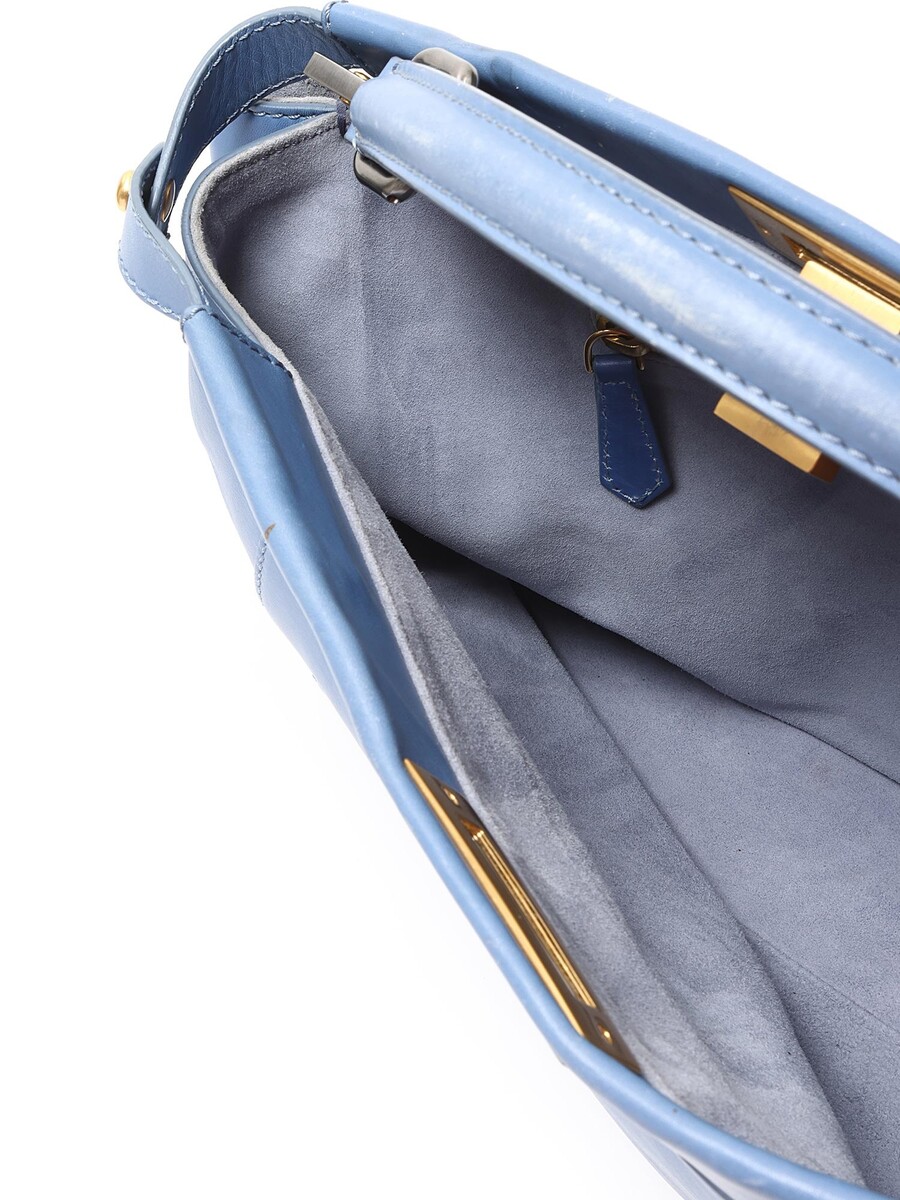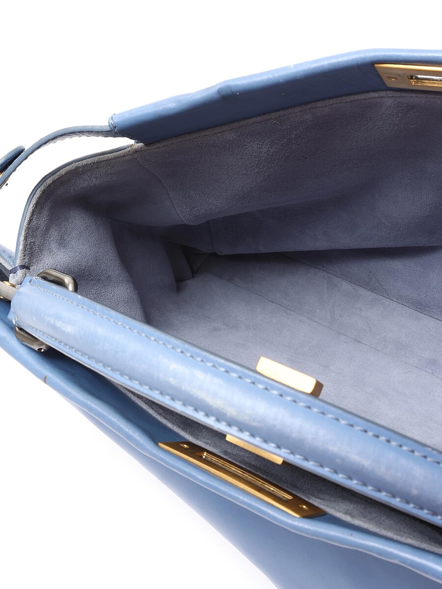 Cabas en cuir bleu avec fermeture à tourniquet. Anse supérieure et bandoulière amovible. Ferrures dorées.