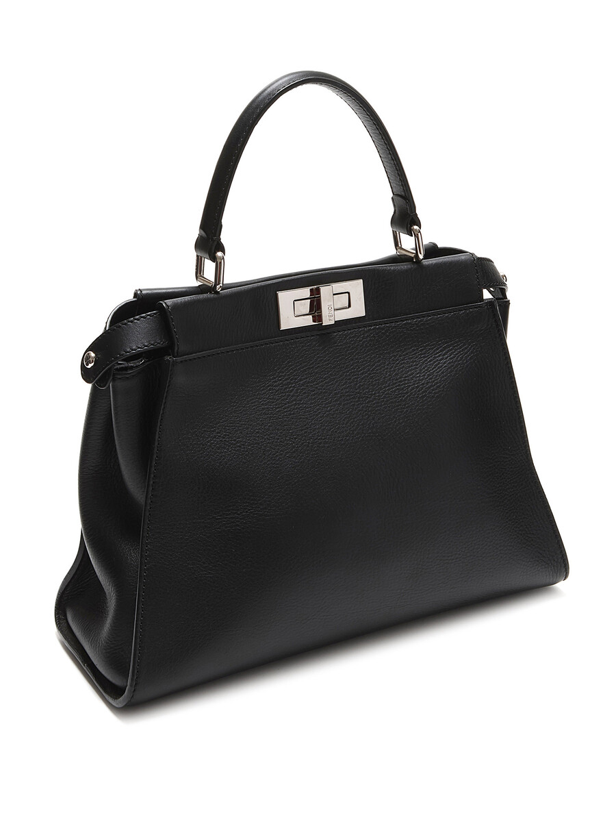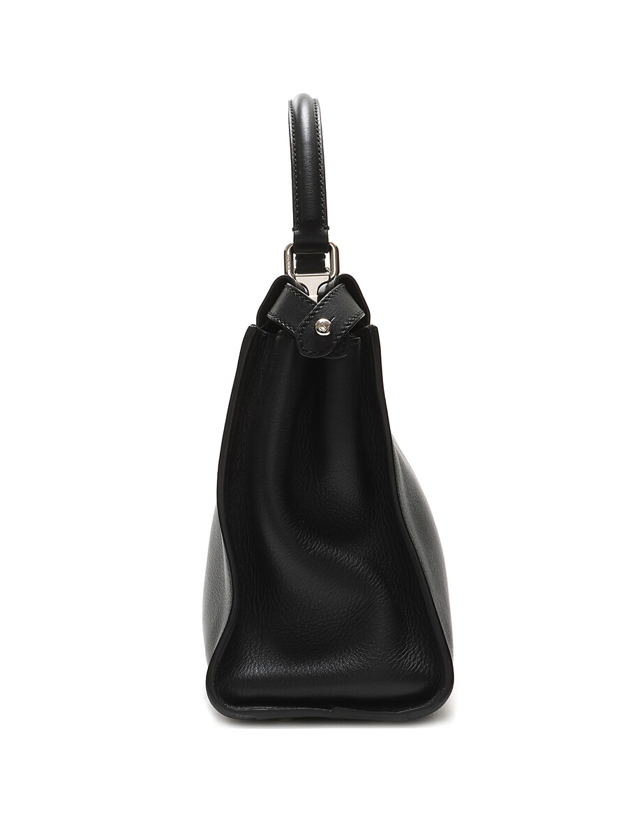 Sac en cuir noir à design emblématique Monster Eyes avec ferrures argentées. Fermeture à tourniquet. Trois compartiments. Anses doubles roulées en cuir.