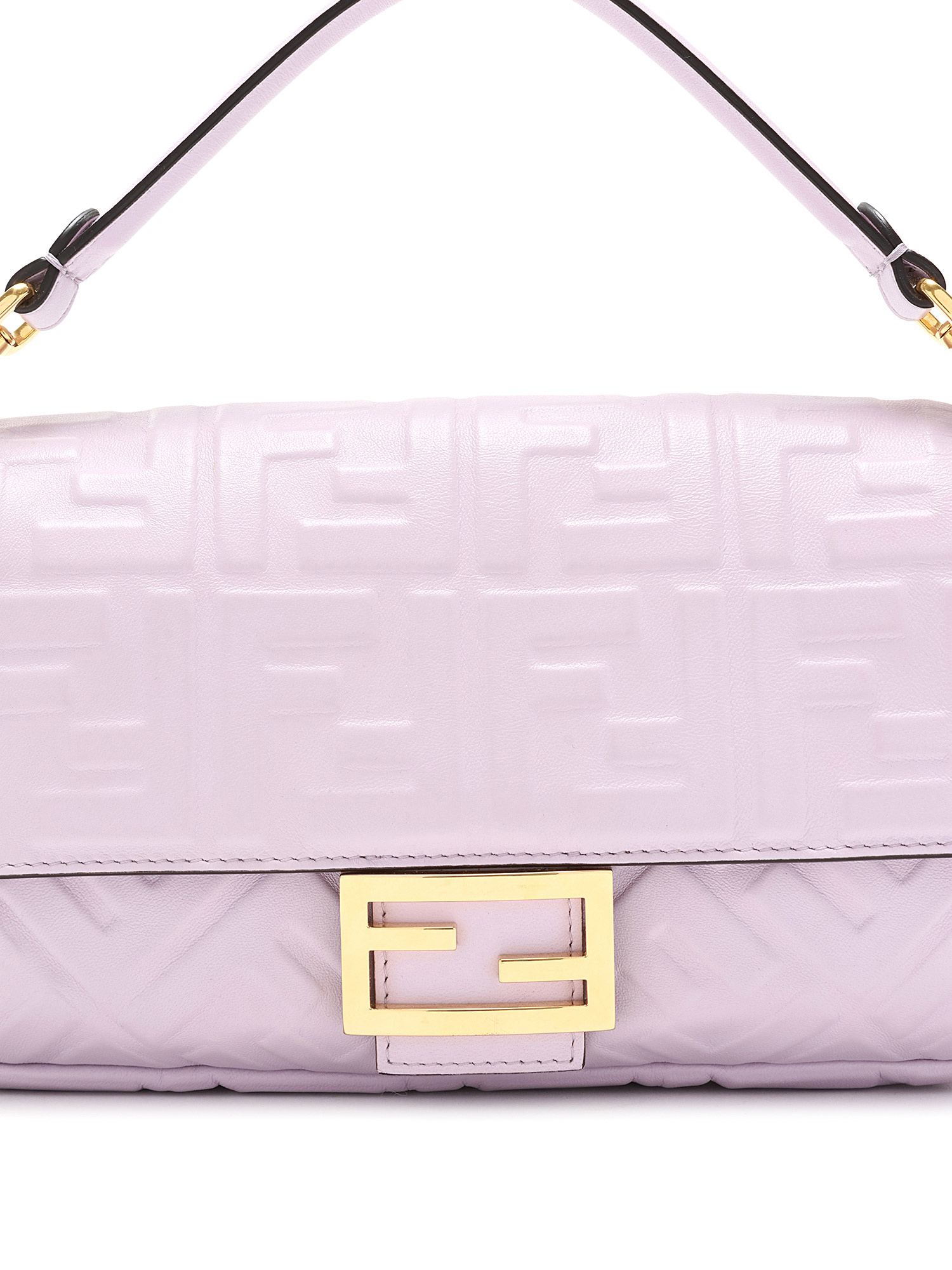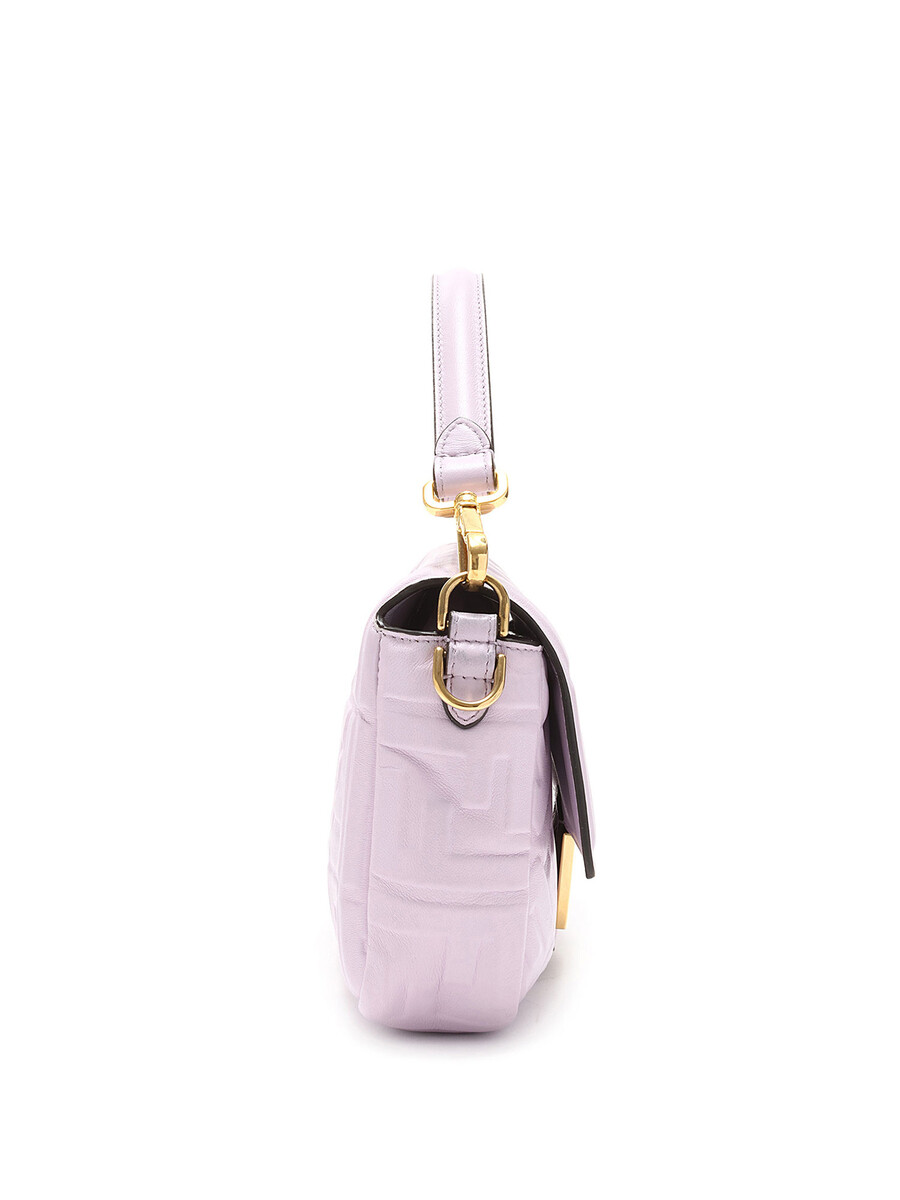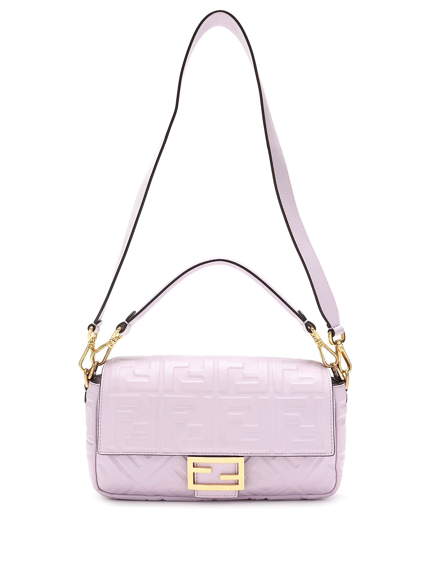 Sac à bandoulière en cuir lilas avec motif embossé logo FF. Rabat avec fermeture à pression. Deux bandoulières en cuir amovibles. Ferrures dorées et garnitures en cuir. Avec dust bag.