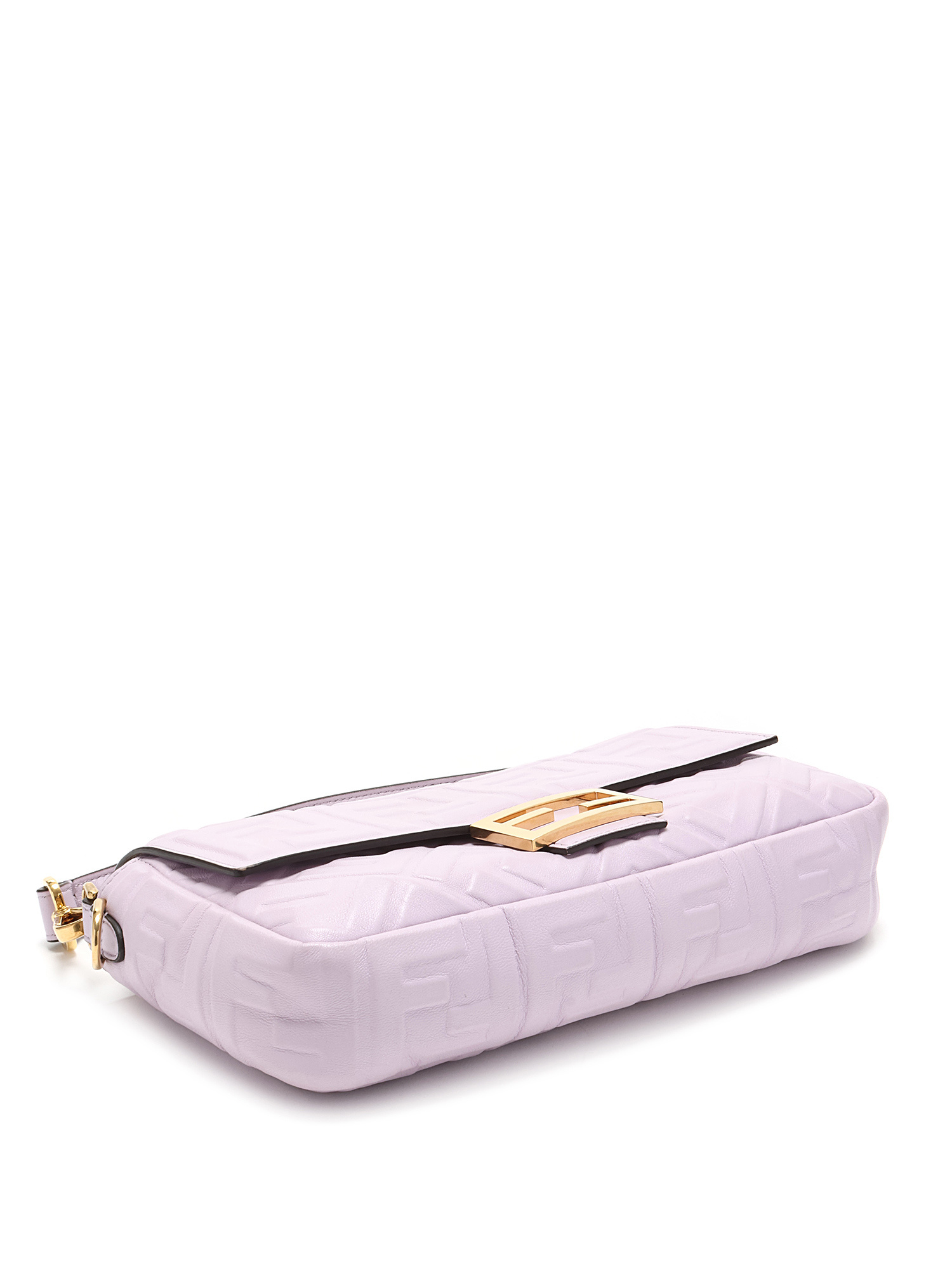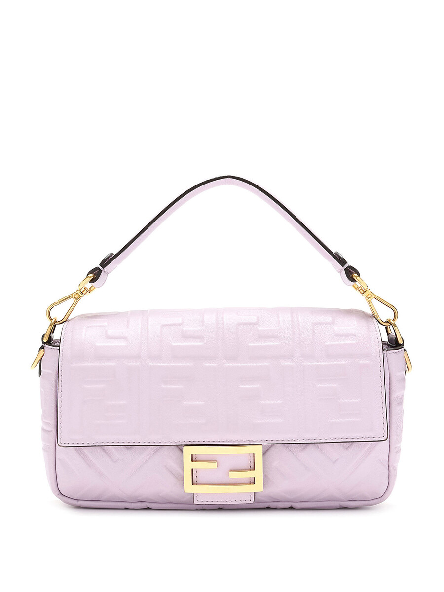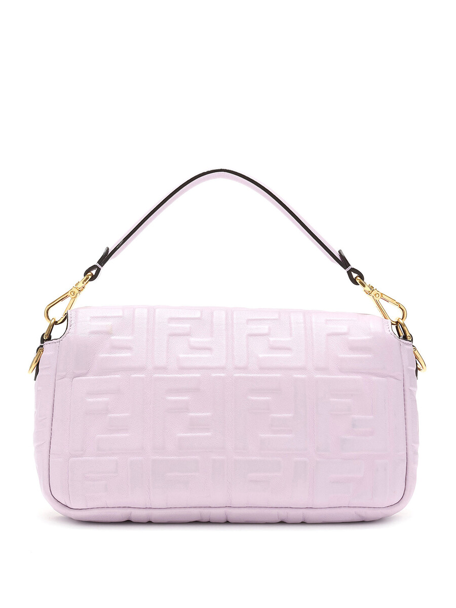 Sac à bandoulière en cuir lilas avec motif embossé logo FF. Rabat avec fermeture à pression. Deux bandoulières en cuir amovibles. Ferrures dorées et garnitures en cuir. Avec dust bag.