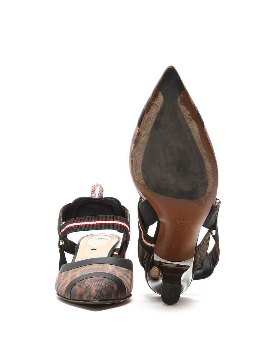 Talons slingback en cuir et tissu bicolores avec détail rayé en brun, noir et bordeaux. Bout pointu avec bride élastique.
