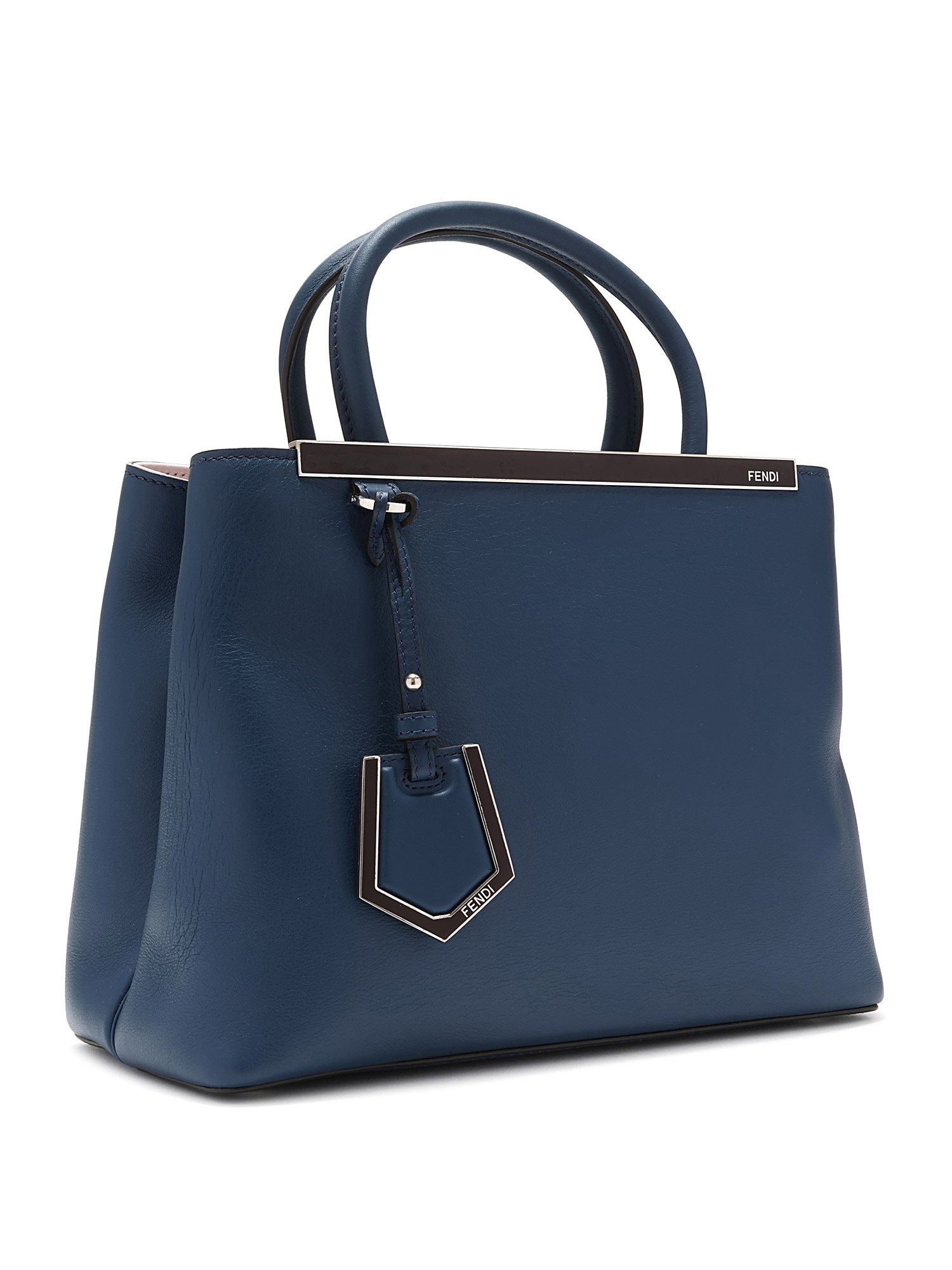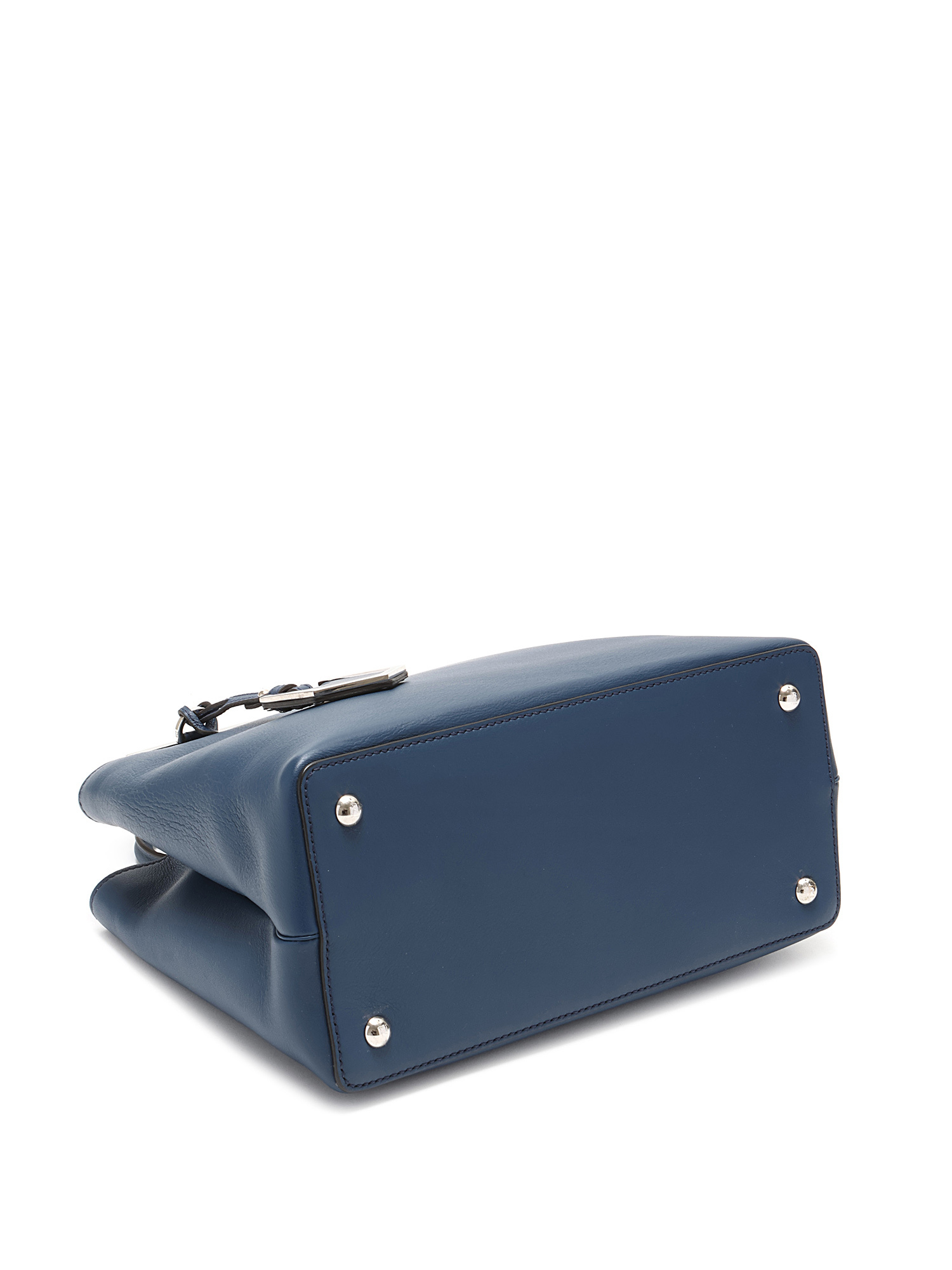Cabas en cuir élégant bleu marine avec des coutures ton sur ton. Double poignées supérieures. Ferrures en métal effet argent. Avec dust bag.