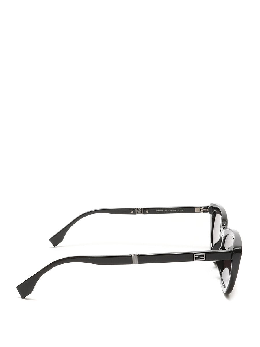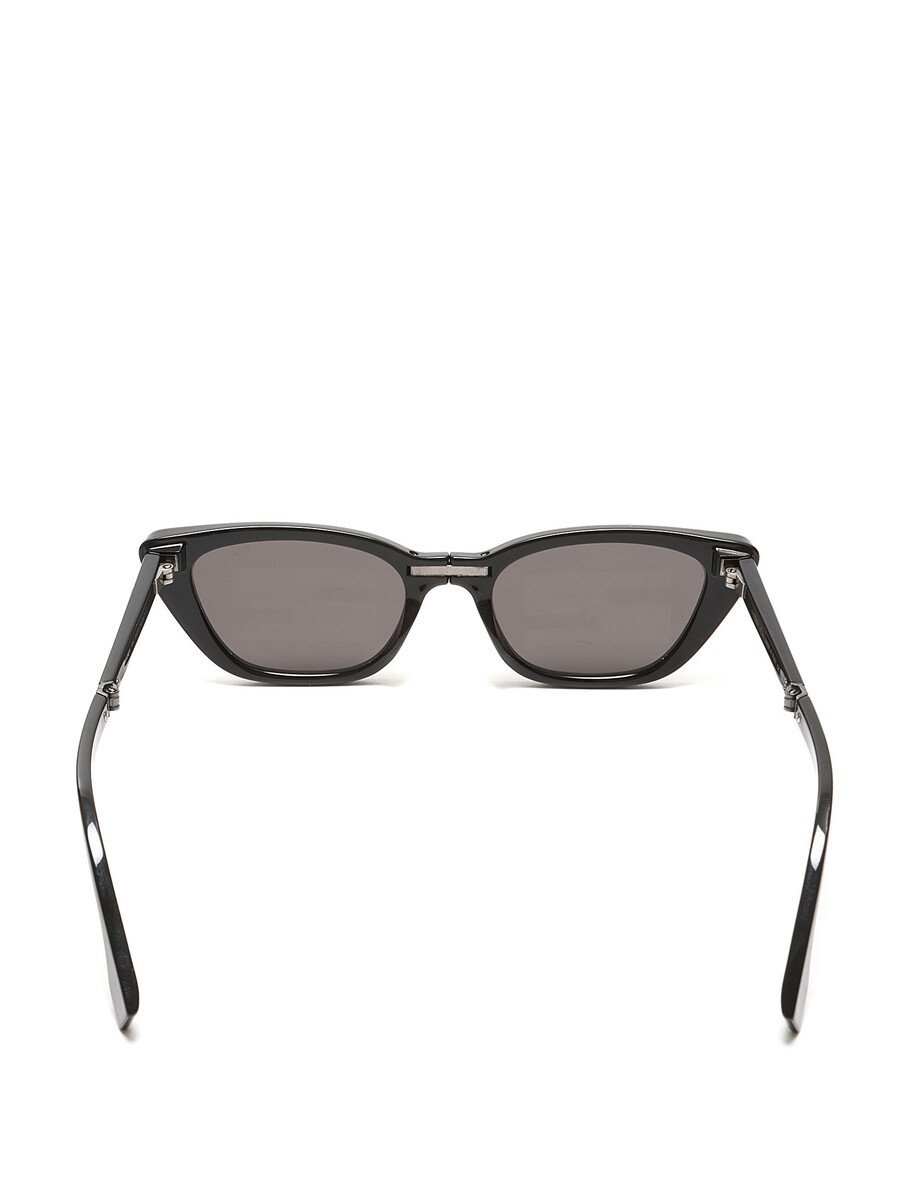 Lunettes de soleil repliables en acétate noir avec monture œil-de-chat. Logo discret sur les verres.