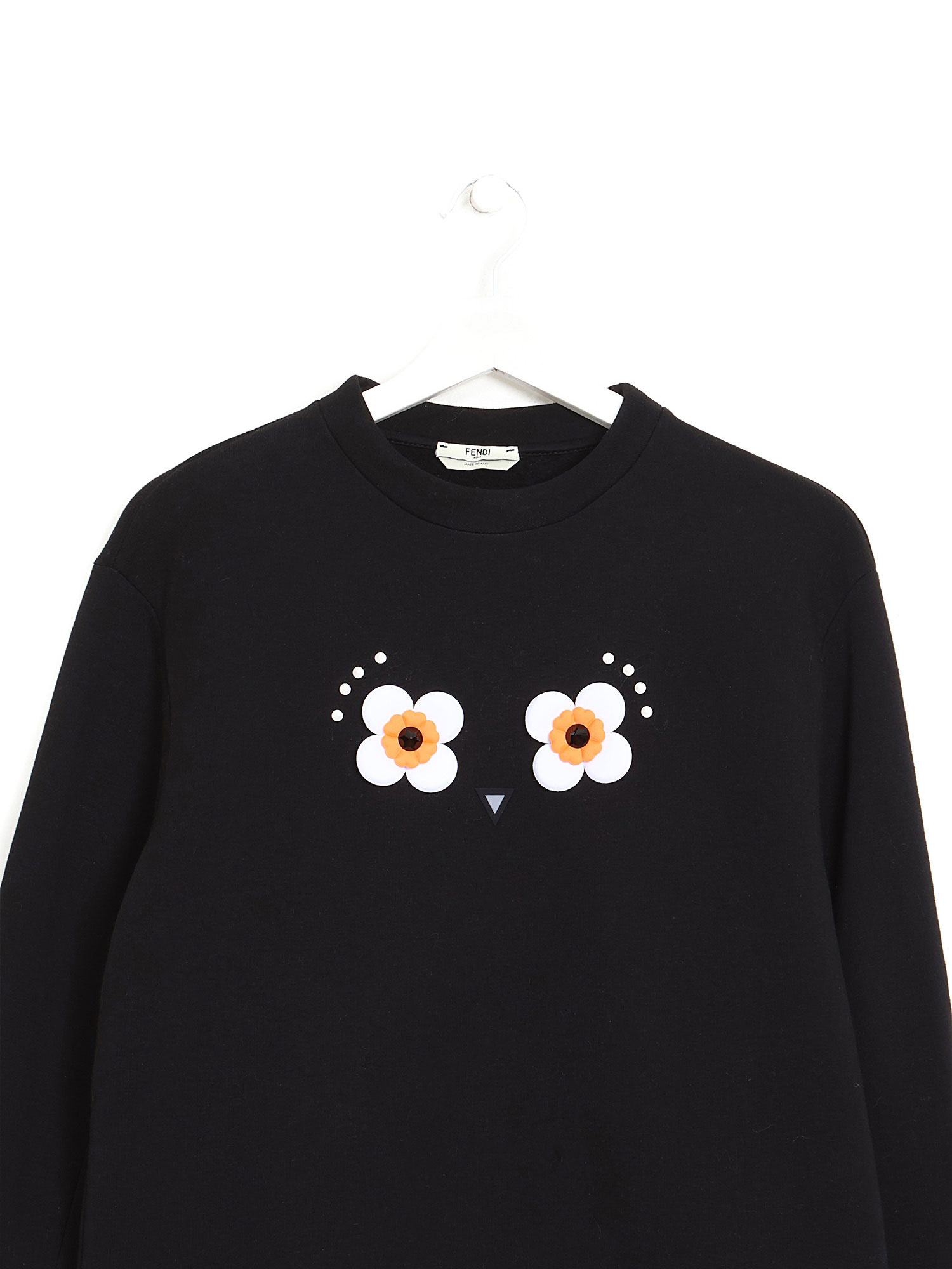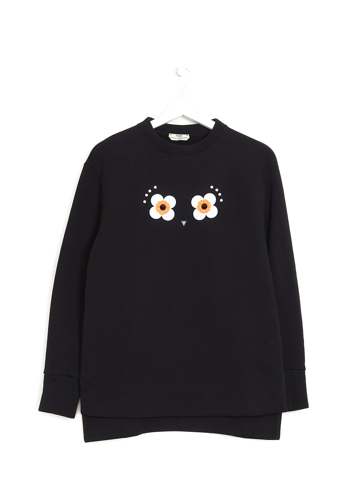 Pull noir à broderie florale avec un col rond. Toucher doux et confortable. Idéal pour superposer ou comme pièce maîtresse.