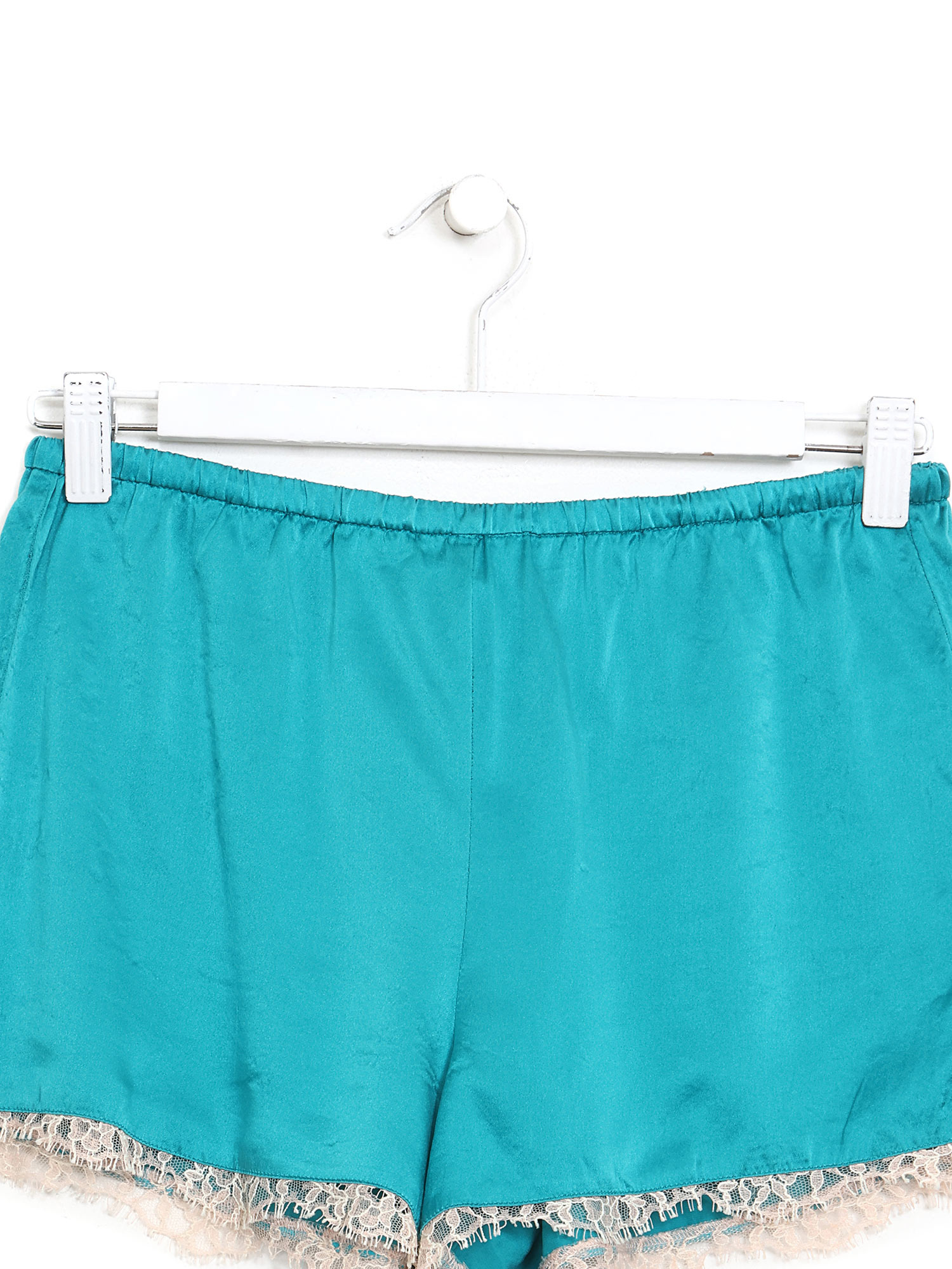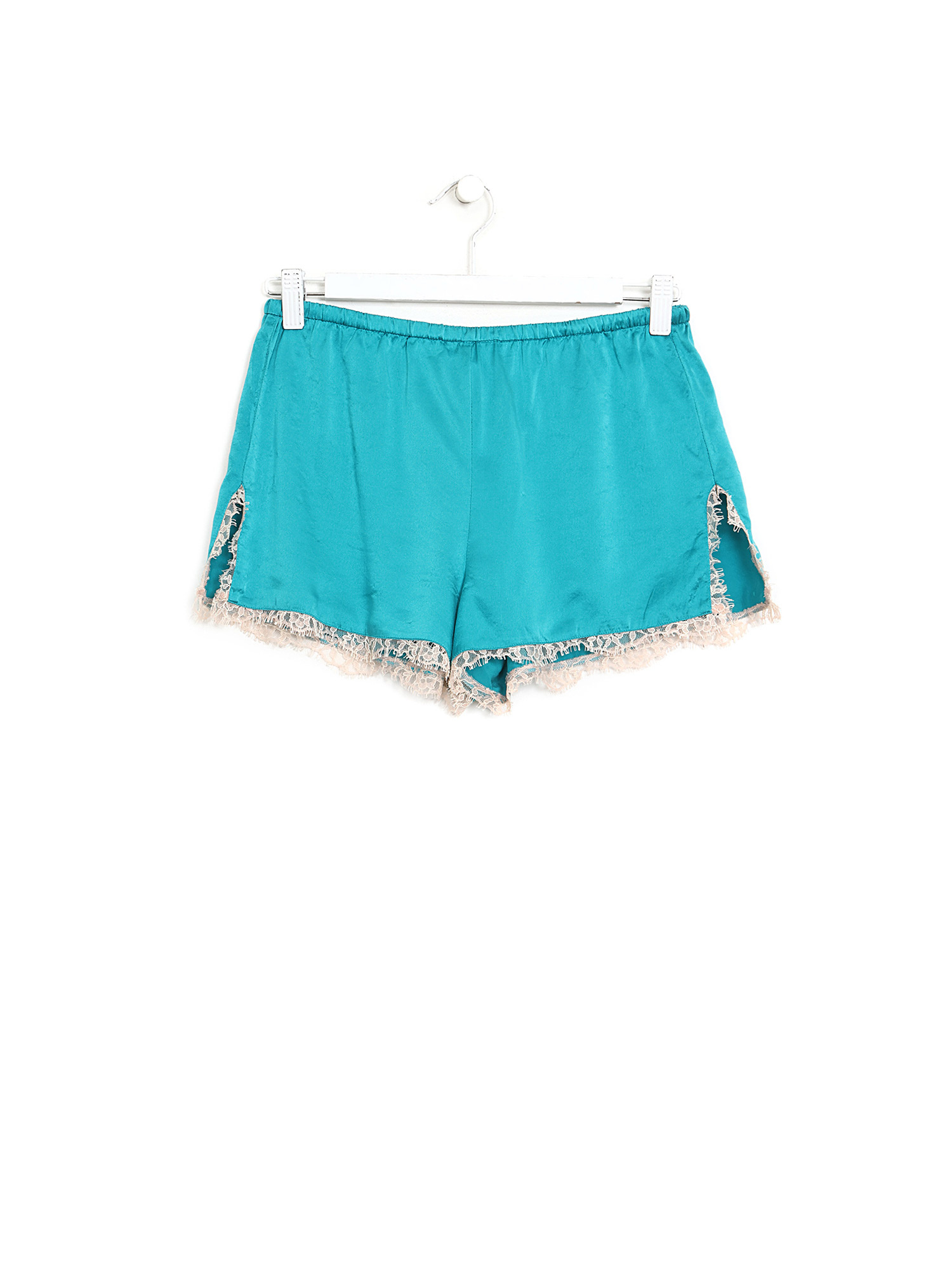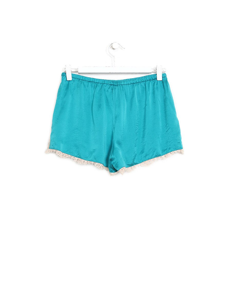 Short en soie turquoise avec taille élastique. Dentelle à l'ourlet.
