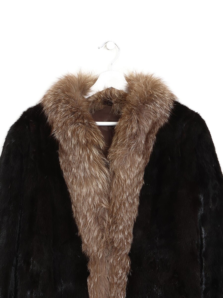 Manteau mi-long vintage en fourrure dans les tons de brun foncé et beige. Fermeture à crochets. Signes d'usure, fourrure tapée, crochet brisé.