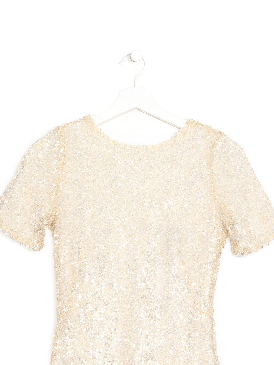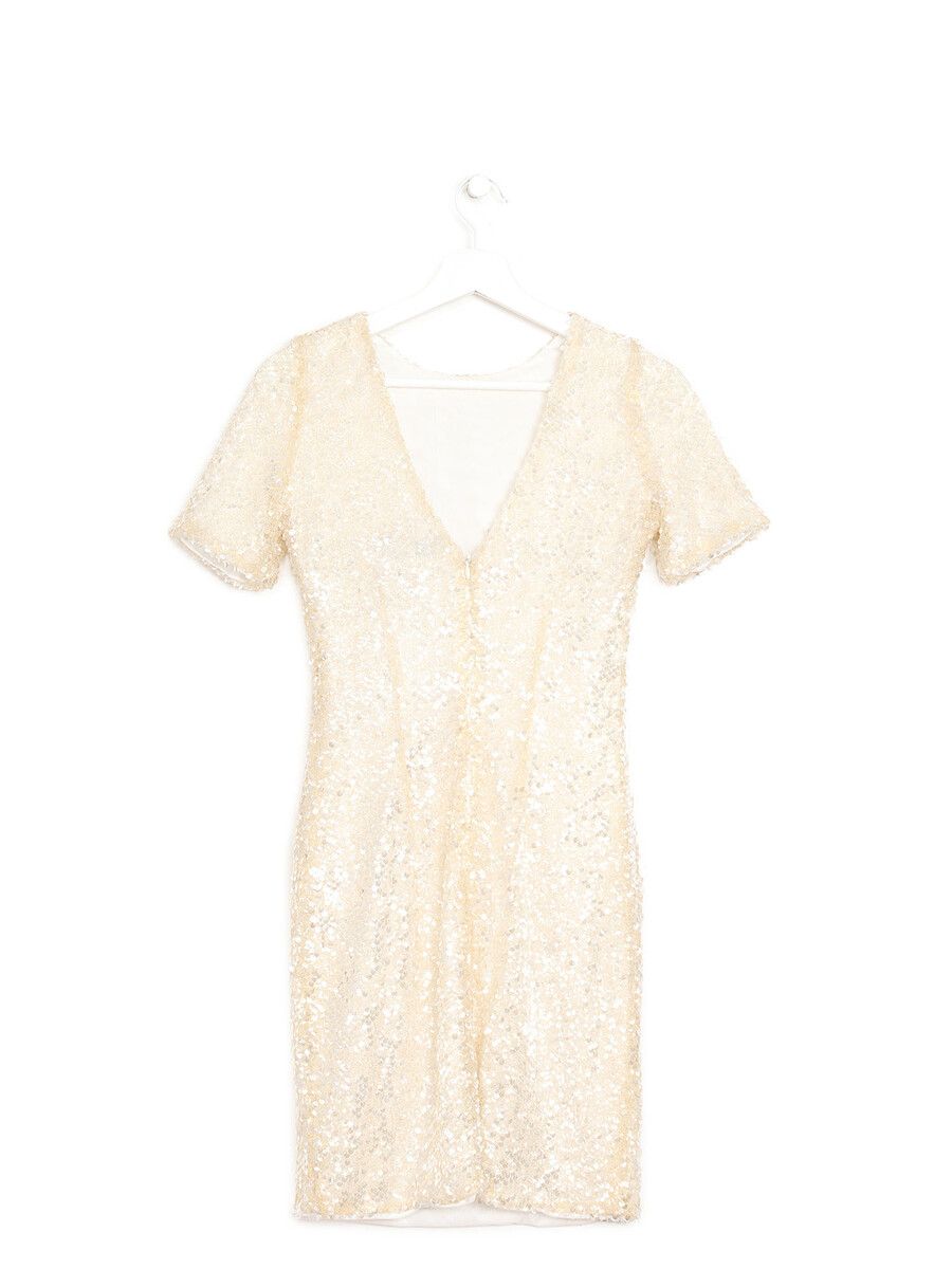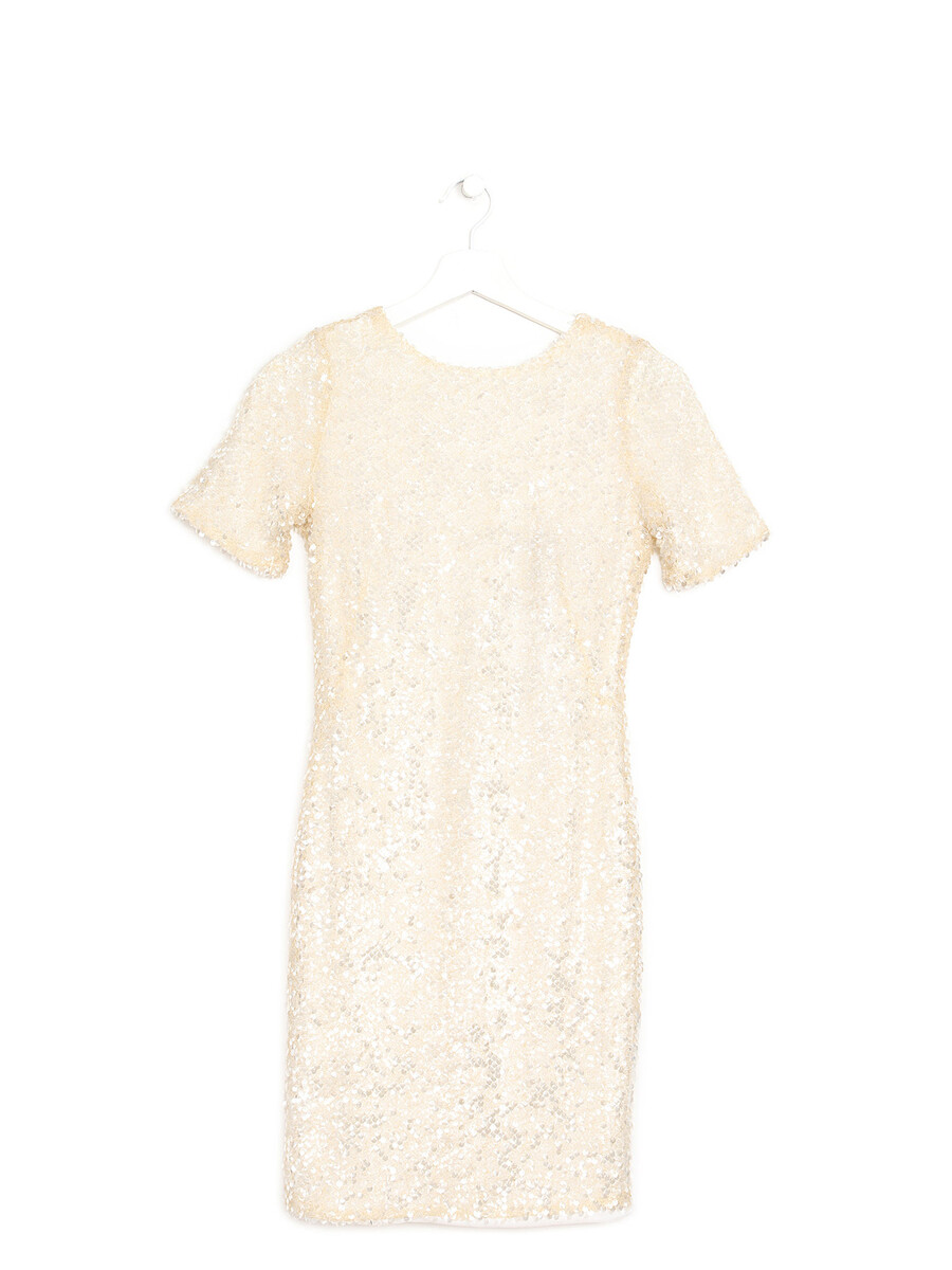 Robe mi-longue à paillettes dorées avec manches courtes. Col rond. Fermeture éclair au dos. Finition scintillante. Intérieur doublé.
