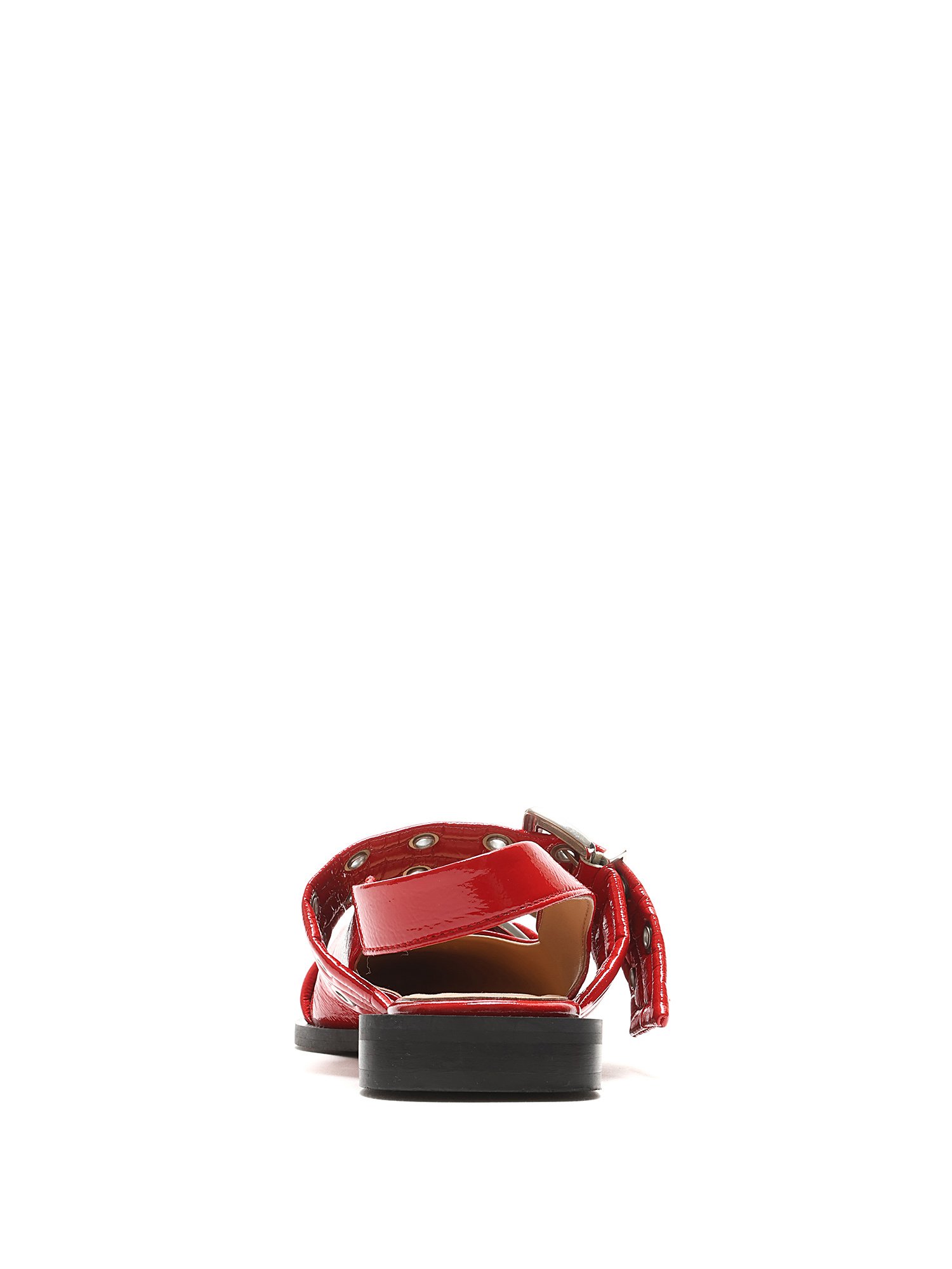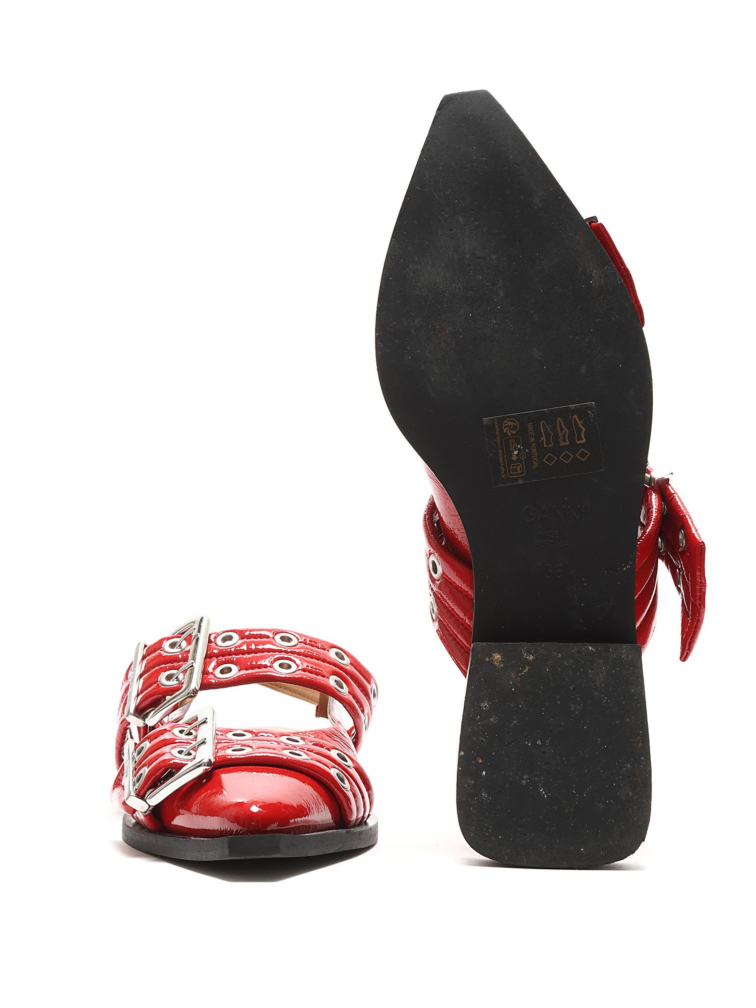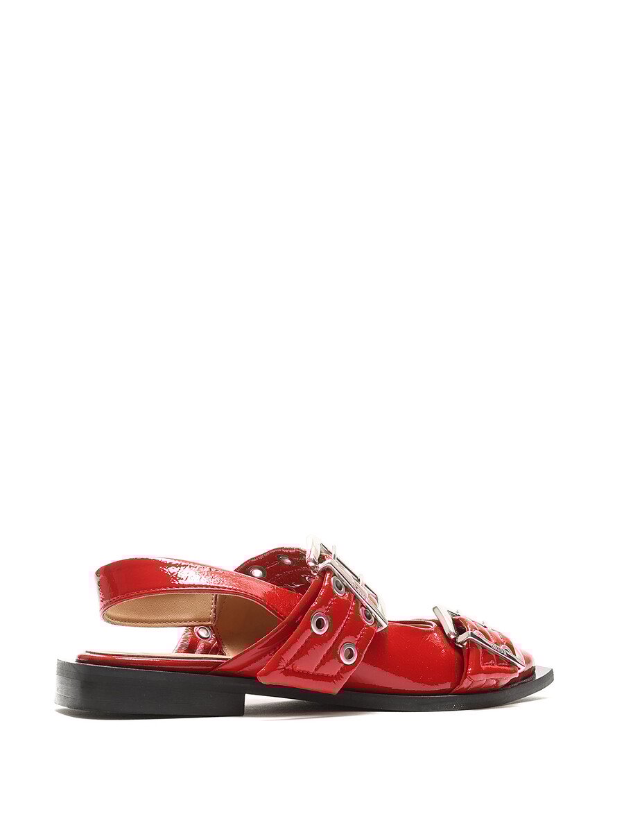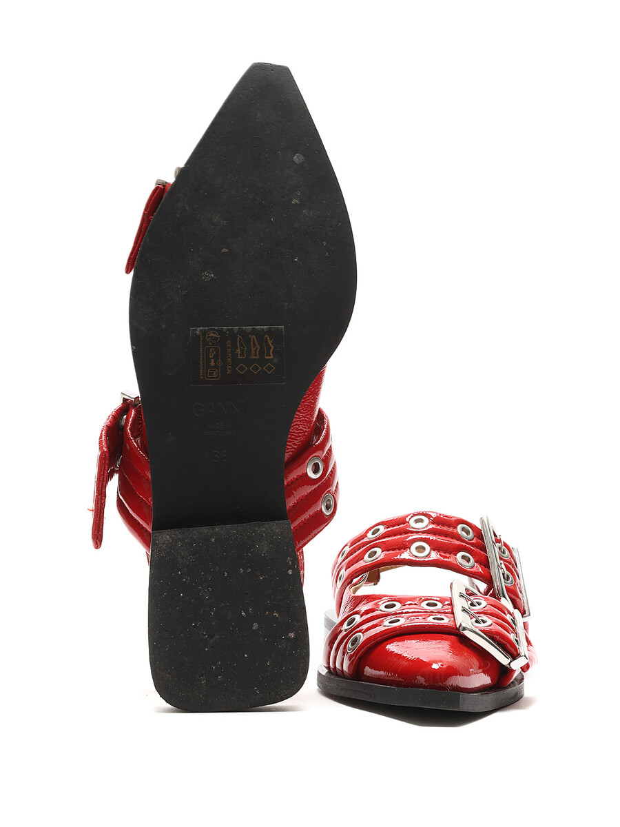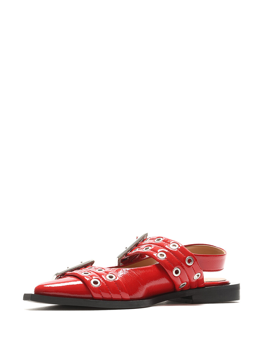 Ballerines en cuir verni à motif matelassé en rouge. Détails œillets. Fermeture à boucle. Bout pointu. Semelle plate en caoutchouc. Livré avec dust bag.