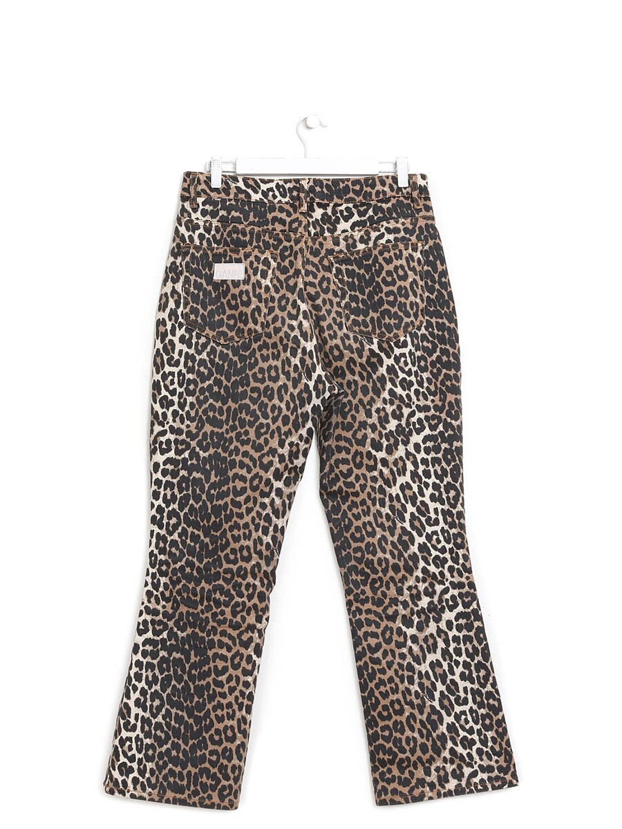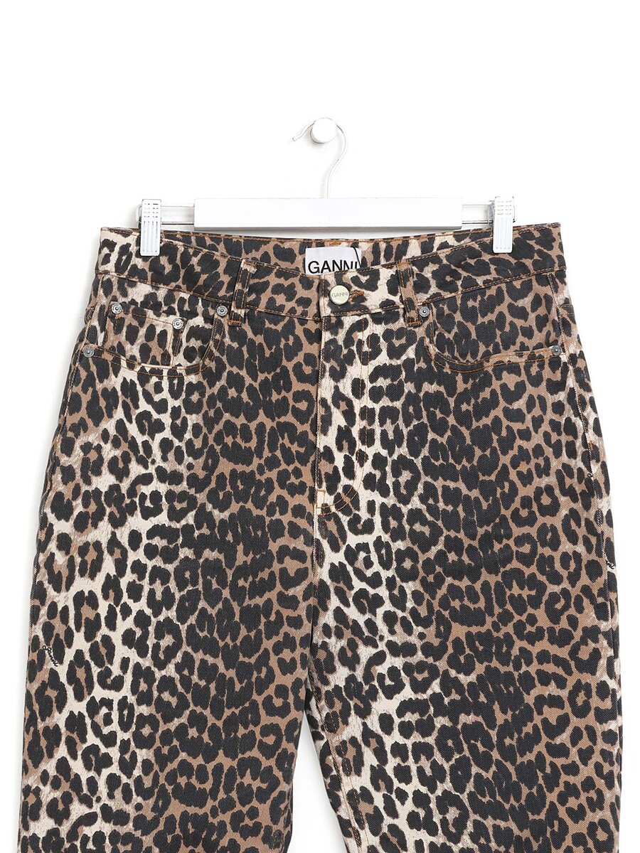 Jean à jambe droite en denim imprimé léopard audacieux. Design classique à cinq poches avec des surpiqûres ton sur ton. Confectionné en coton biologique pour une mode durable.