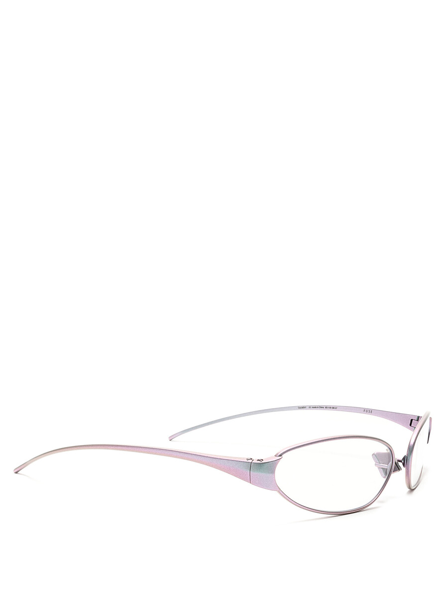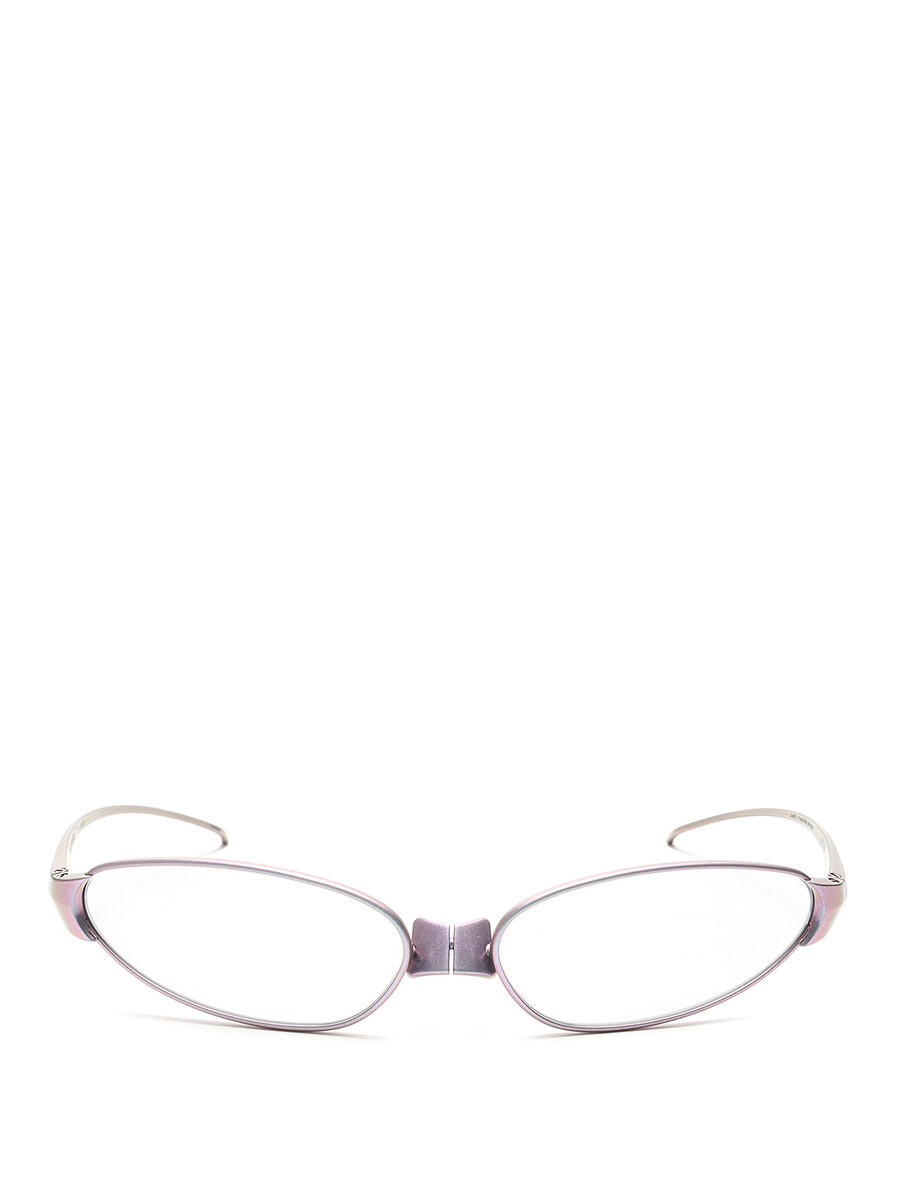Lunettes avec monture en métal argenté et design de pont nasal unique. Les verres bloquent la lumière bleue et 99,9% des rayons UV.