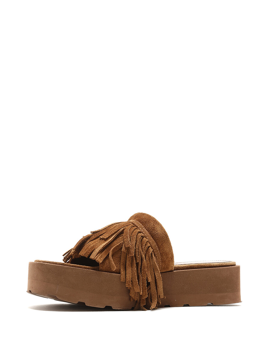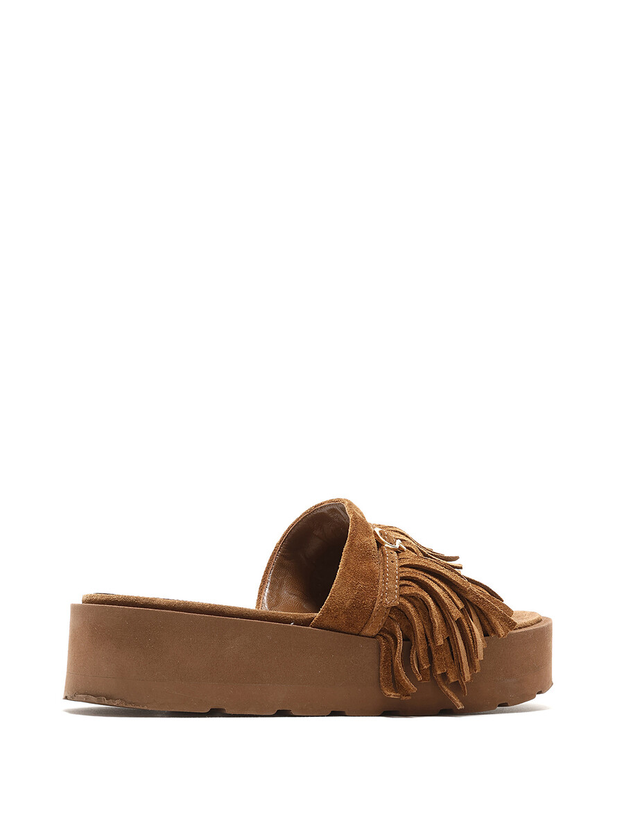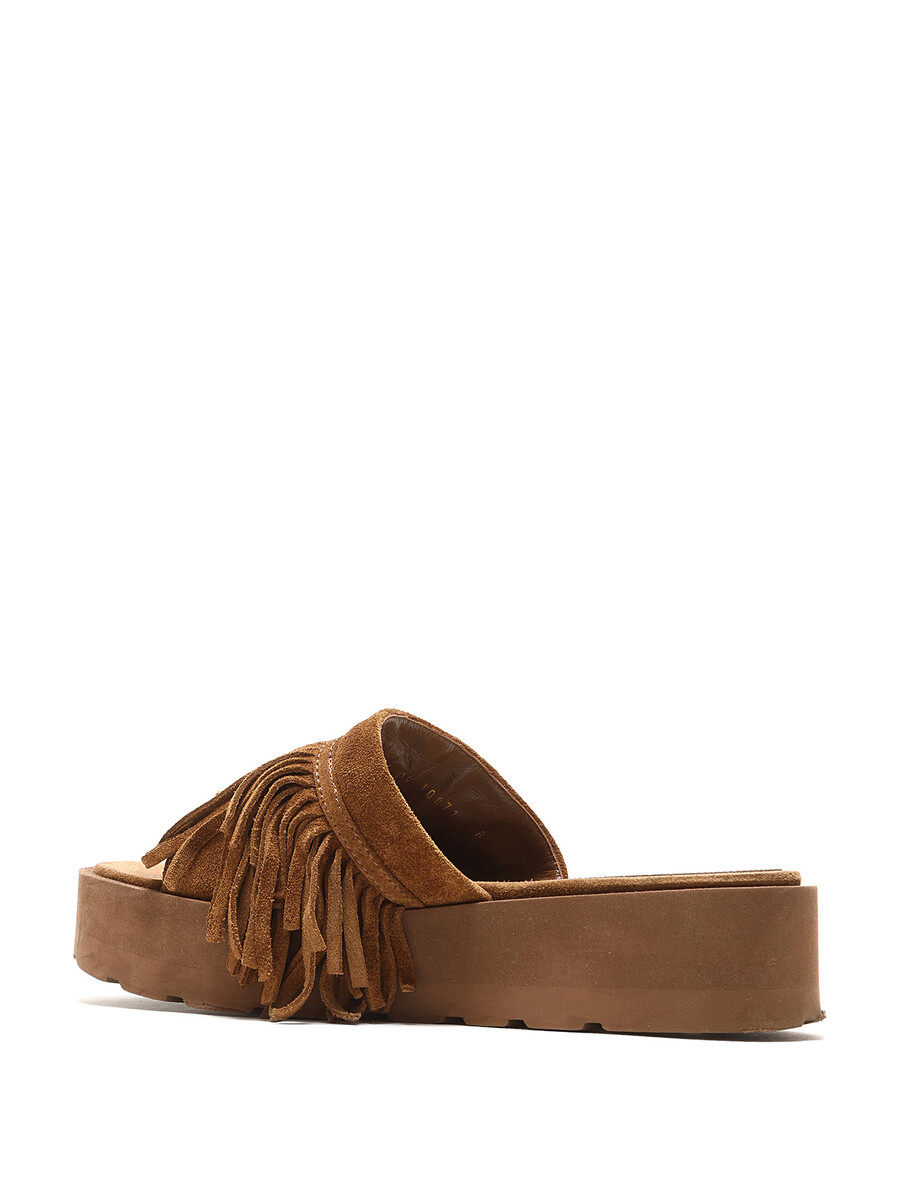 Sandales en suède brun avec détails à franges et bout ouvert. Semelle plateforme en caoutchouc.