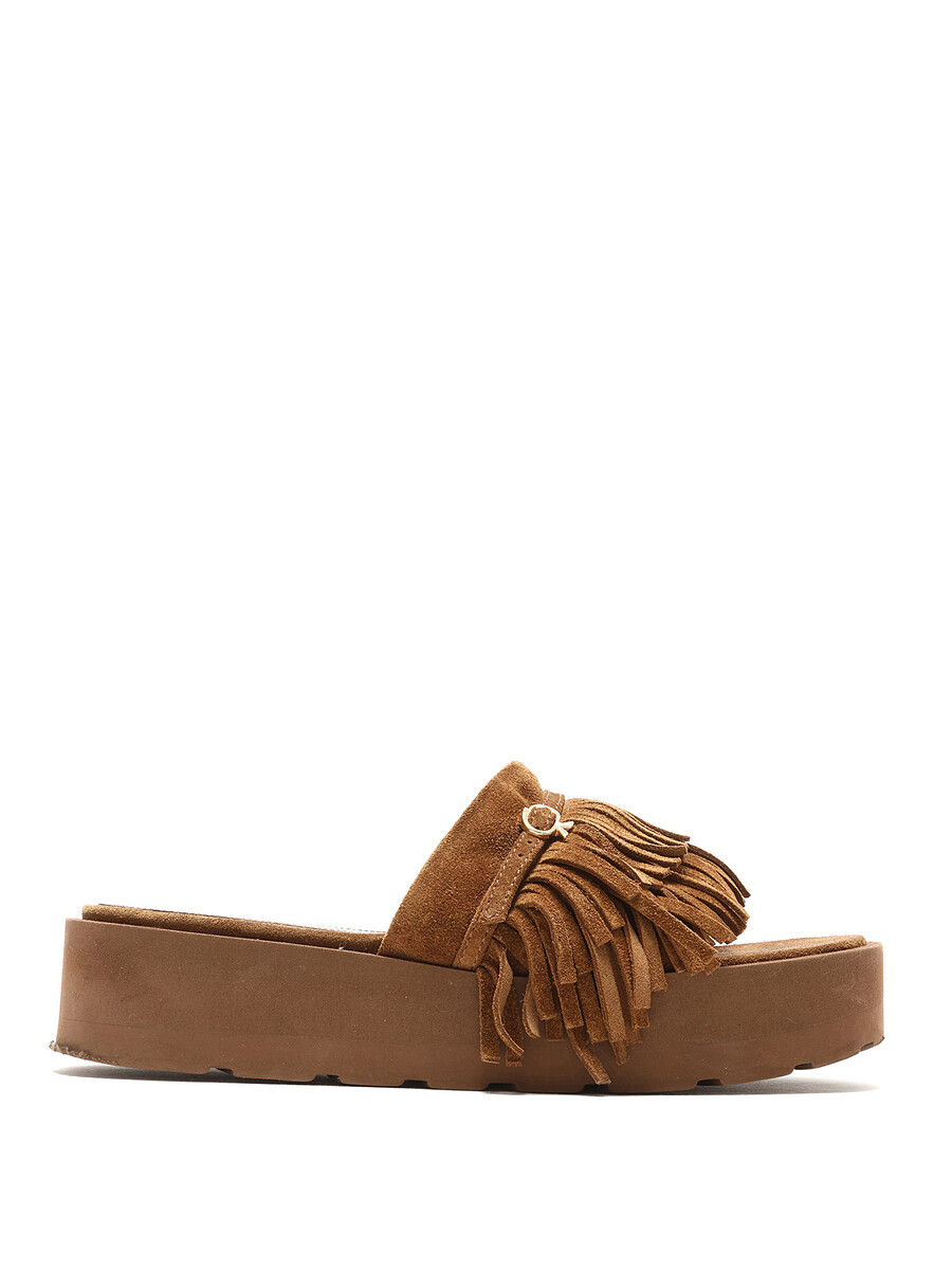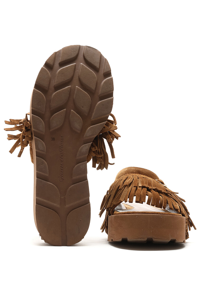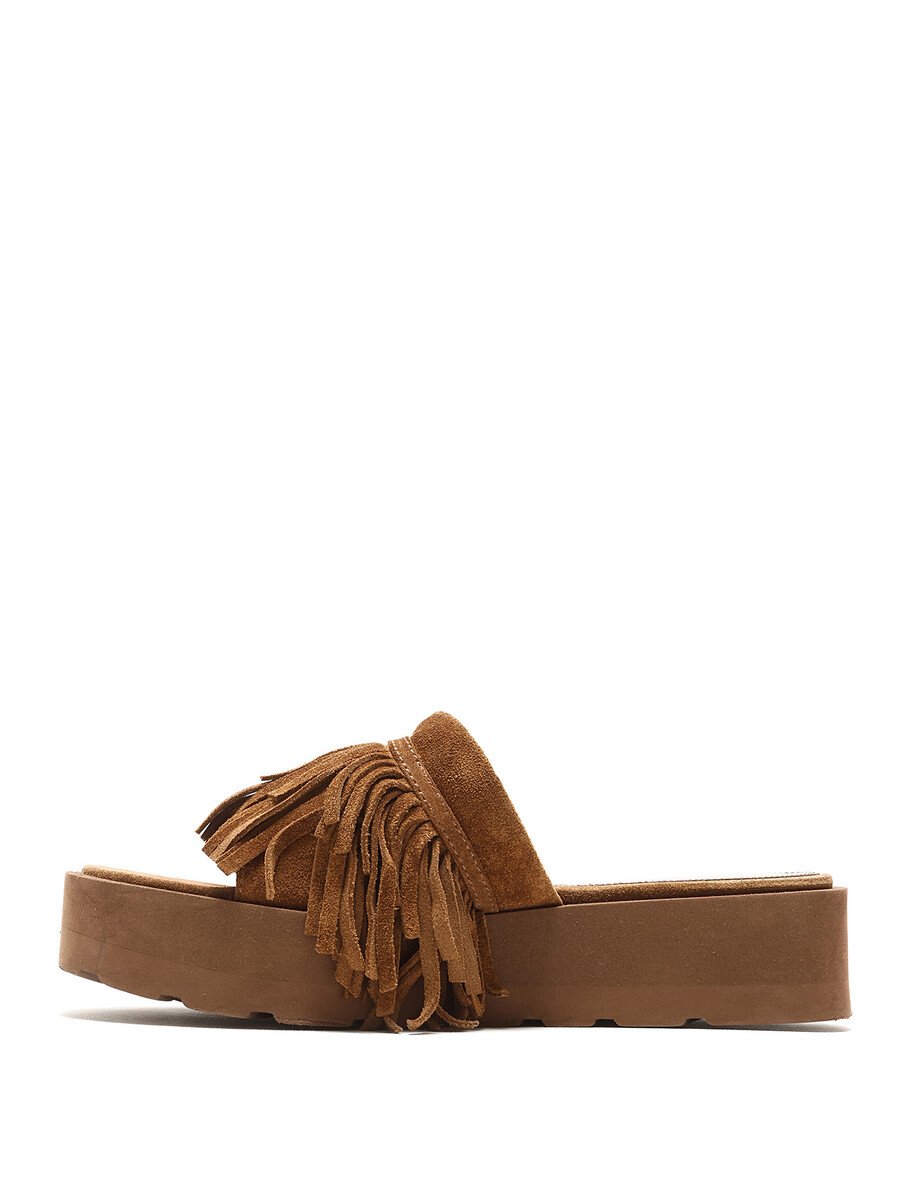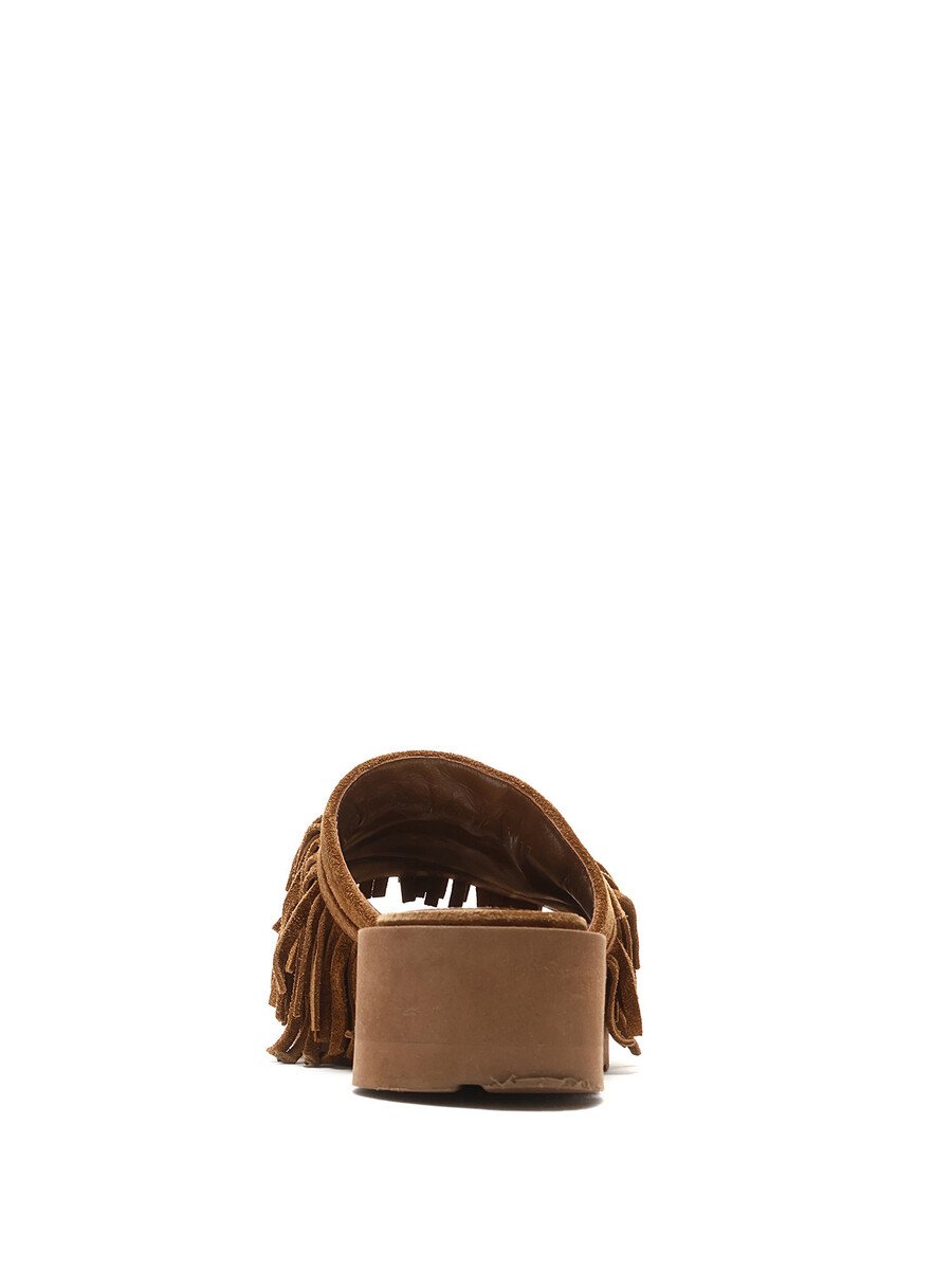 Sandales en suède brun avec détails à franges et bout ouvert. Semelle plateforme en caoutchouc.