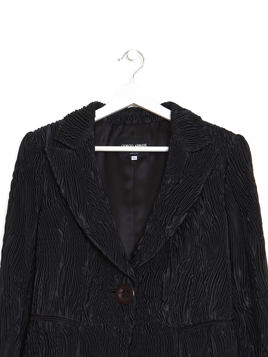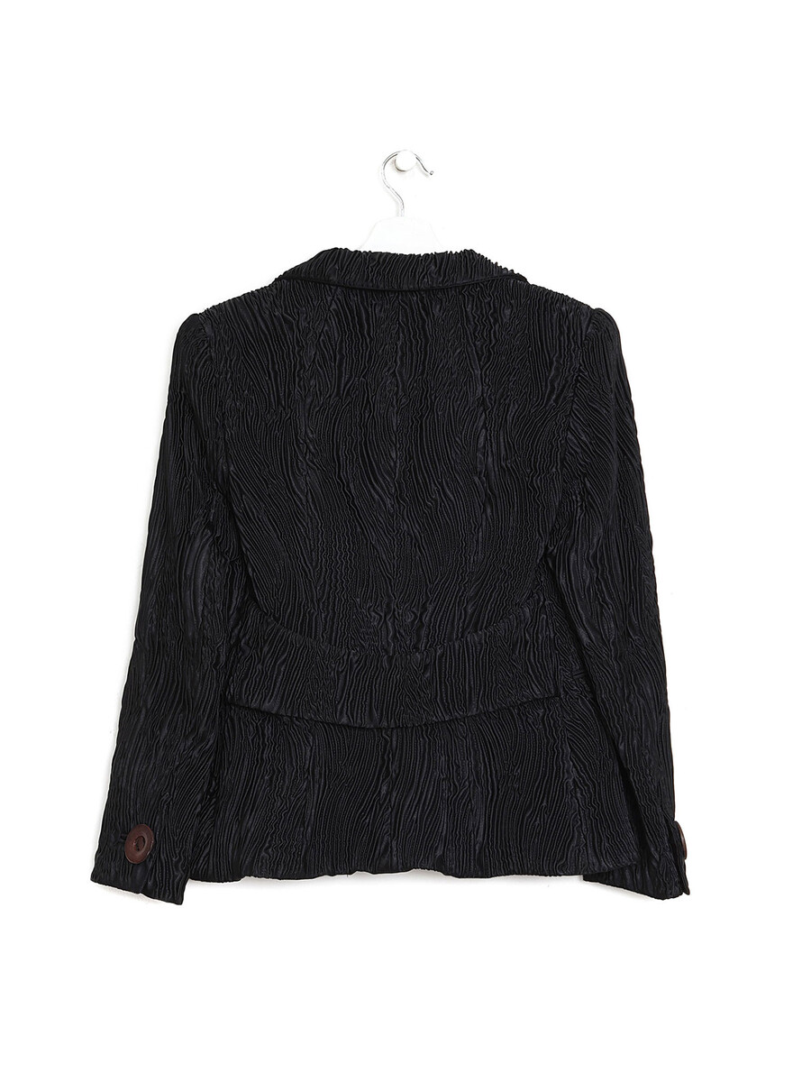 Blazer à manches longues noir à texture géométrique avec col à revers. Fermeture à boutons. Épaules structurées et silhouette ajustée.