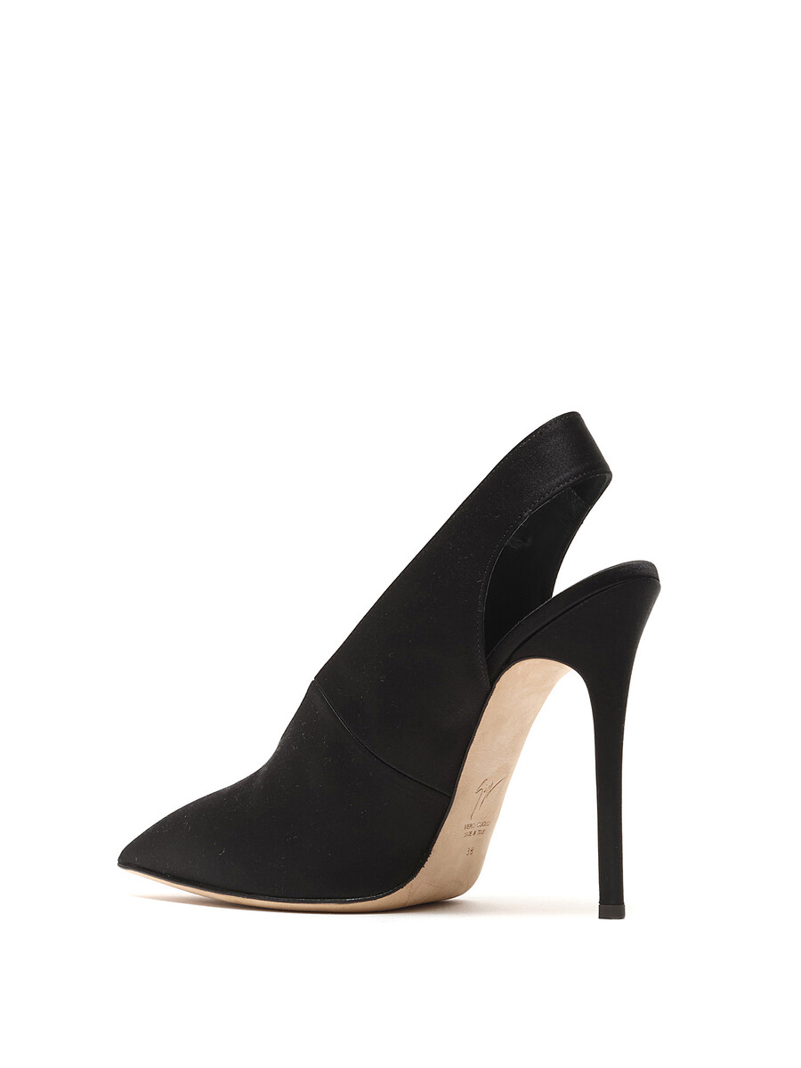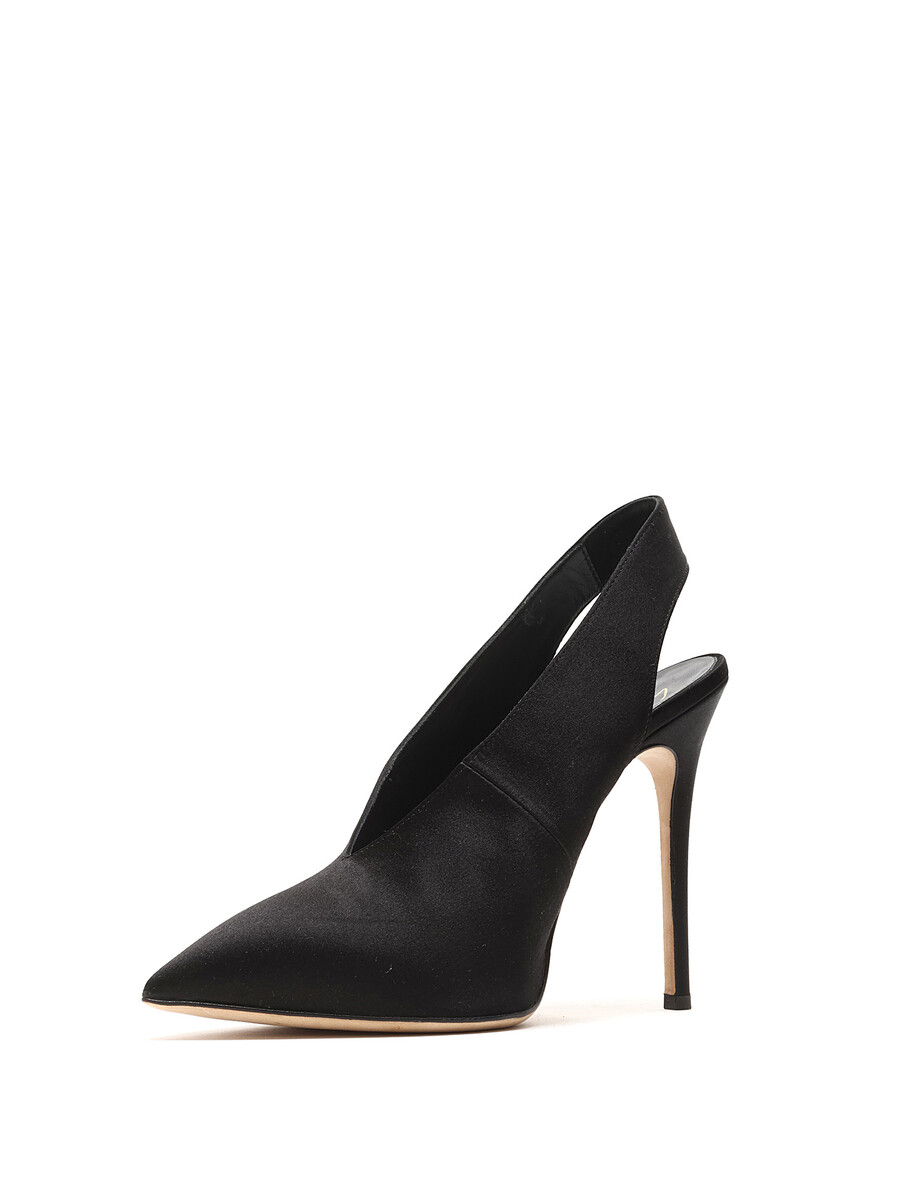 Escarpins en satin noir à bout pointu avec bride à l'arrière. Talon aiguille. Semelle en cuir.