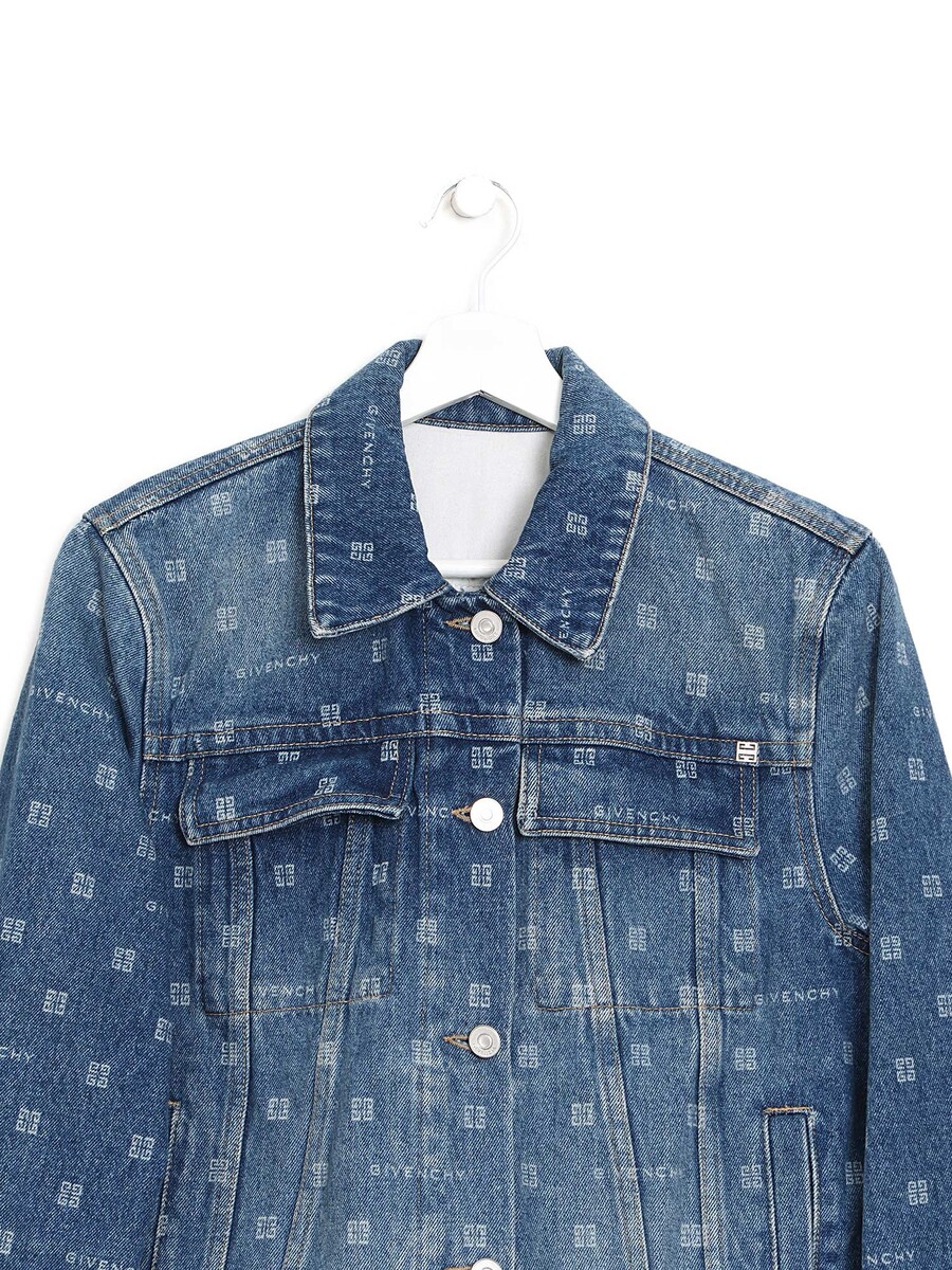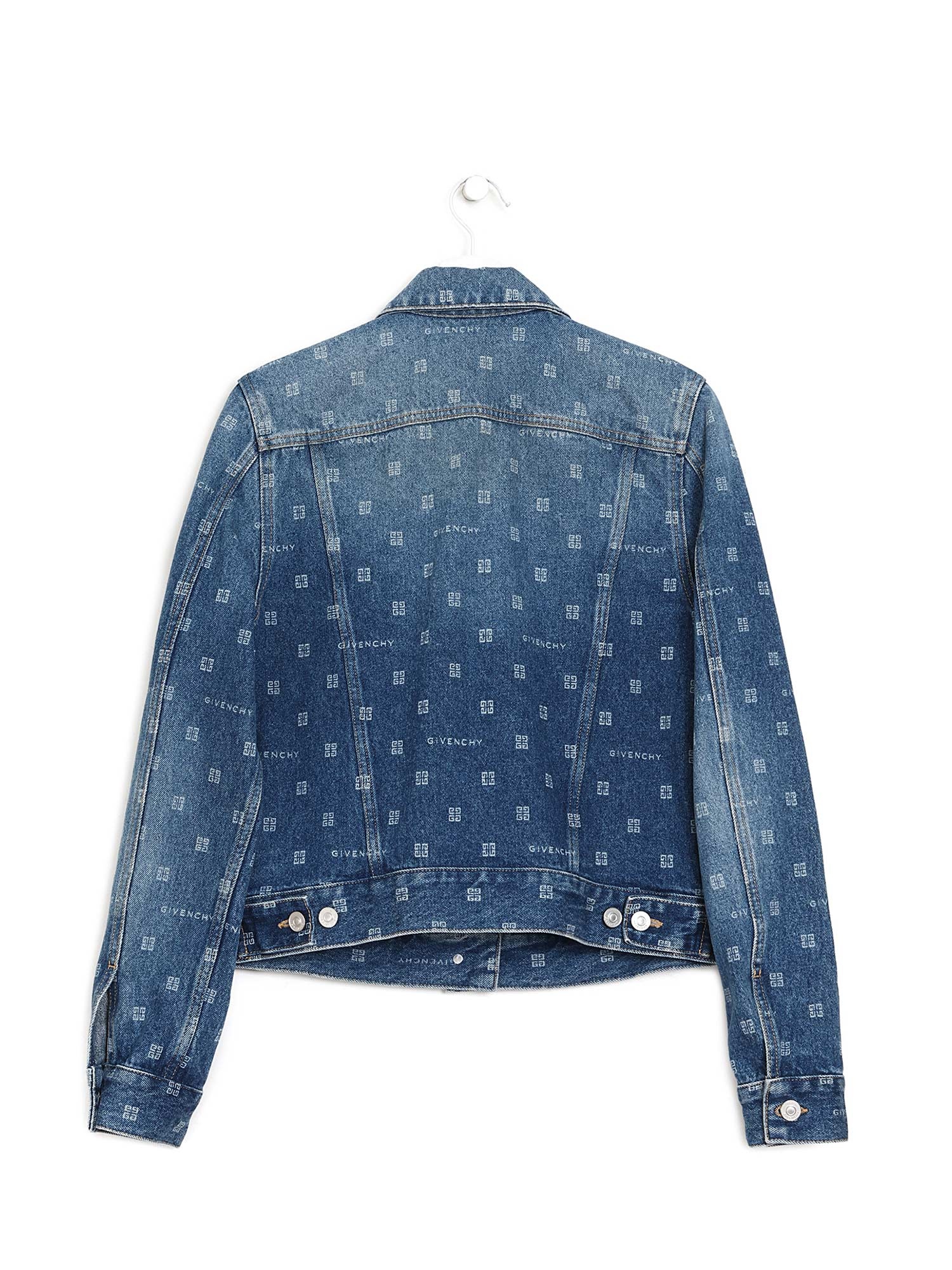 Veste en denim à motif géométrique dans des tons de bleu et blanc. Fermeture à boutons devant. Col de chemise. Quatre poches. État usé avec signes d'utilisation.