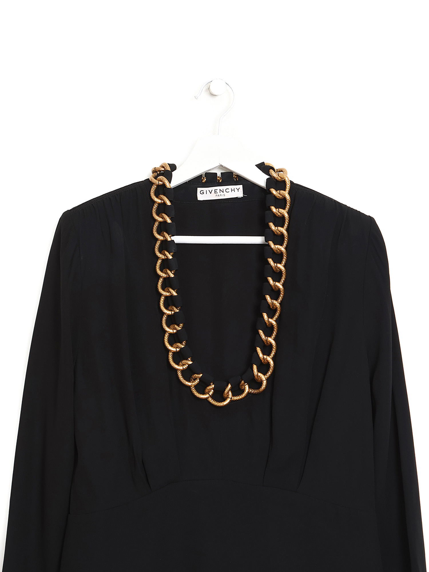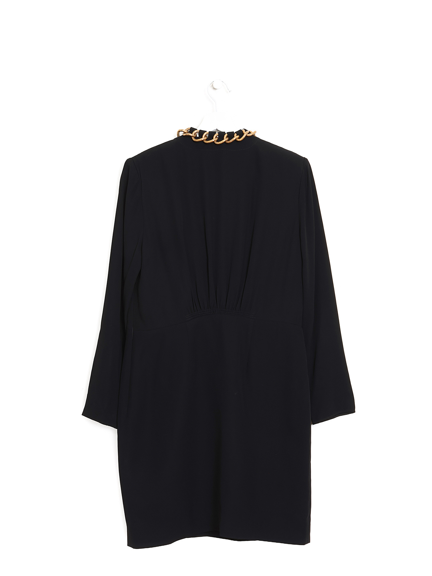 Robe midi noire à manches longues. Détail de chaîne distinctive au col. Silhouette épurée.