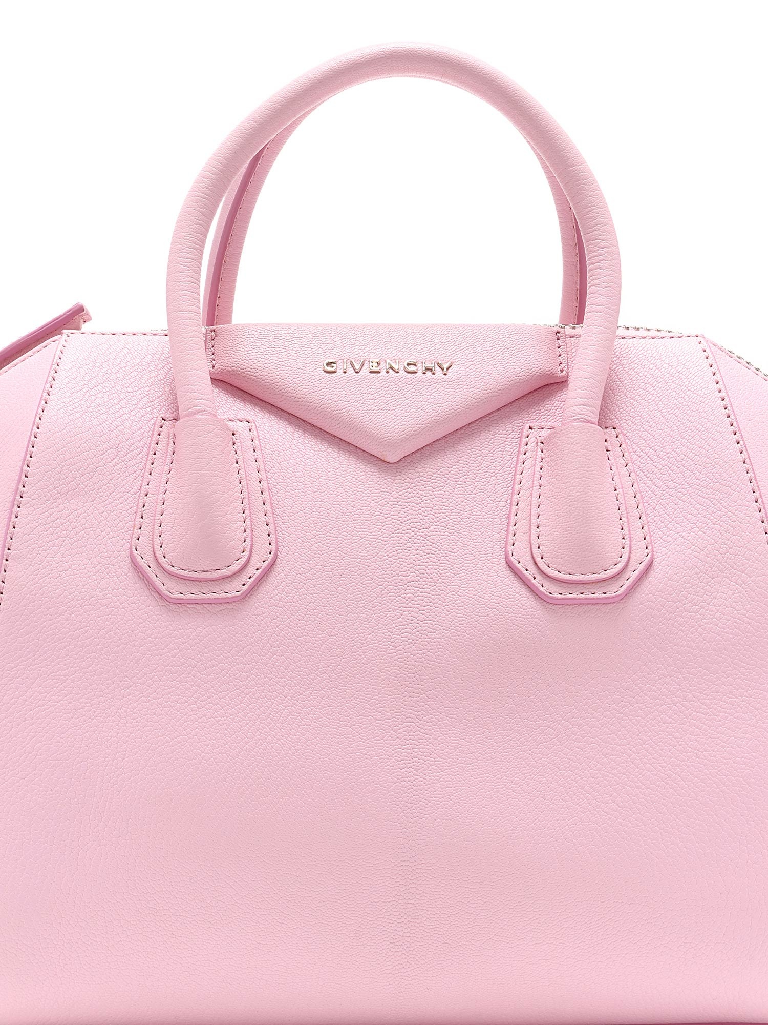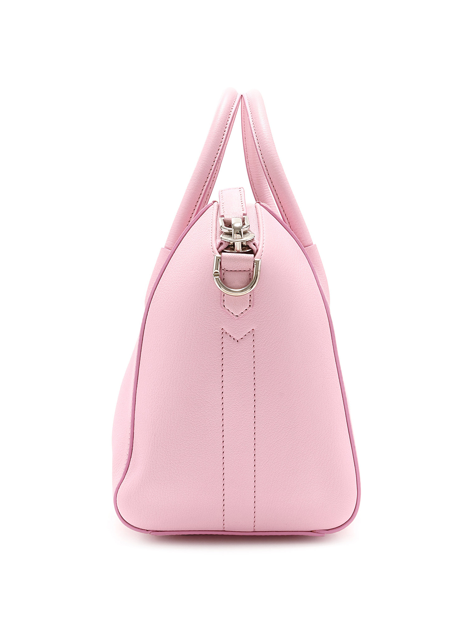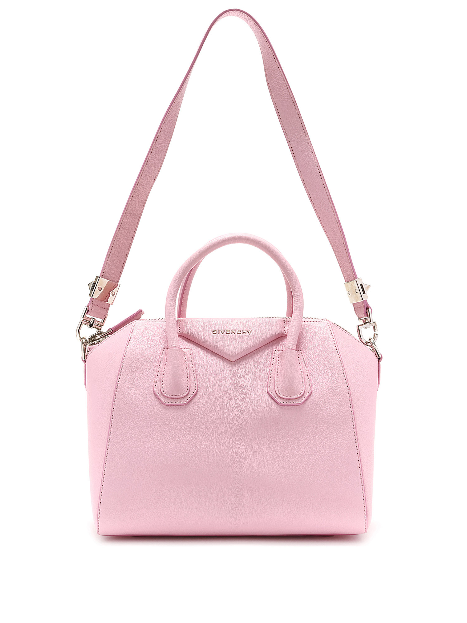 Sac à main en cuir rose vibrant. Logo Givenchy iconique en relief. Fermeture éclair sur le dessus. Compactes poignées au dessus et bandoulière amovible. Ferrures argentées et garnitures en cuir. Fournie avec son dust bag.