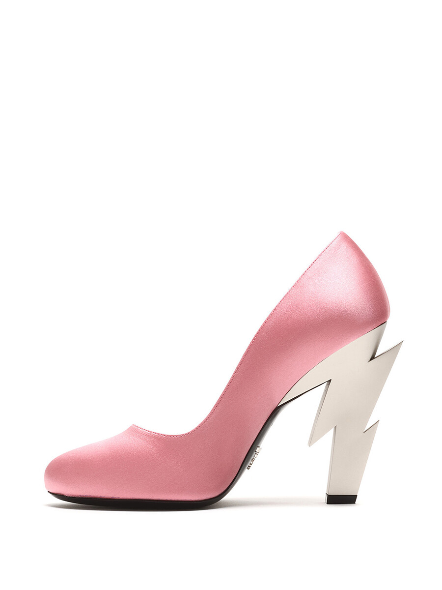 Escarpins en satin avec un talon en forme d'éclair en métal argenté. Style bout rond. Semelle en cuir. Avec boîte.