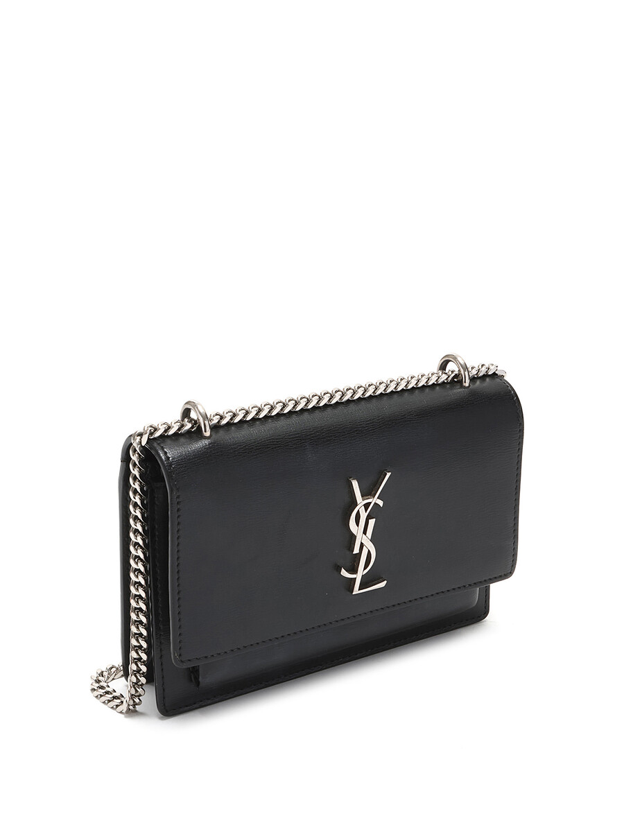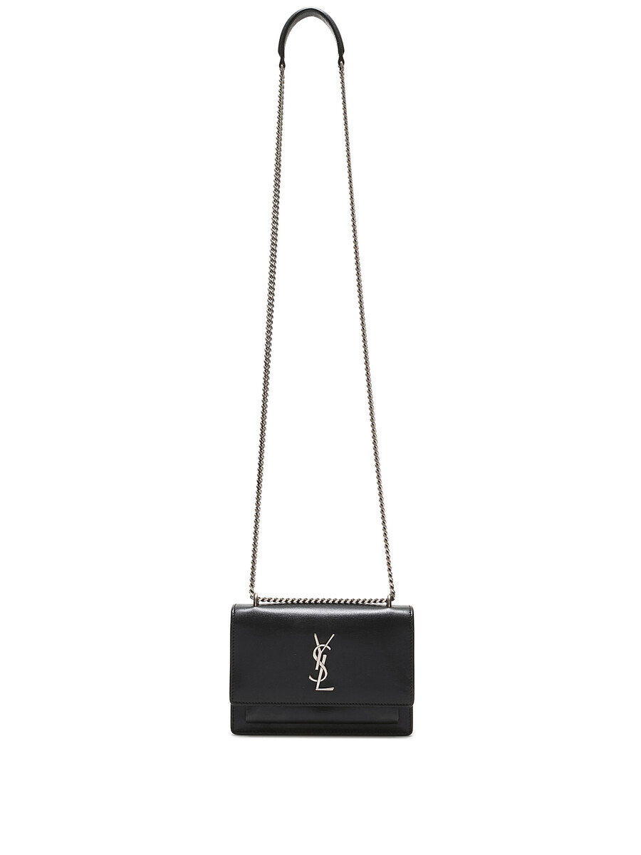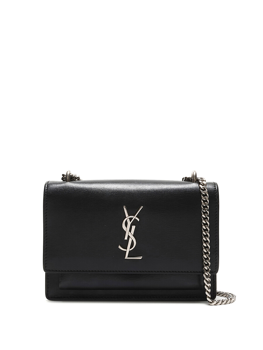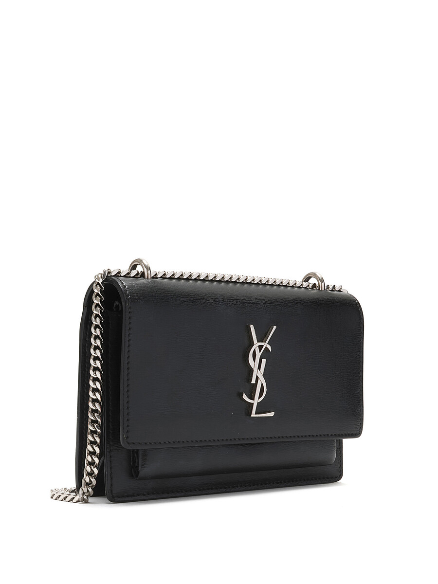 Mini sac à bandoulière en cuir noir avec logo Cassandre. Fermeture à clapet magnétique. Bandoulière à chaîne argentée avec patin d’épaule en cuir.