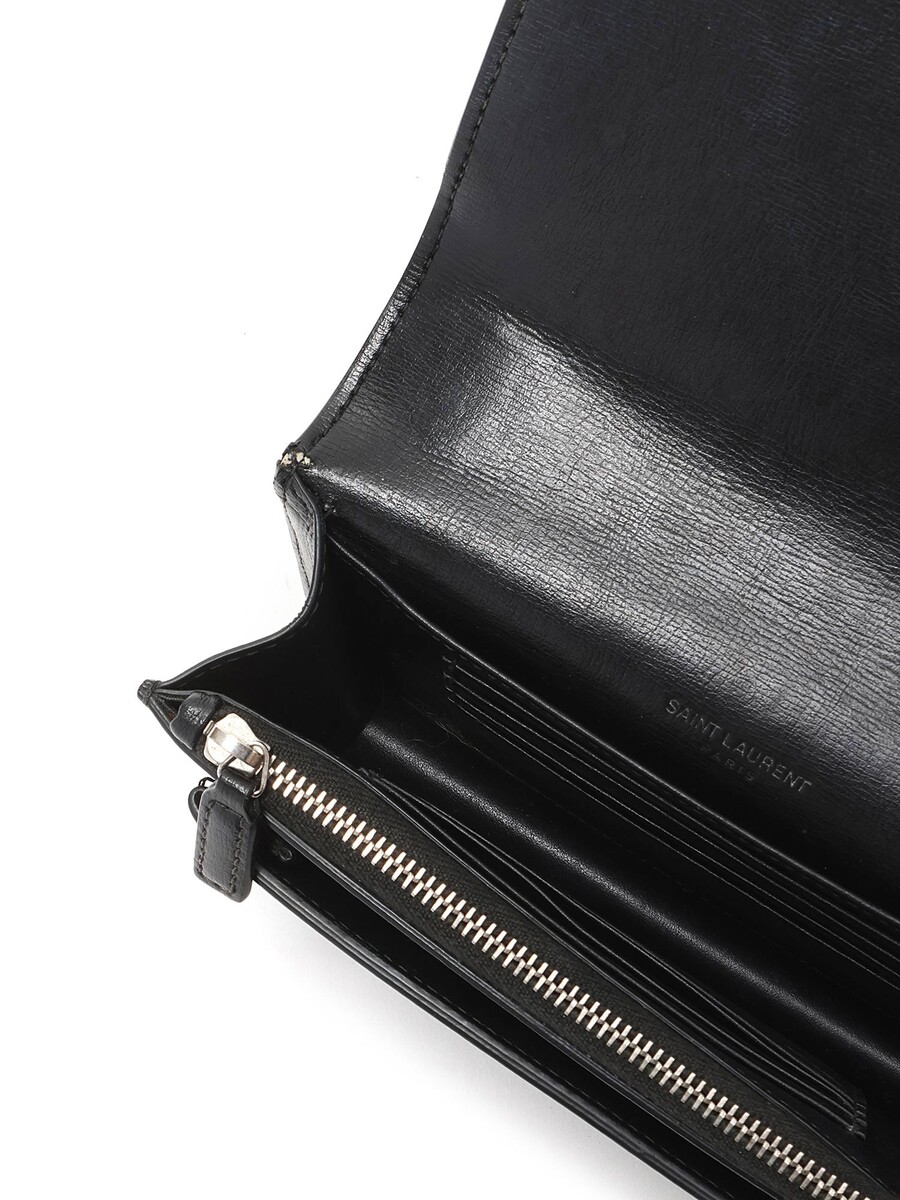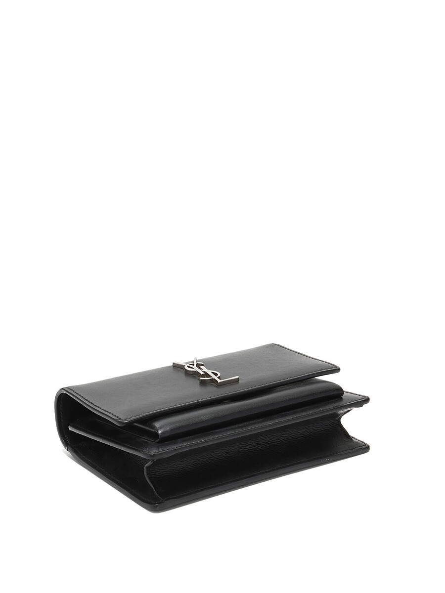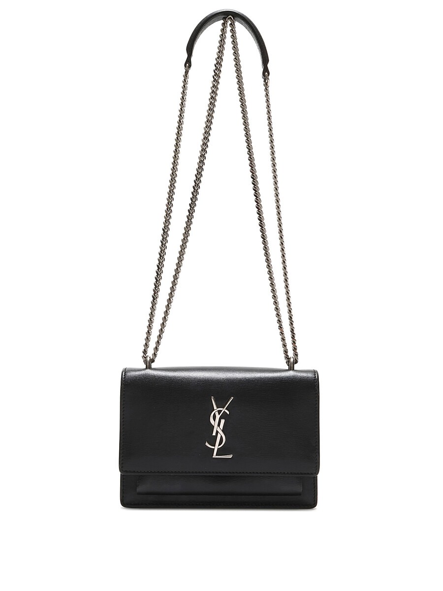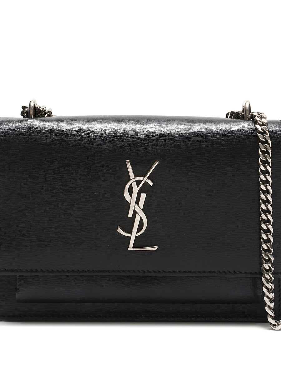 Mini sac à bandoulière en cuir noir avec logo Cassandre. Fermeture à clapet magnétique. Bandoulière à chaîne argentée avec patin d’épaule en cuir.