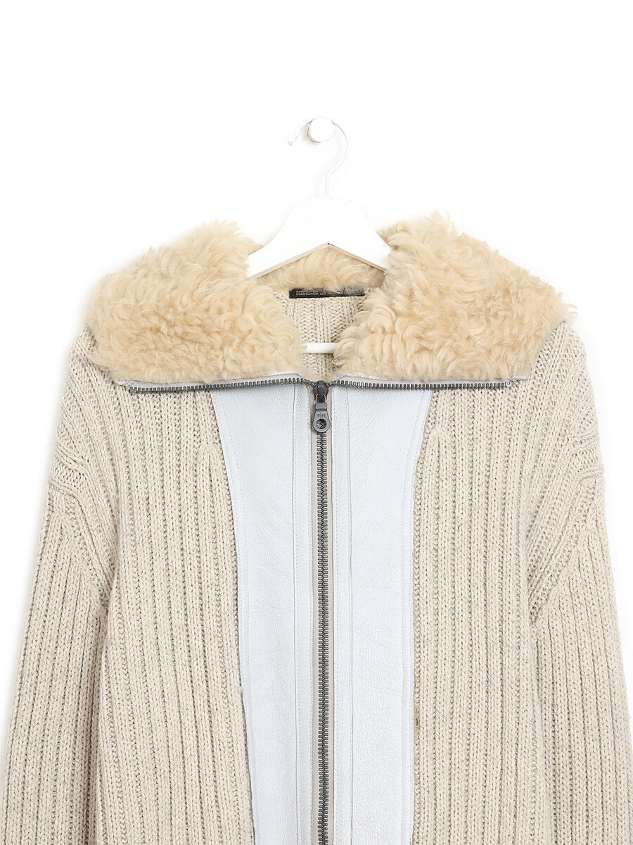 Cardigan de tricot côtelé à capuche en crème avec doublure en peau retournée. Détail de fourrure bouclée au revers du col. Fermeture à glissière en métal gris acier.