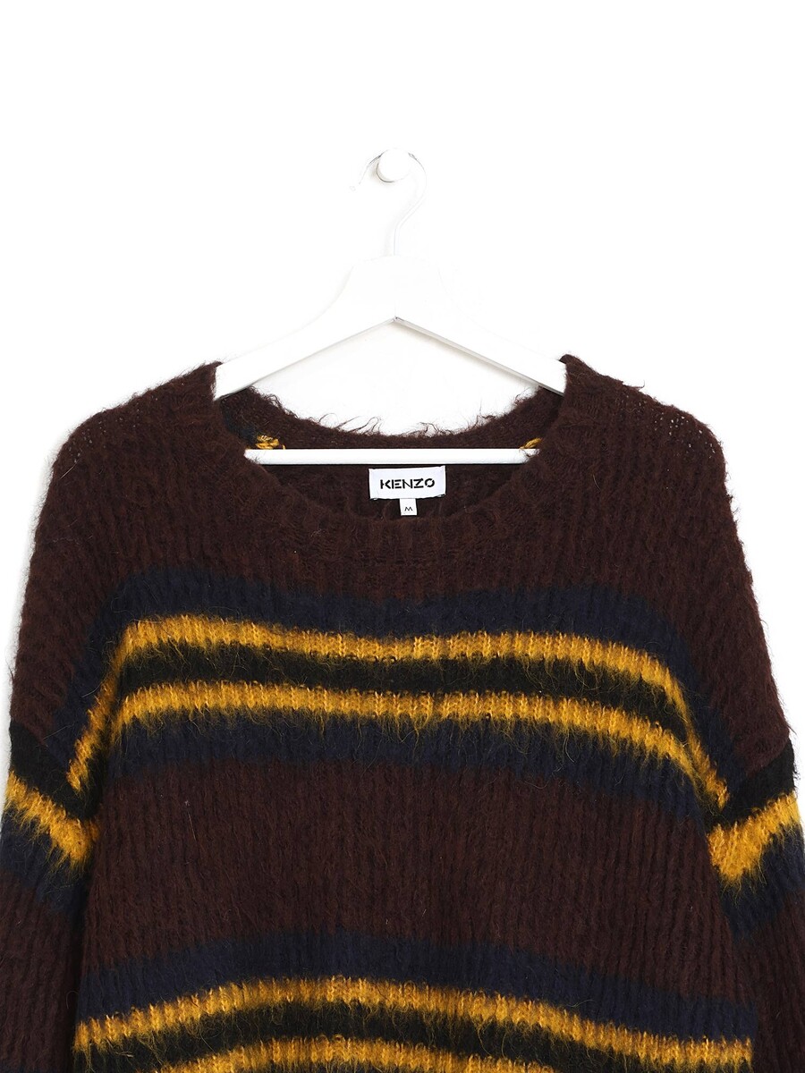 Pull à manches longues en tricot de poil court brun avec rayures noires et jaunes. Col rond.