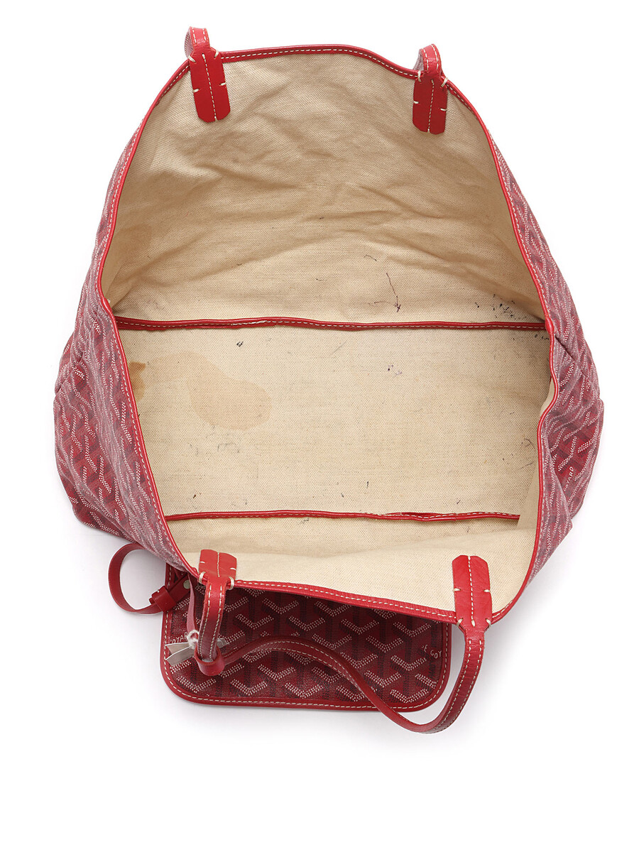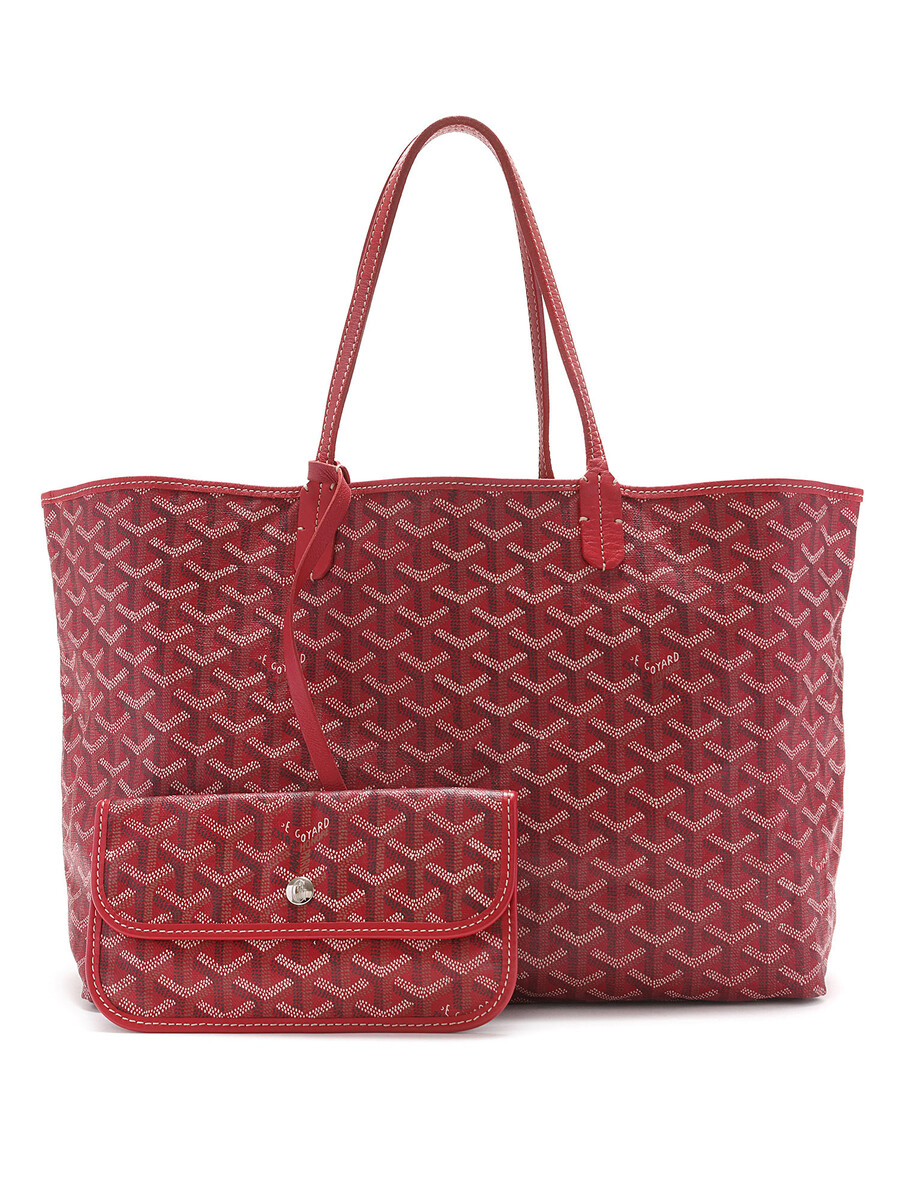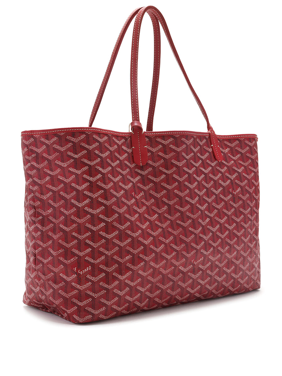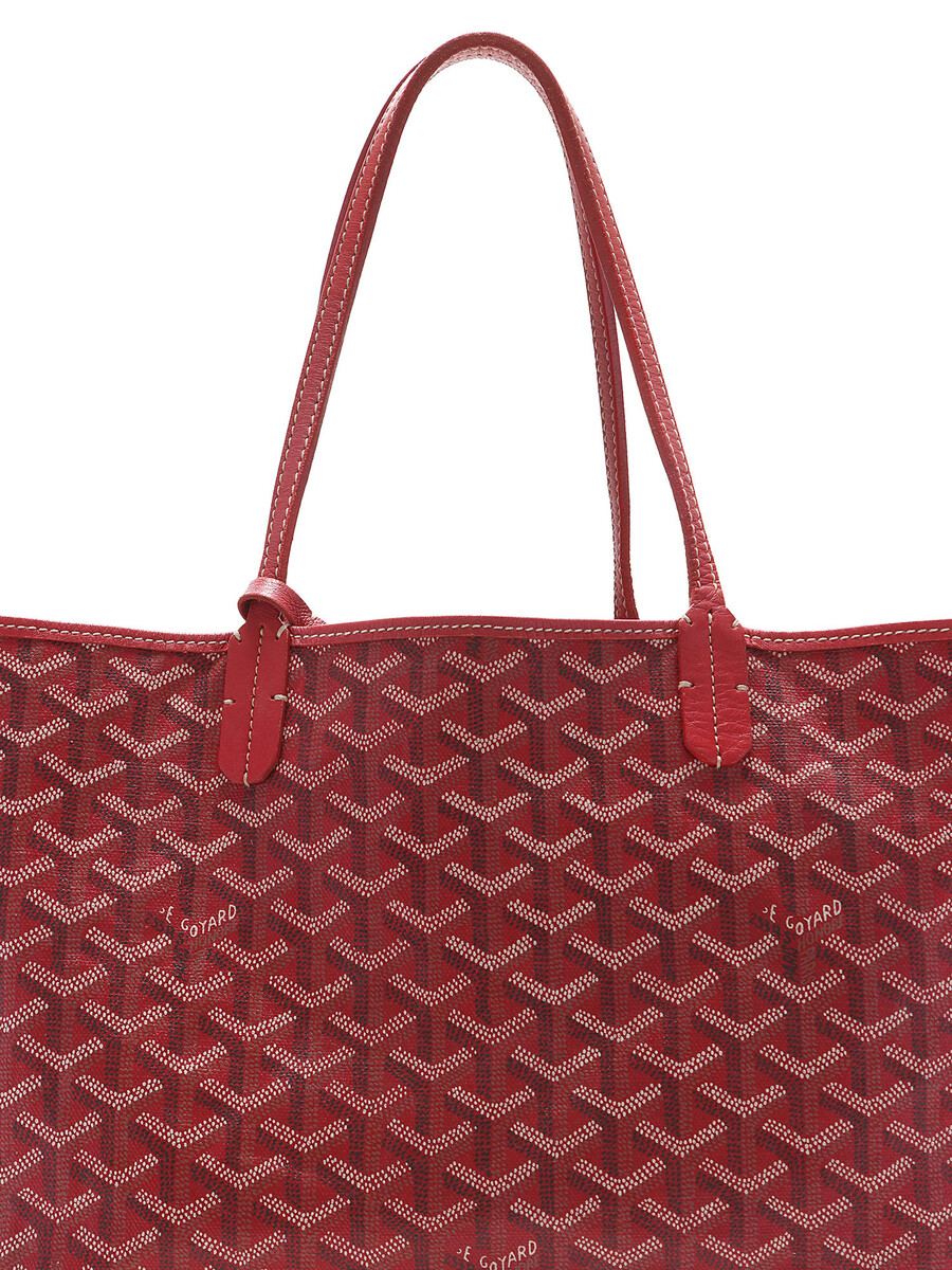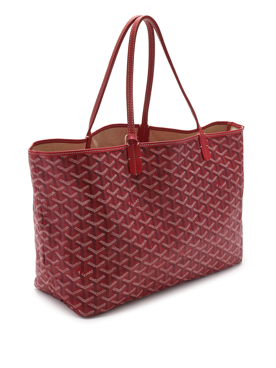 Sac cabas en toile enduite avec motif Goyardine en rouge, blanc et gris. Doubles poignées en cuir. Garnitures en cuir. Avec pochette amovible à l'intérieur.
