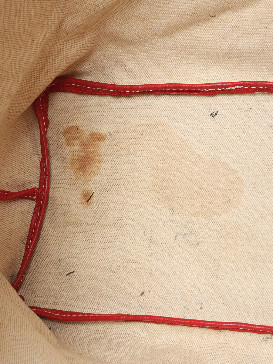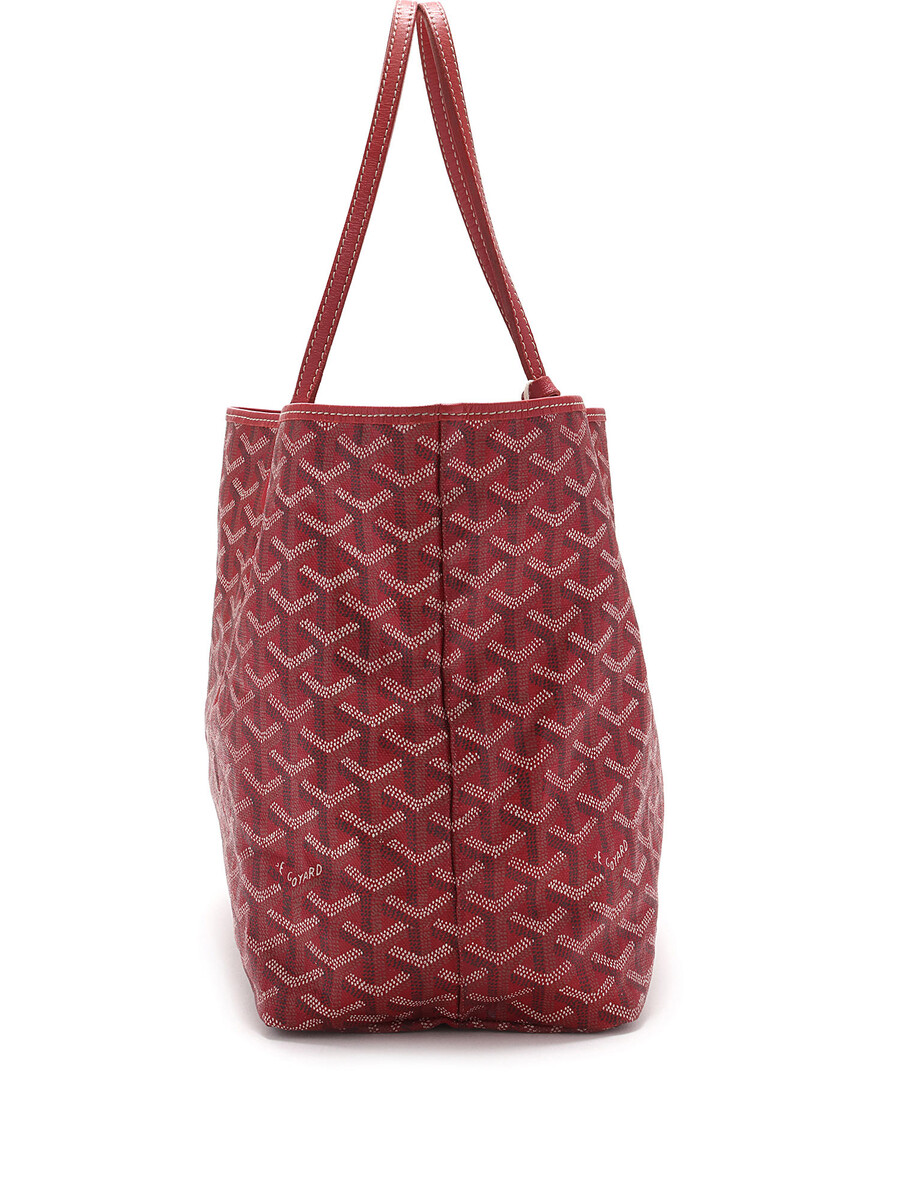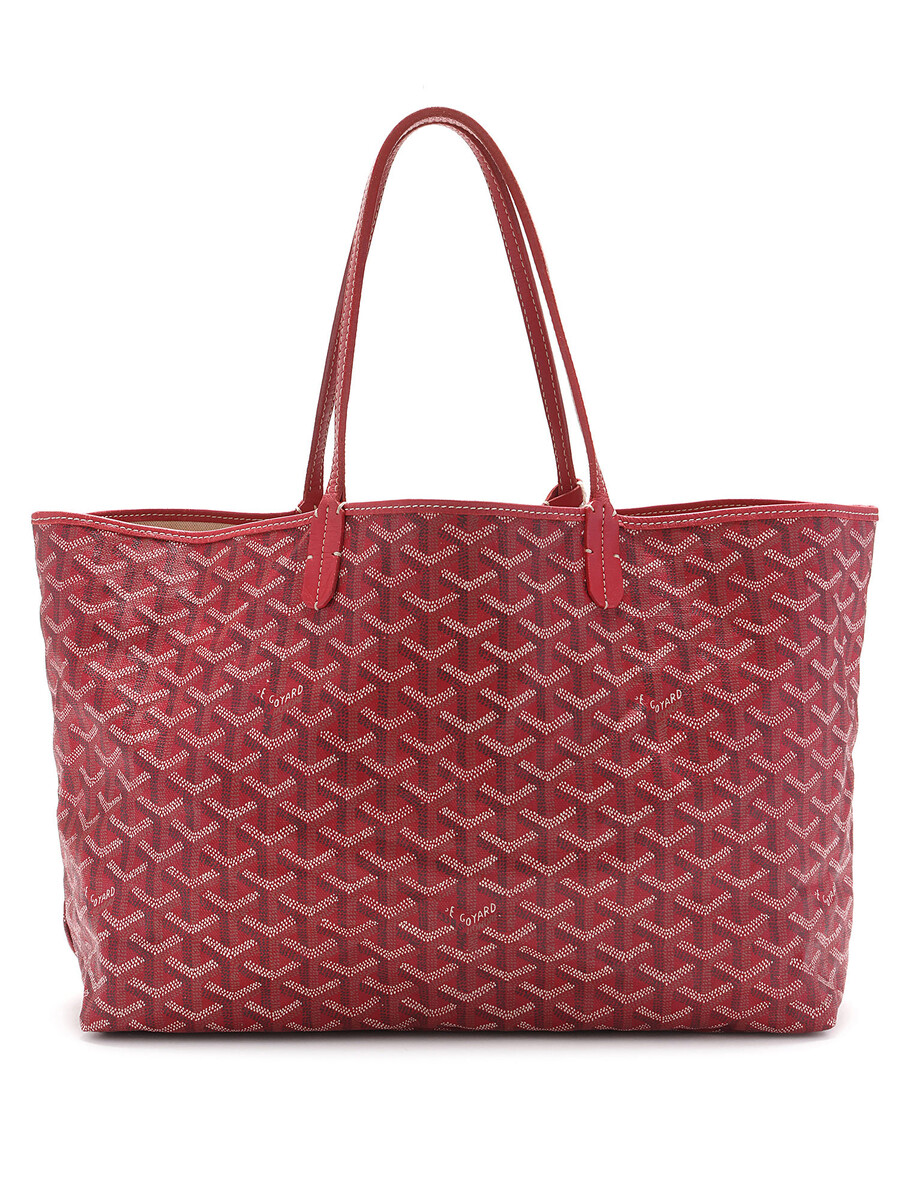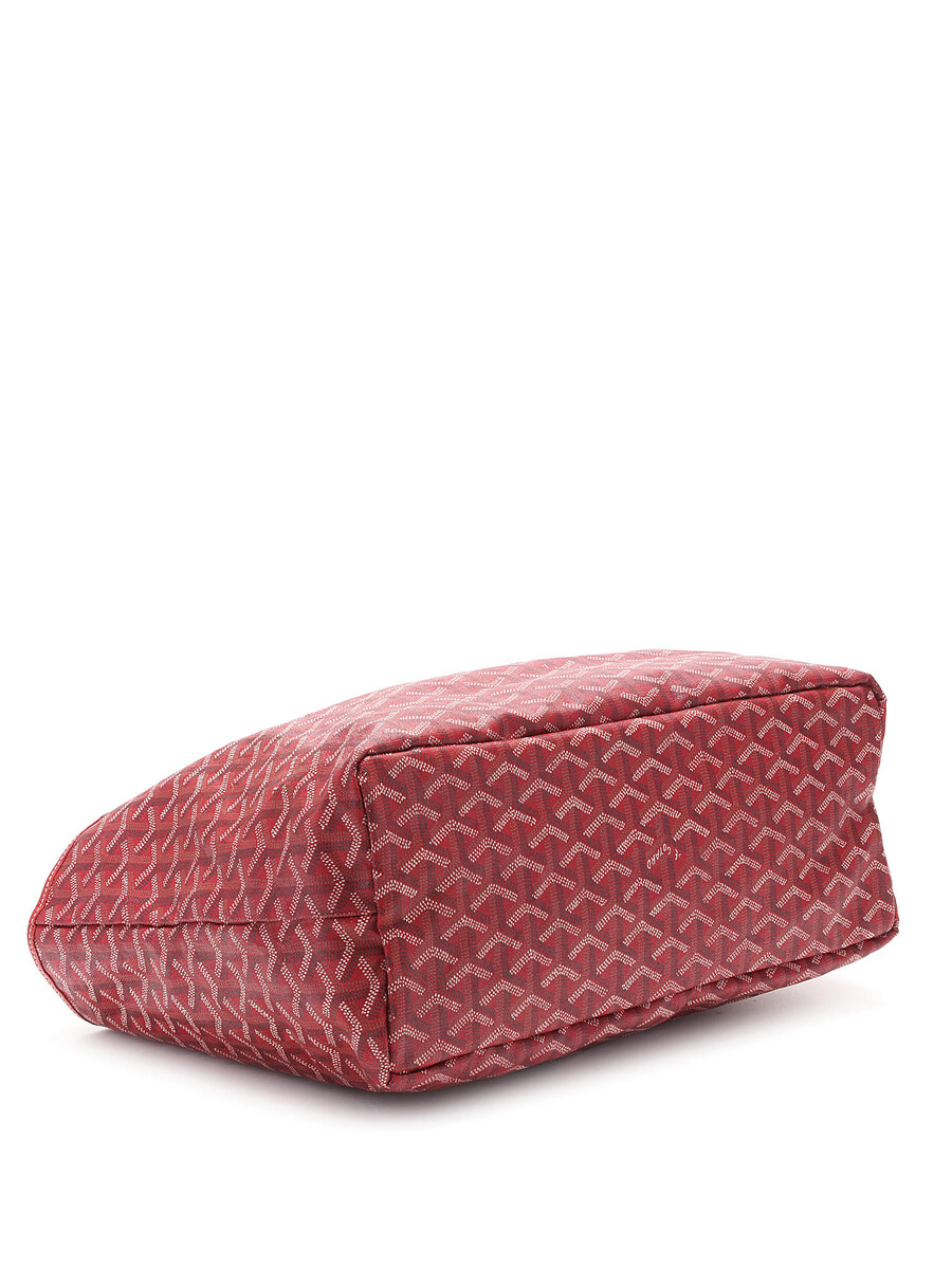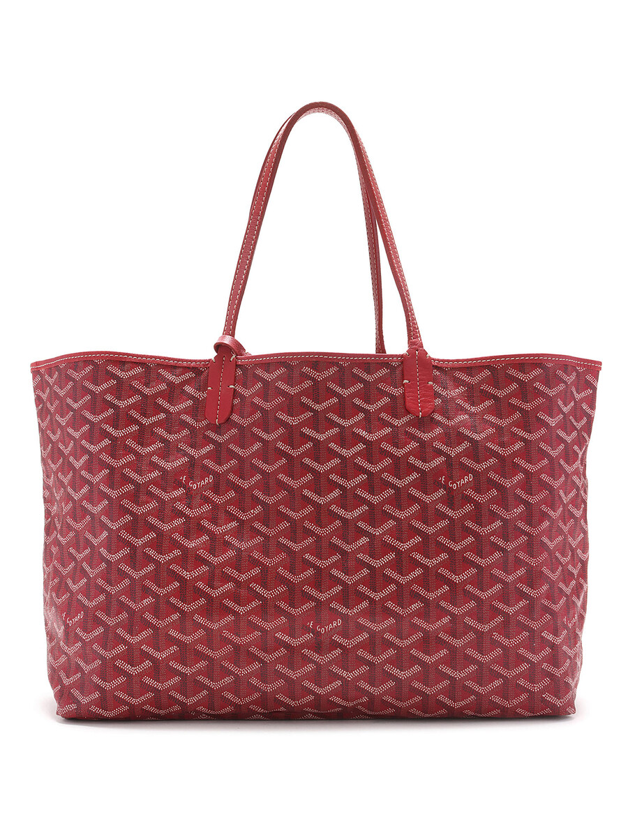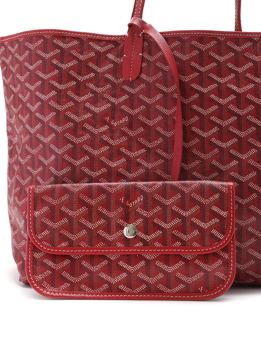 Sac cabas en toile enduite avec motif Goyardine en rouge, blanc et gris. Doubles poignées en cuir. Garnitures en cuir. Avec pochette amovible à l'intérieur.
