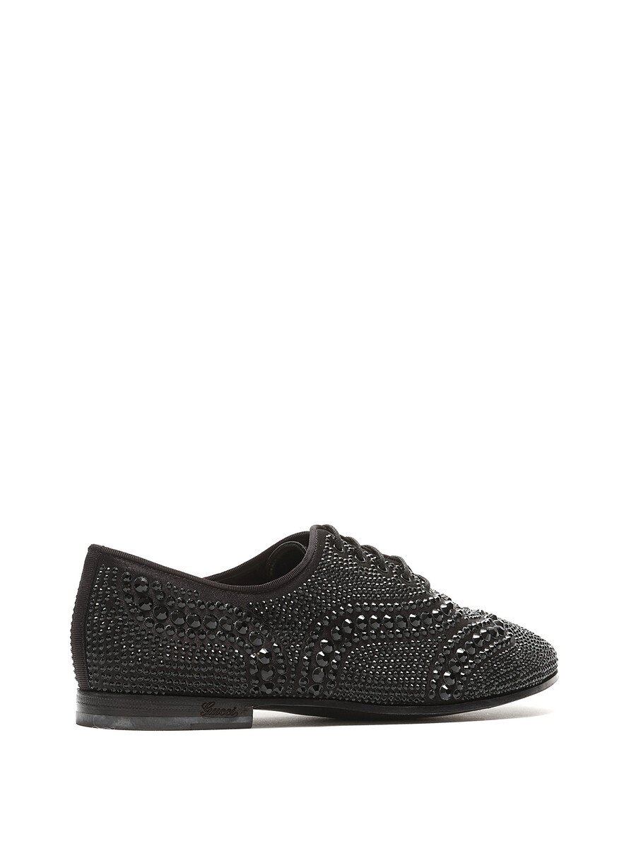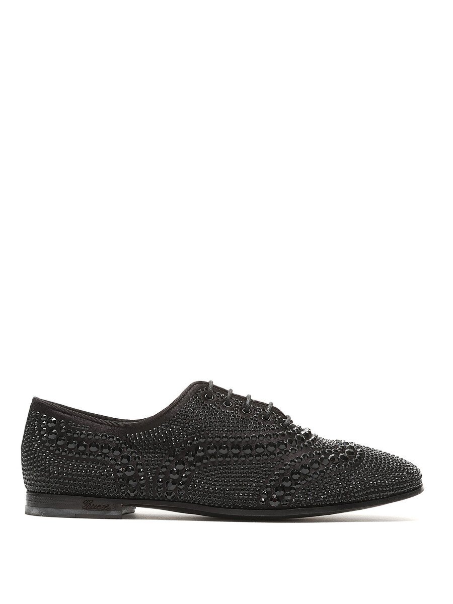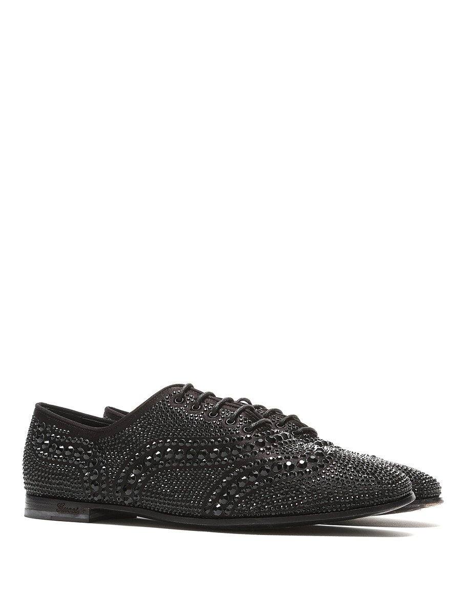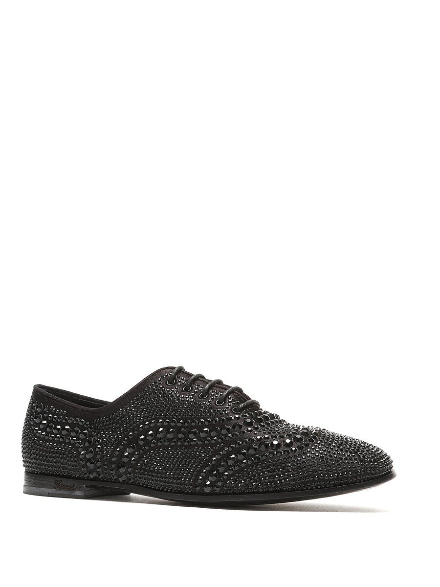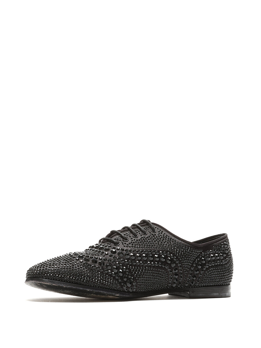 Chaussures à lacets en cuir noir ornées de strass. Style à bout rond fermé. Semelle en cuir avec un style à lacets classique.