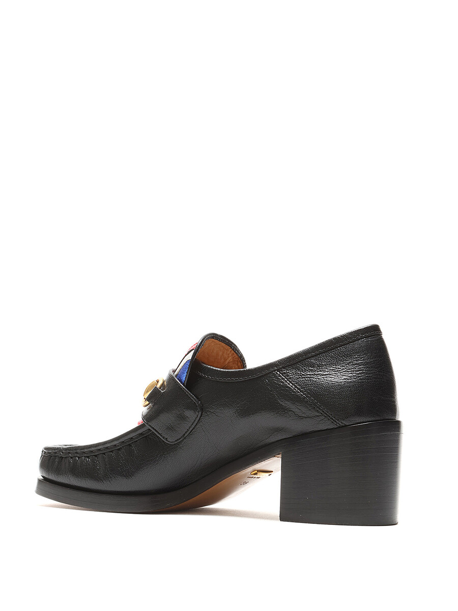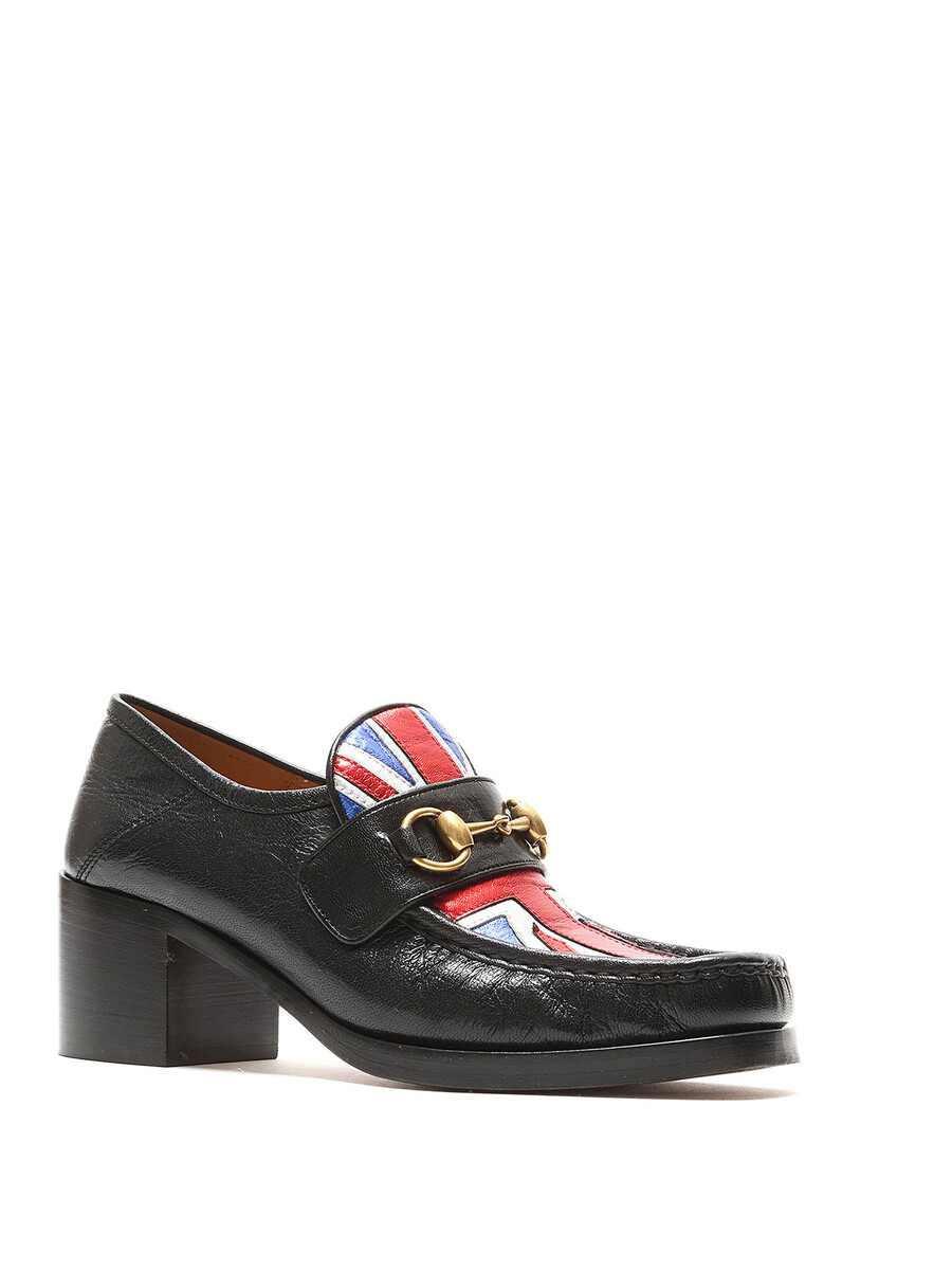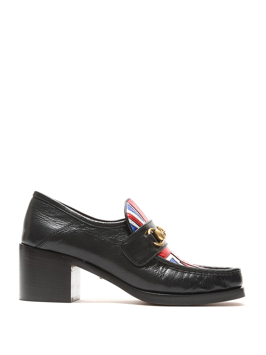 Mocassins en cuir grainé avec motif Union Jack et détail mors en métal doré. Fermeture à enfiler. Bout carré. Semelle en cuir.