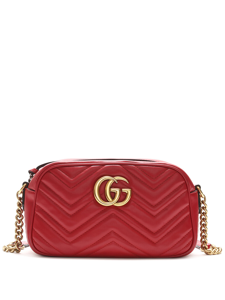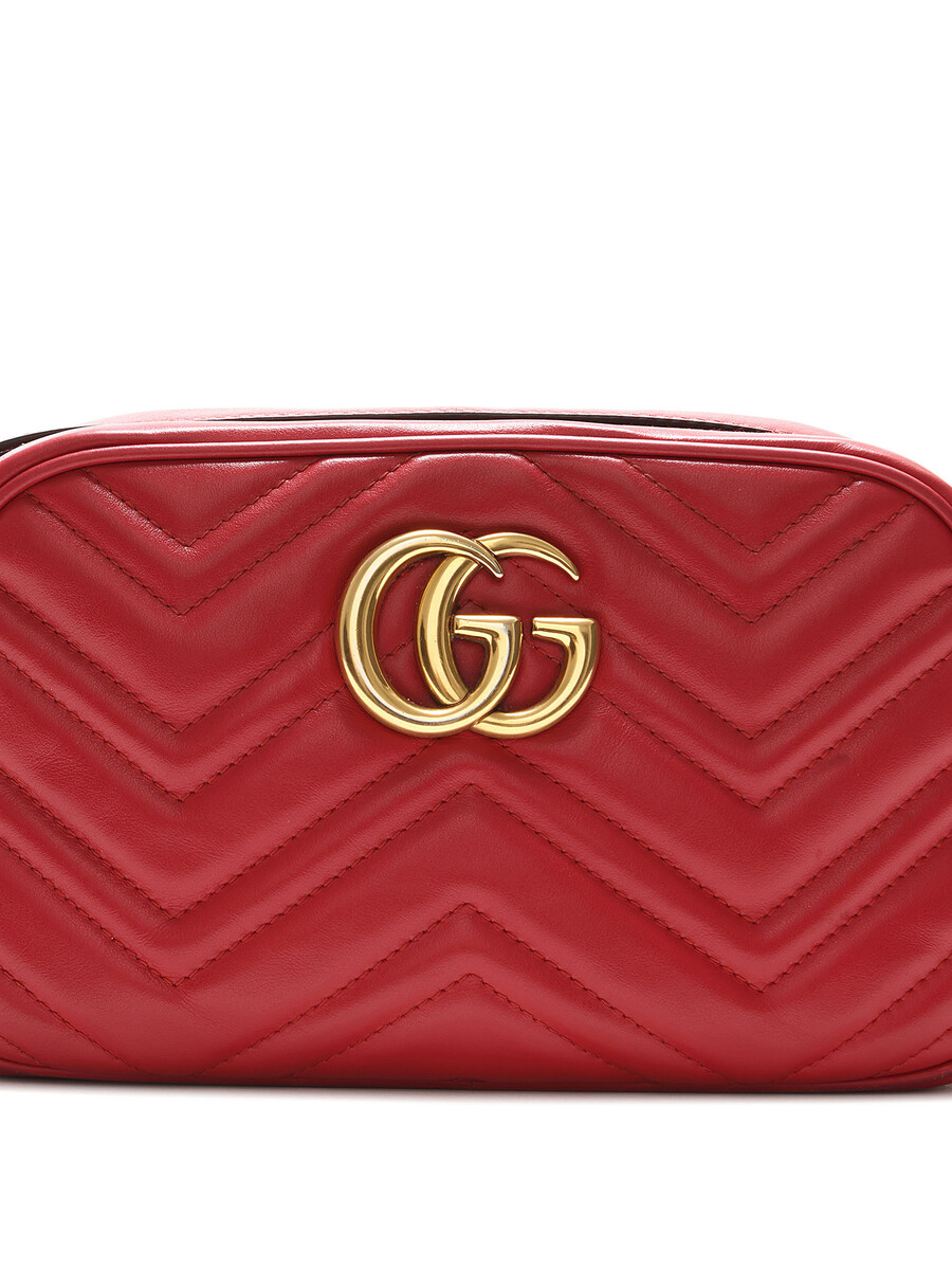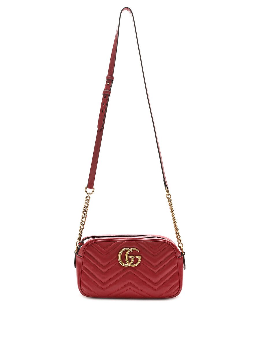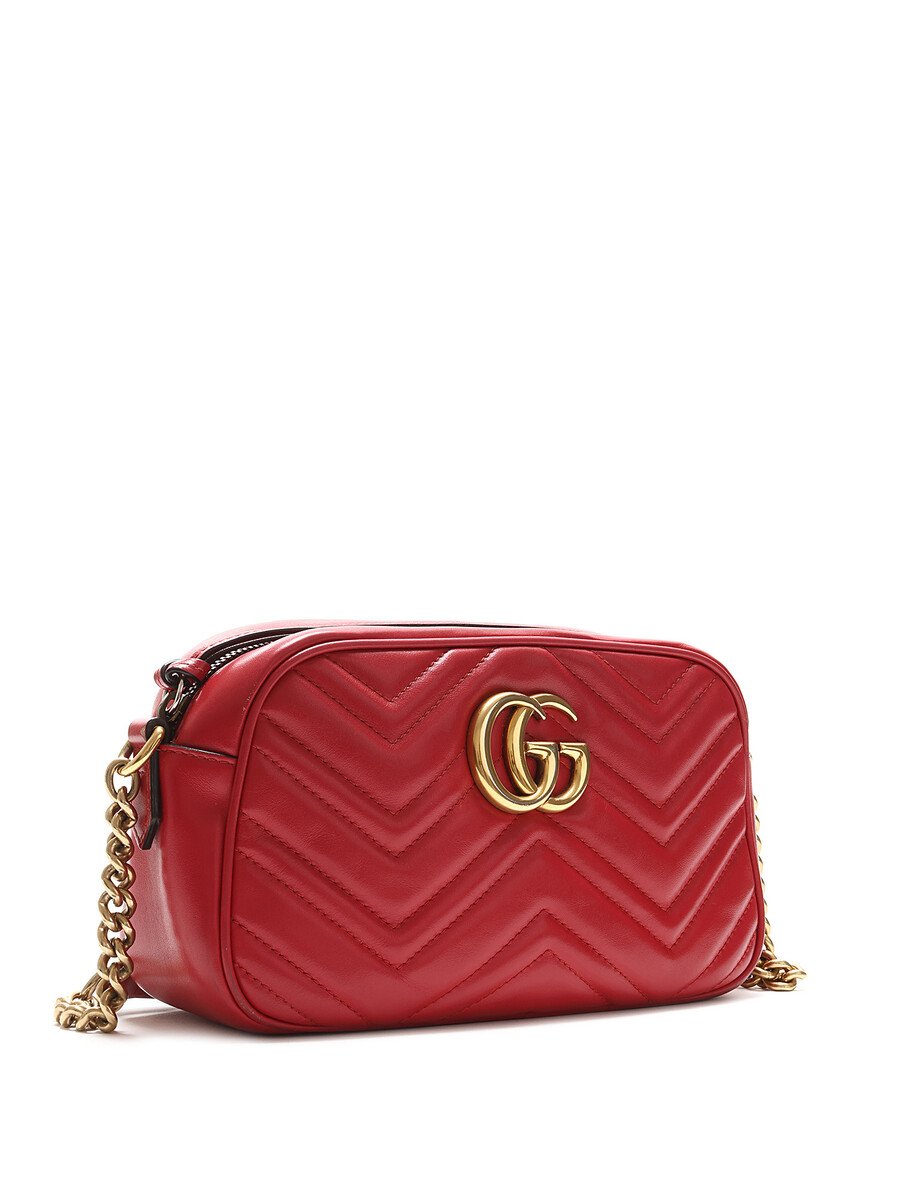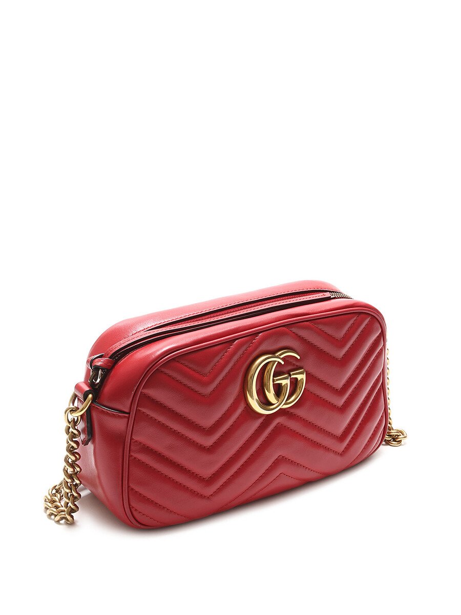 Sac mini GG Marmont matelassé en cuir rouge orné de motifs chevrons. Fermeture à glissière supérieure. Bandeau en chaîne et cuir croisé. Quincaillerie dorée.