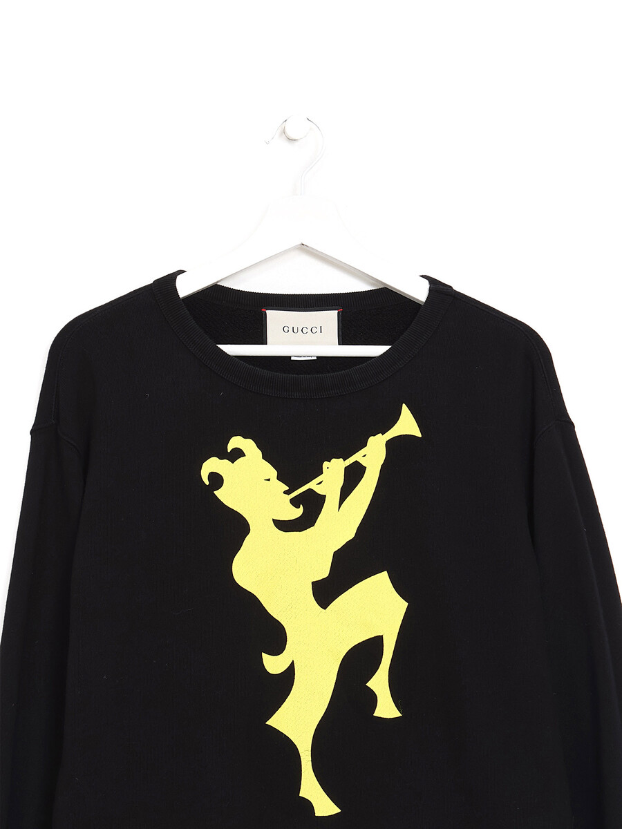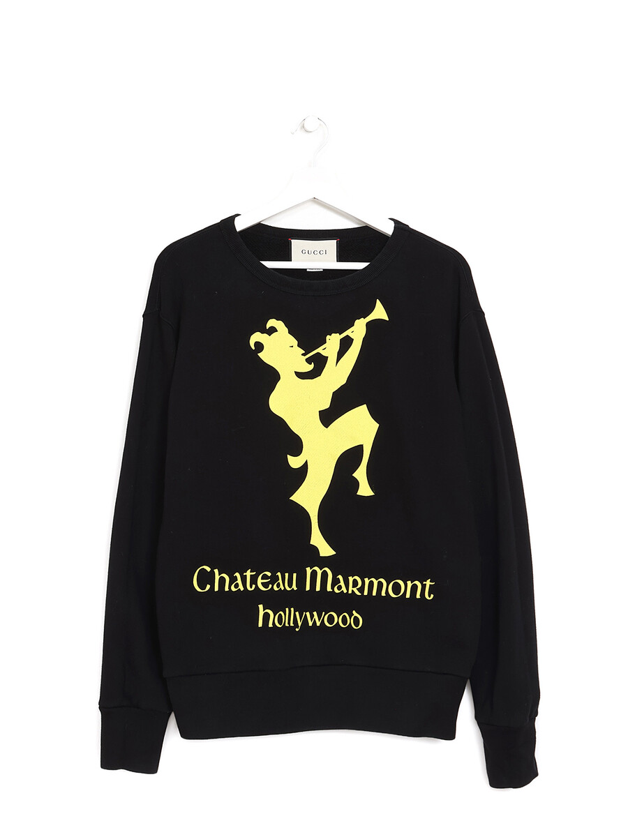 Sweatshirt à manches longues noir avec imprimé graphique Chateau Marmont en jaune et motif floral au dos. Encolure ras du cou.
