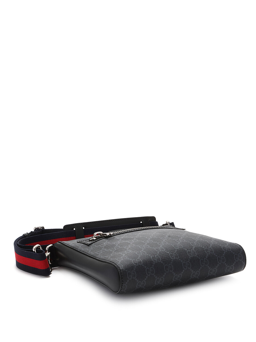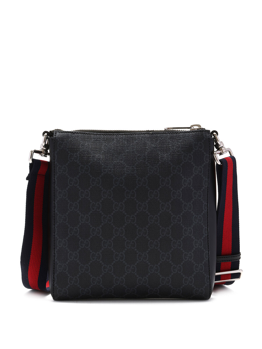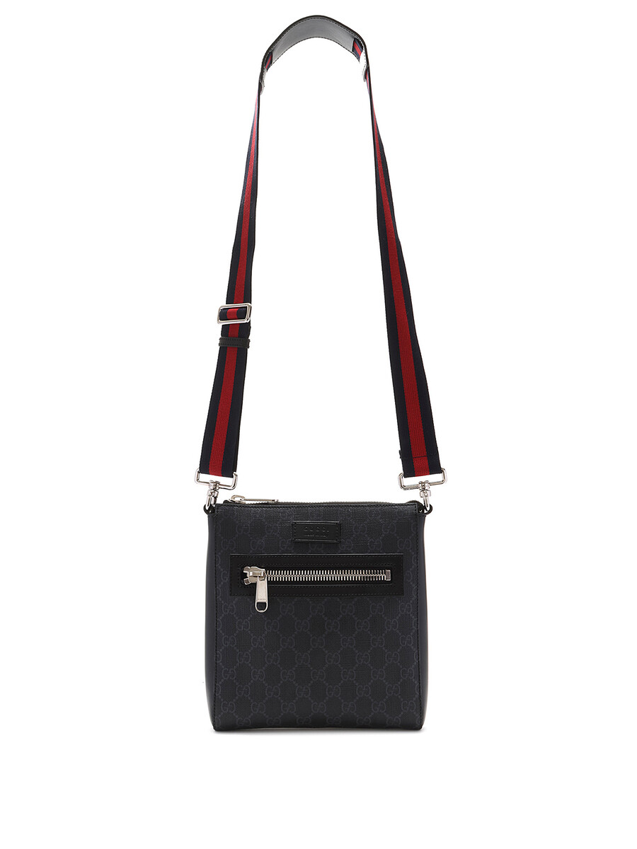 Sac à bandoulière en toile enduite à monogramme « GG Supreme » dans les tons de gris et noir. Fermeture à glissière au dessus et au devant. Bandoulière nattée dans les tons de bleu minuit et rouge. Écusson à logo en cuir noir au devant. Ferrures en métal argenté. Détails en cuir noir aux côtés.