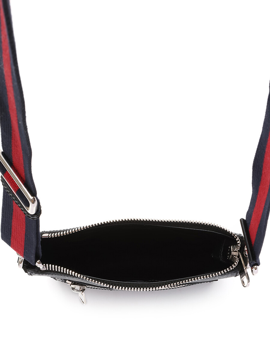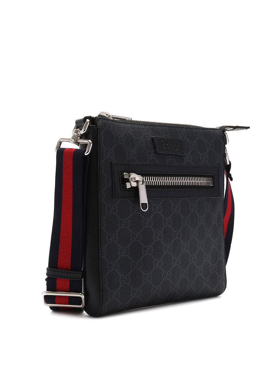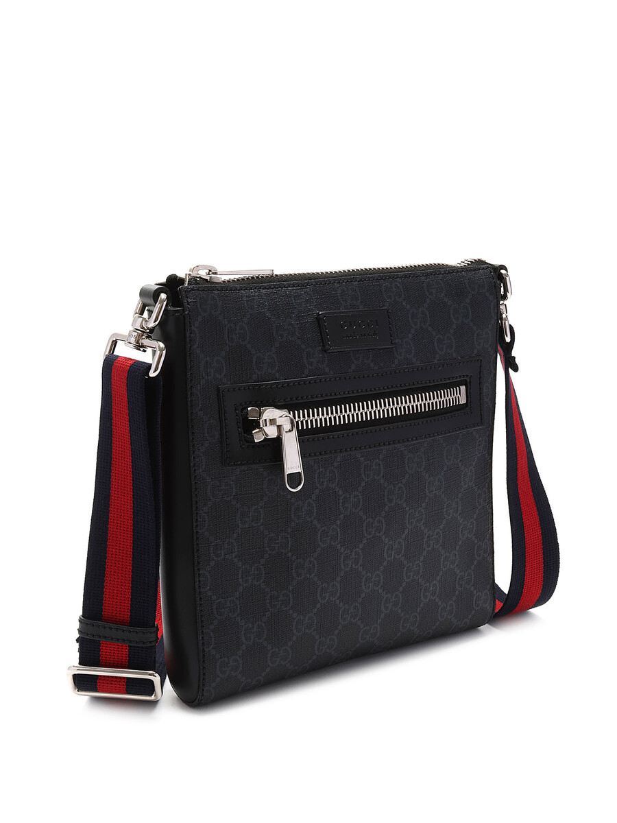 Sac à bandoulière en toile enduite à monogramme « GG Supreme » dans les tons de gris et noir. Fermeture à glissière au dessus et au devant. Bandoulière nattée dans les tons de bleu minuit et rouge. Écusson à logo en cuir noir au devant. Ferrures en métal argenté. Détails en cuir noir aux côtés.