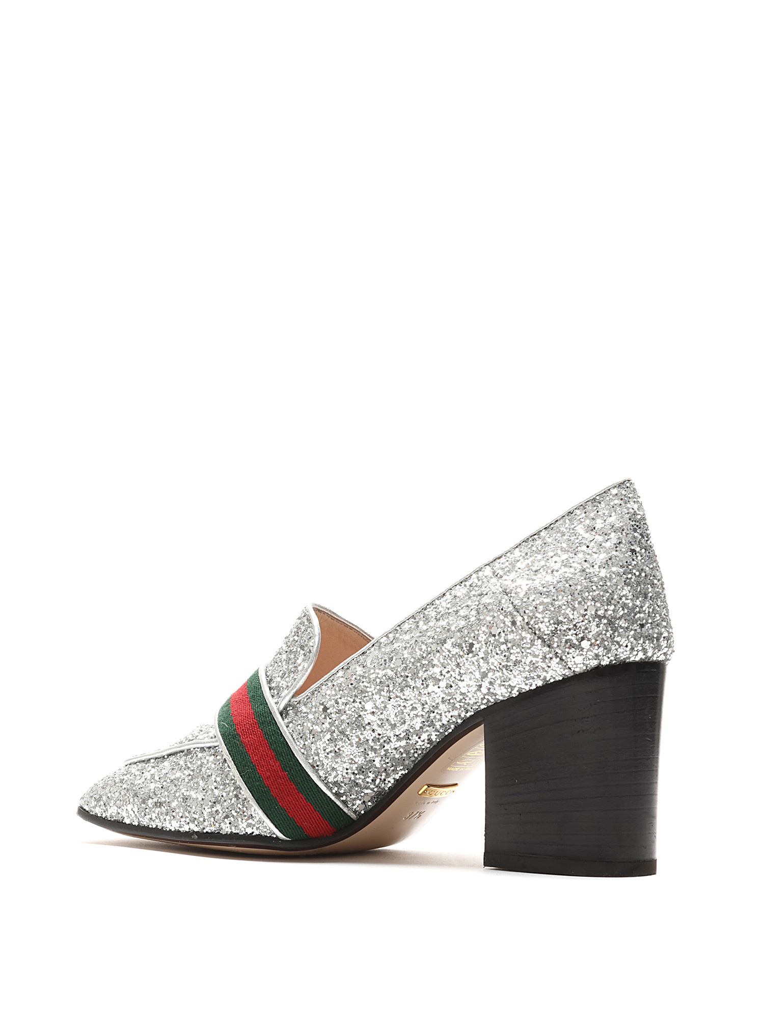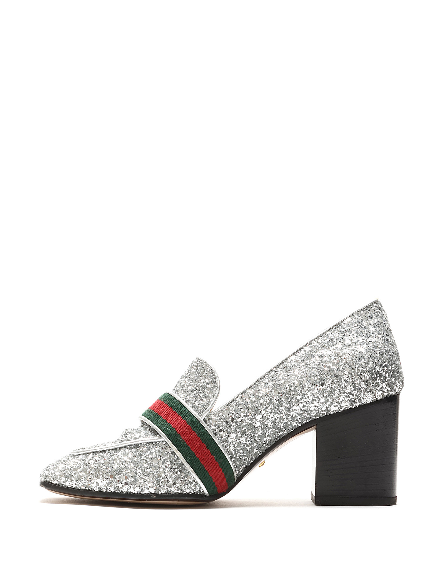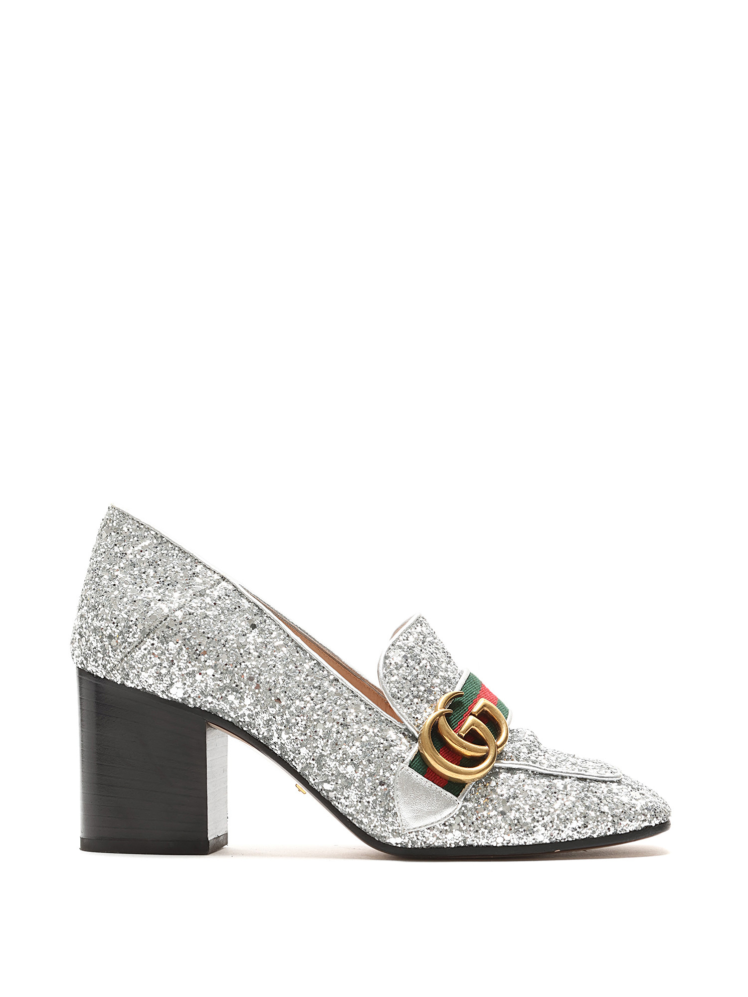 Escarpins à talon plateforme à paillettes en métal argenté. Style bout carré. Fermeture à enfiler. Semelle en cuir.