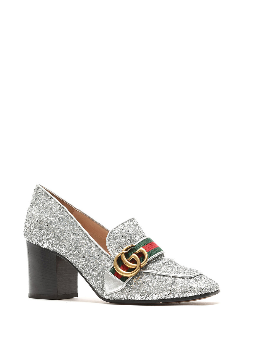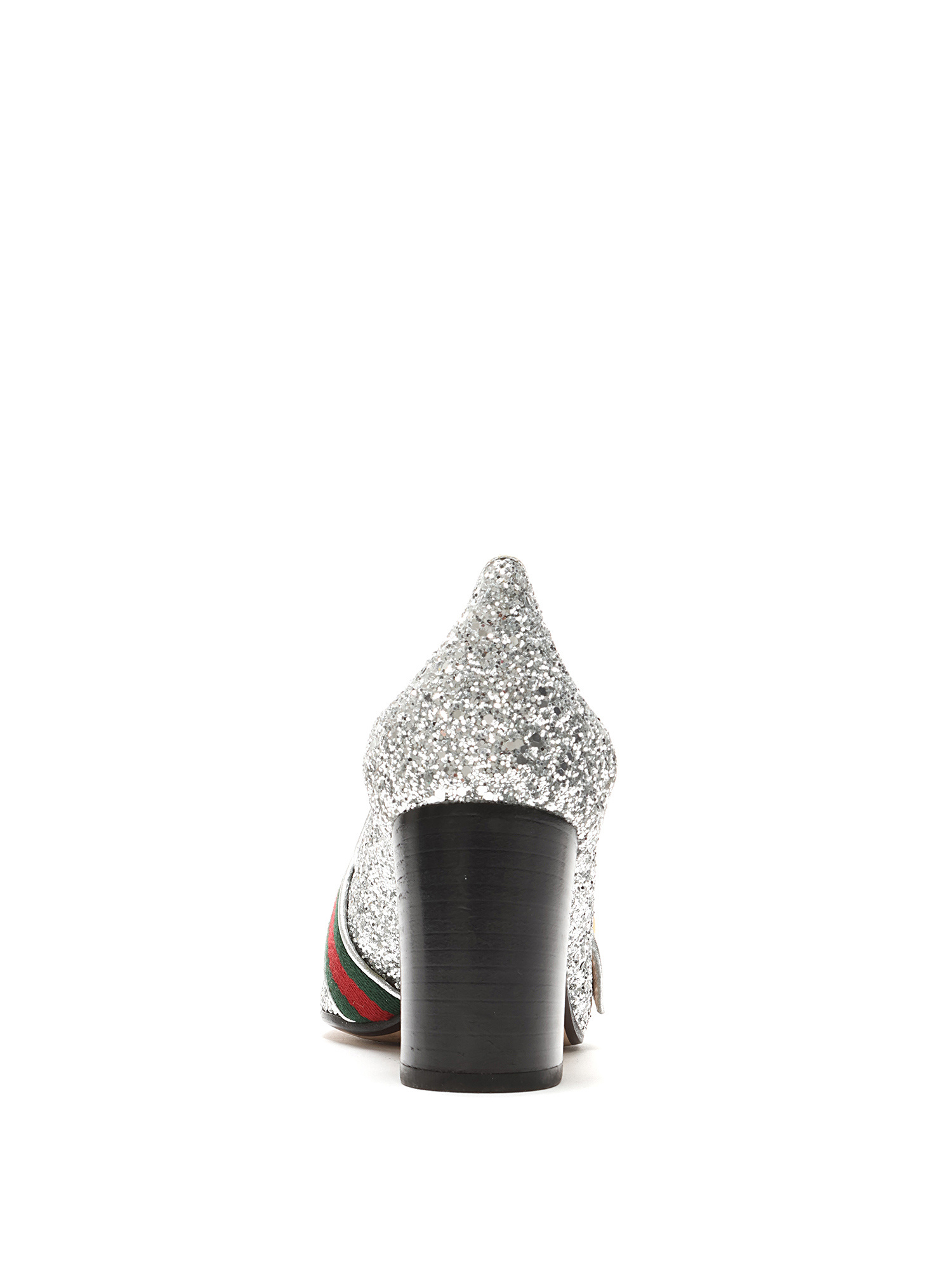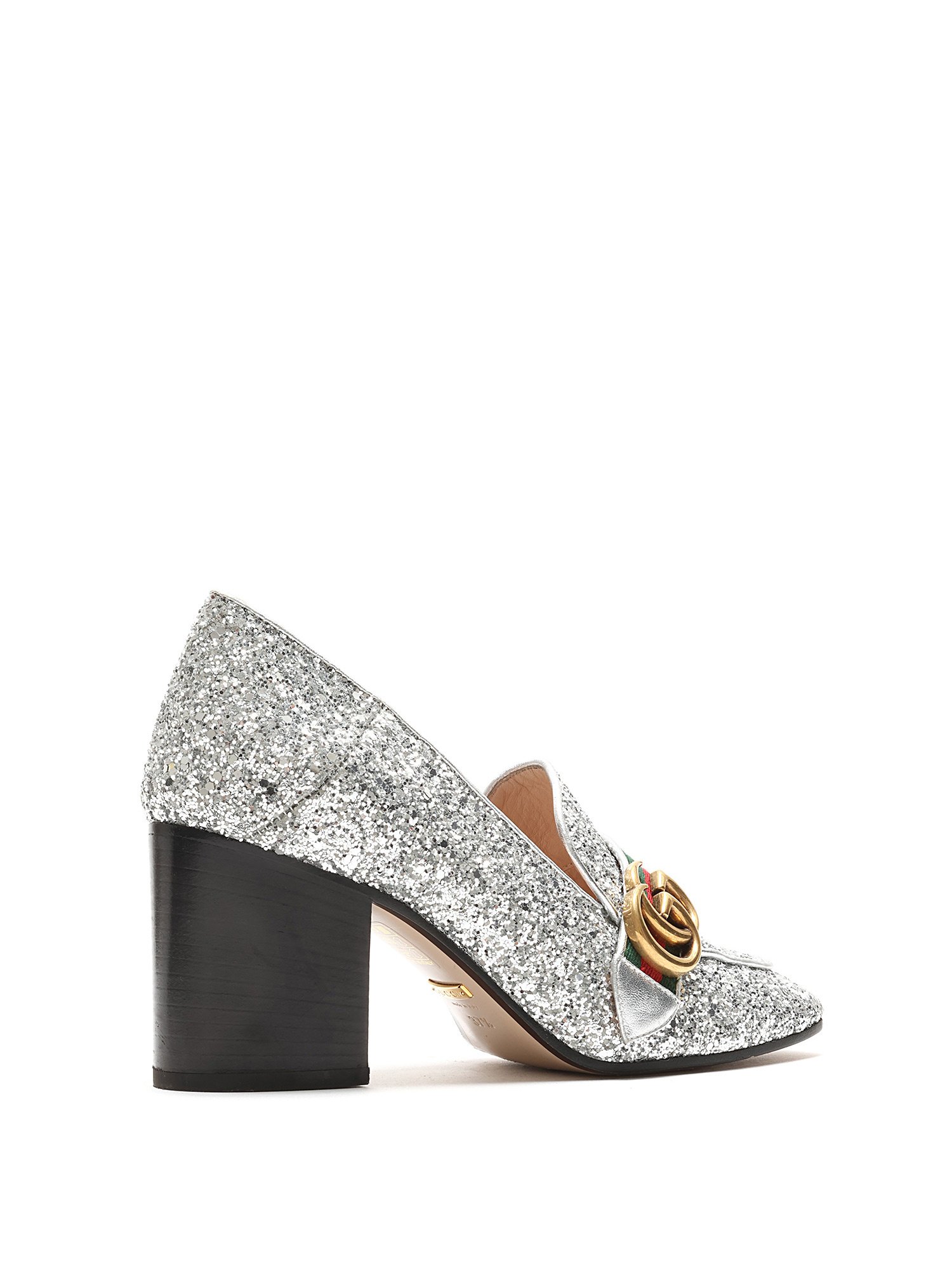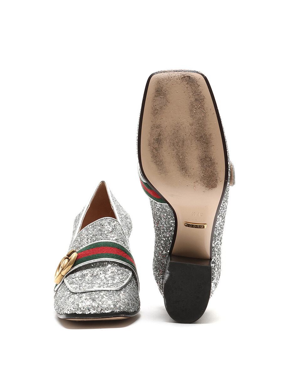 Escarpins à talon plateforme à paillettes en métal argenté. Style bout carré. Fermeture à enfiler. Semelle en cuir.