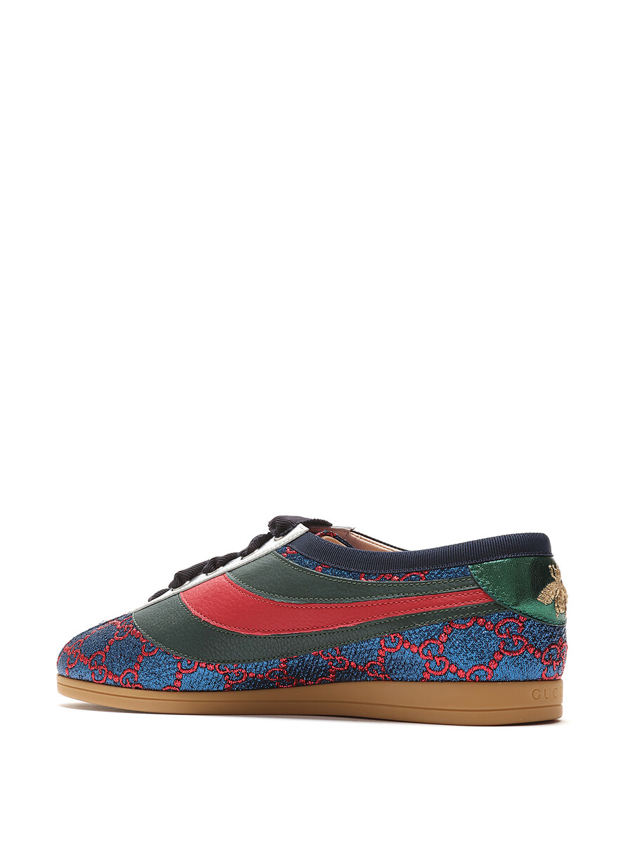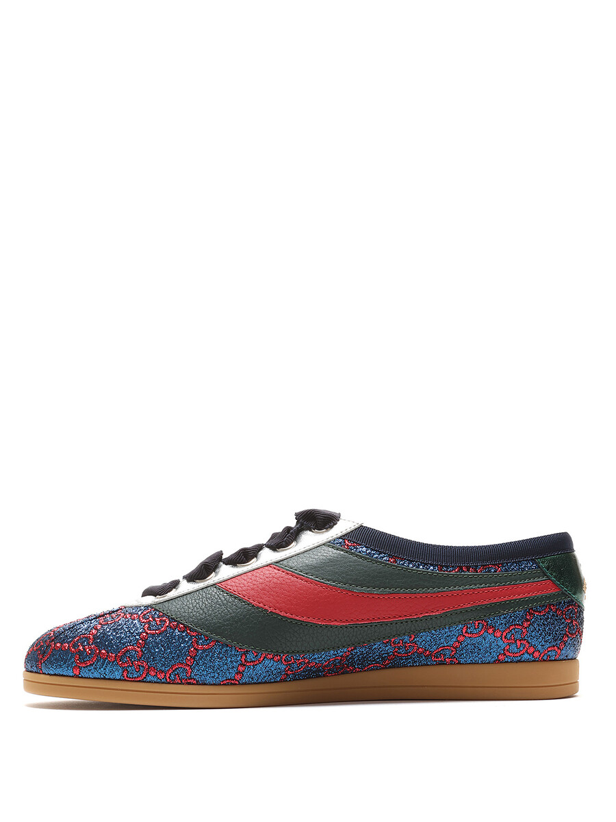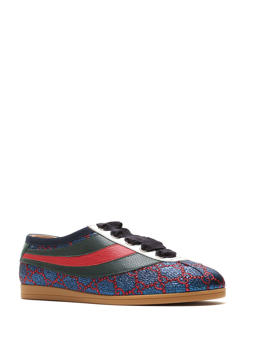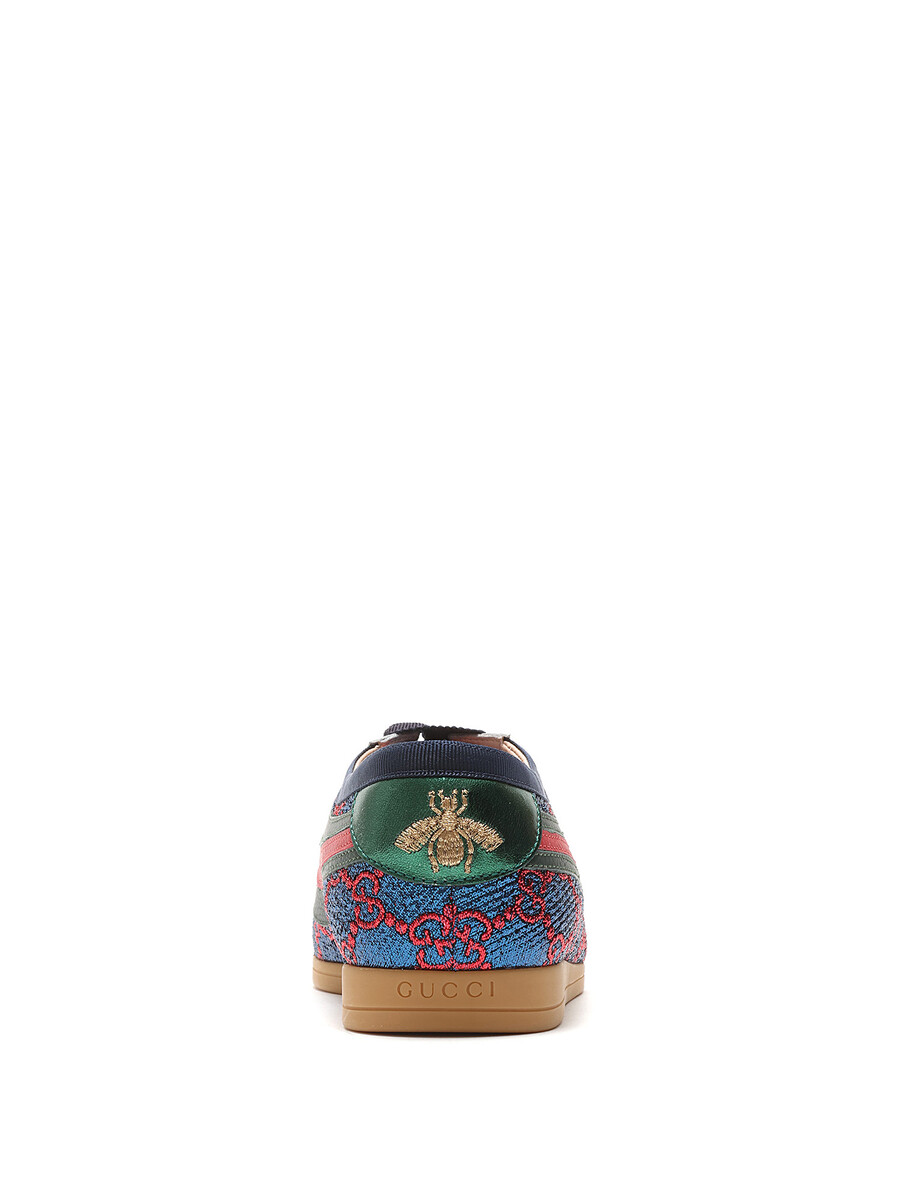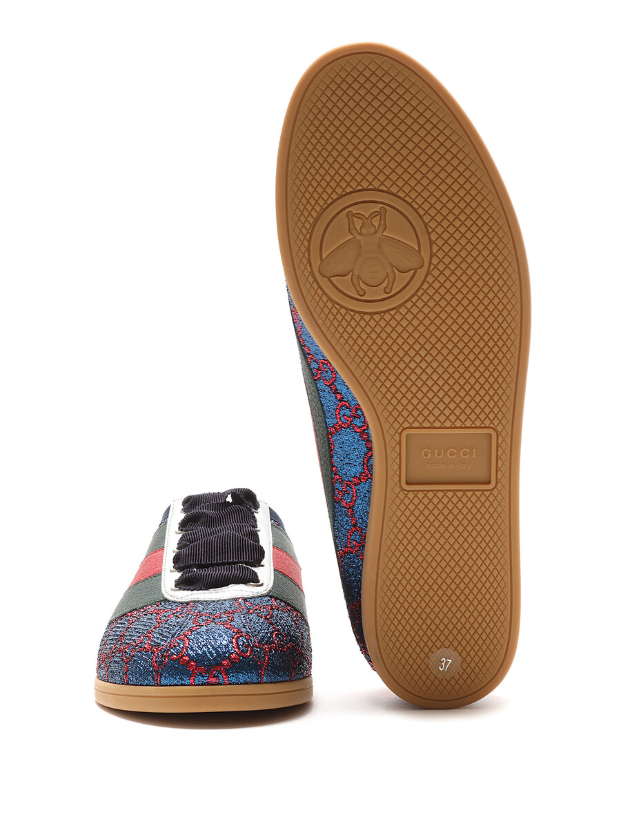Baskets en toile à logo monogramme avec des tons métallisés en bleu et rouge. Laçage. Bandes de cuir rouge et vert sur le côté. Bout rond. Semelle en caoutchouc. Avec boîte.