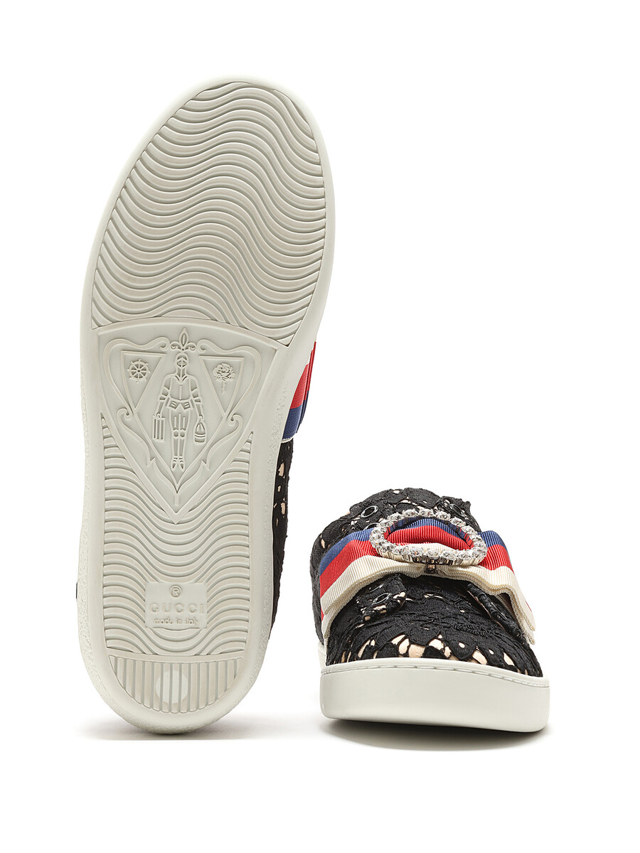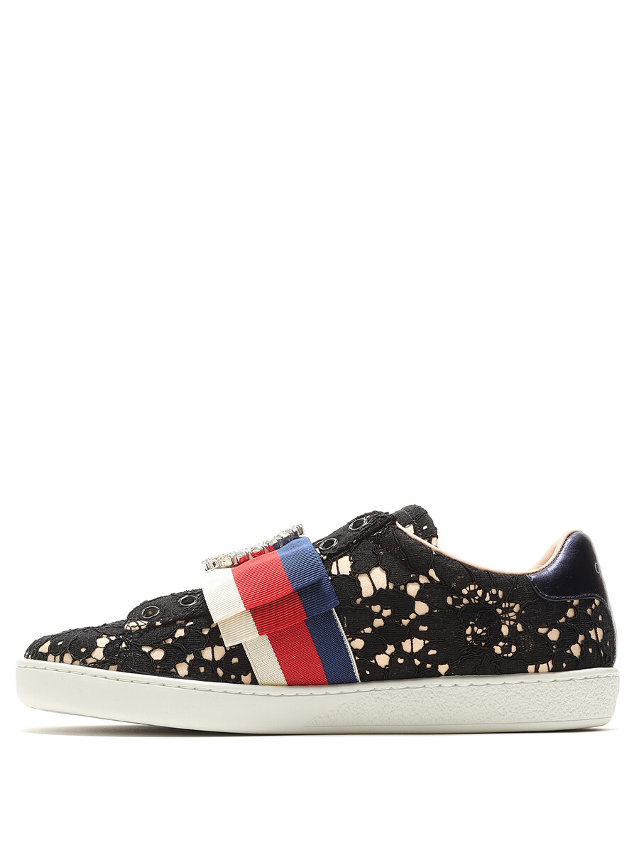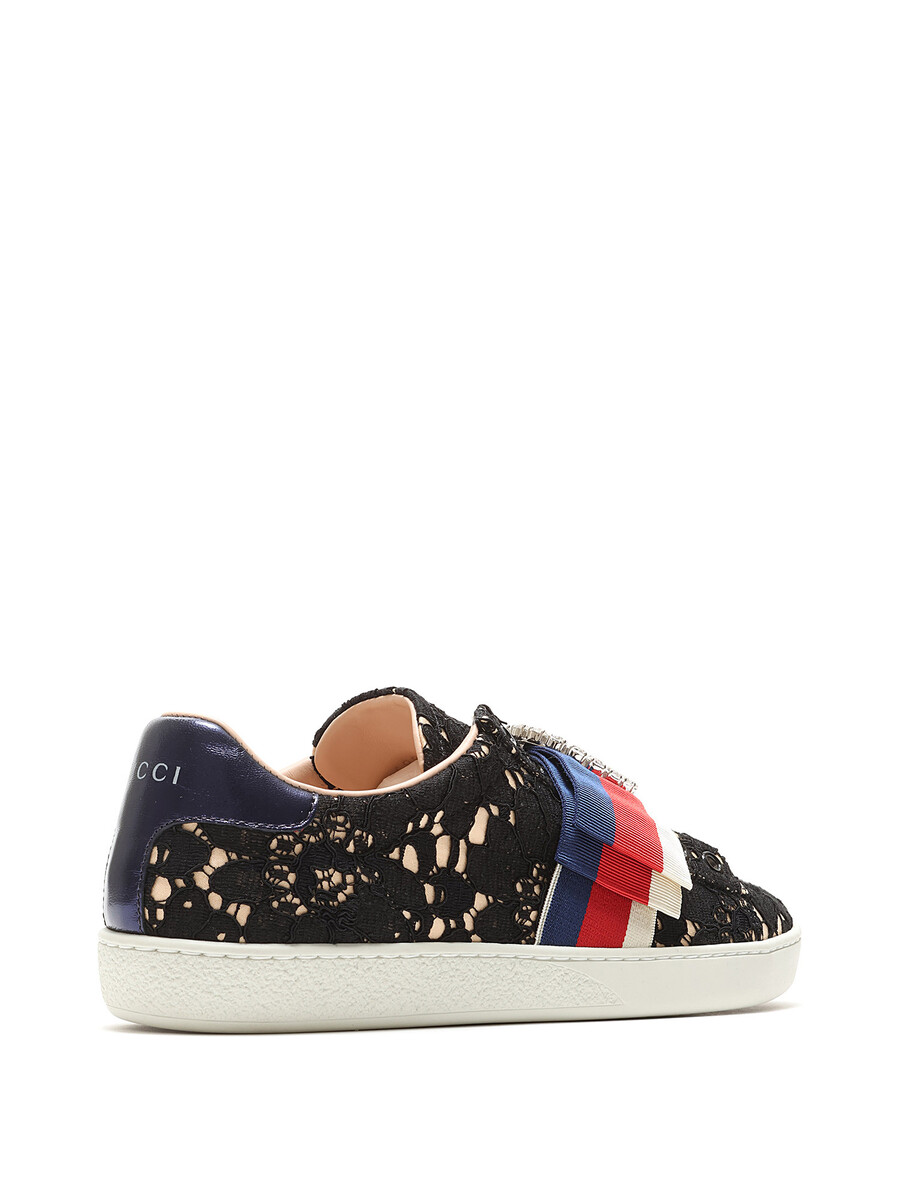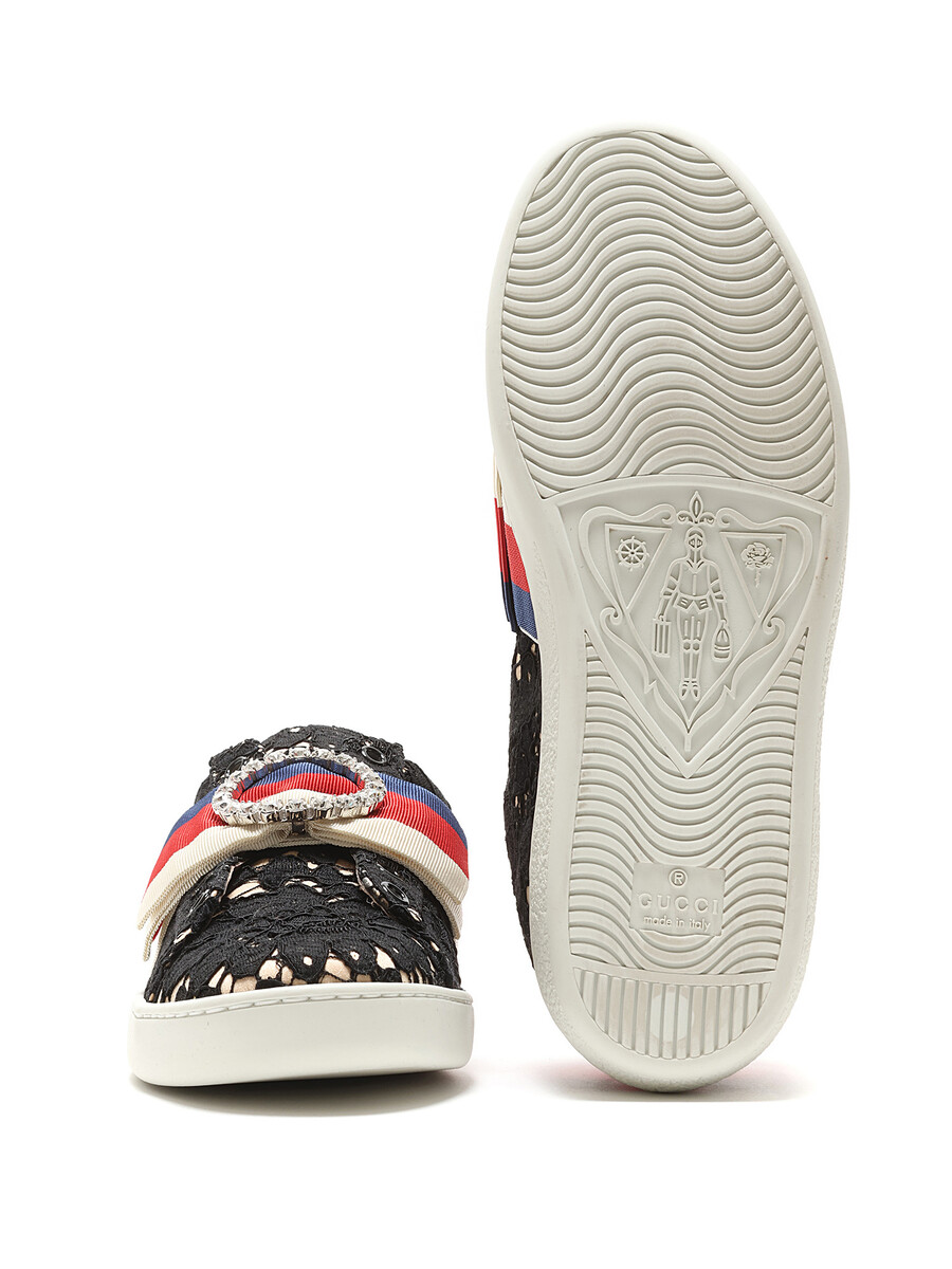 Baskets en dentelle noire avec détails en cristal et bandes élastiques bleu, blanc et rouge sur l'empeigne. Semelle en caoutchouc. Avec boîte.