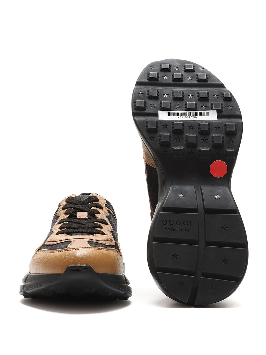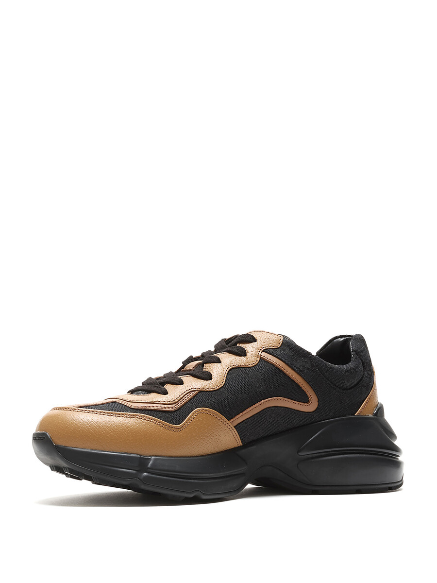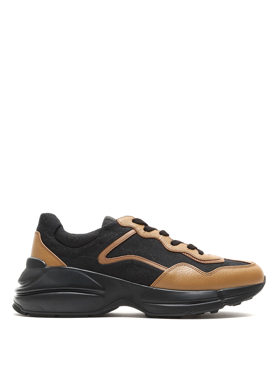 Baskets basses à blocs de couleur en cuir et tissu noir et beige, avec des empiècements en cuir contrasté. Fermeture à lacets. Bout rond fermé. Semelle en caoutchouc.