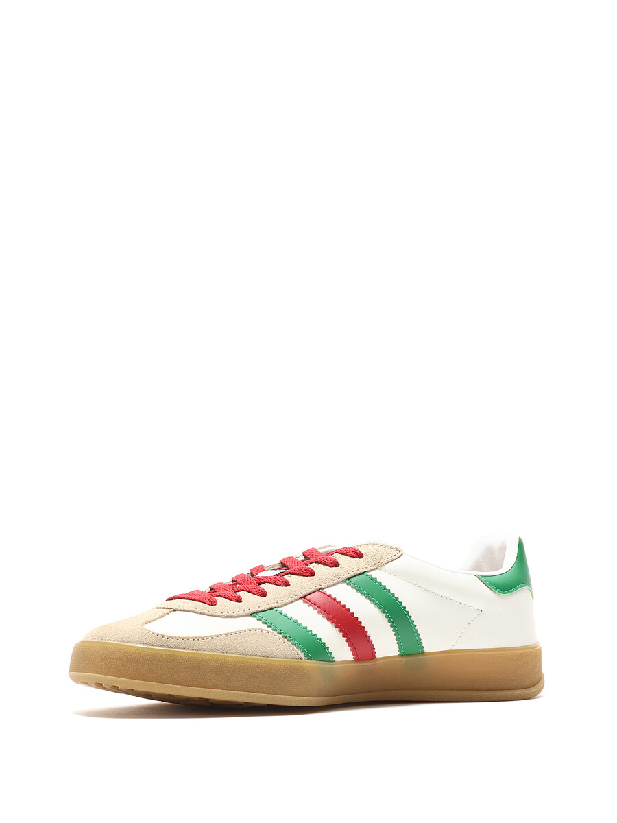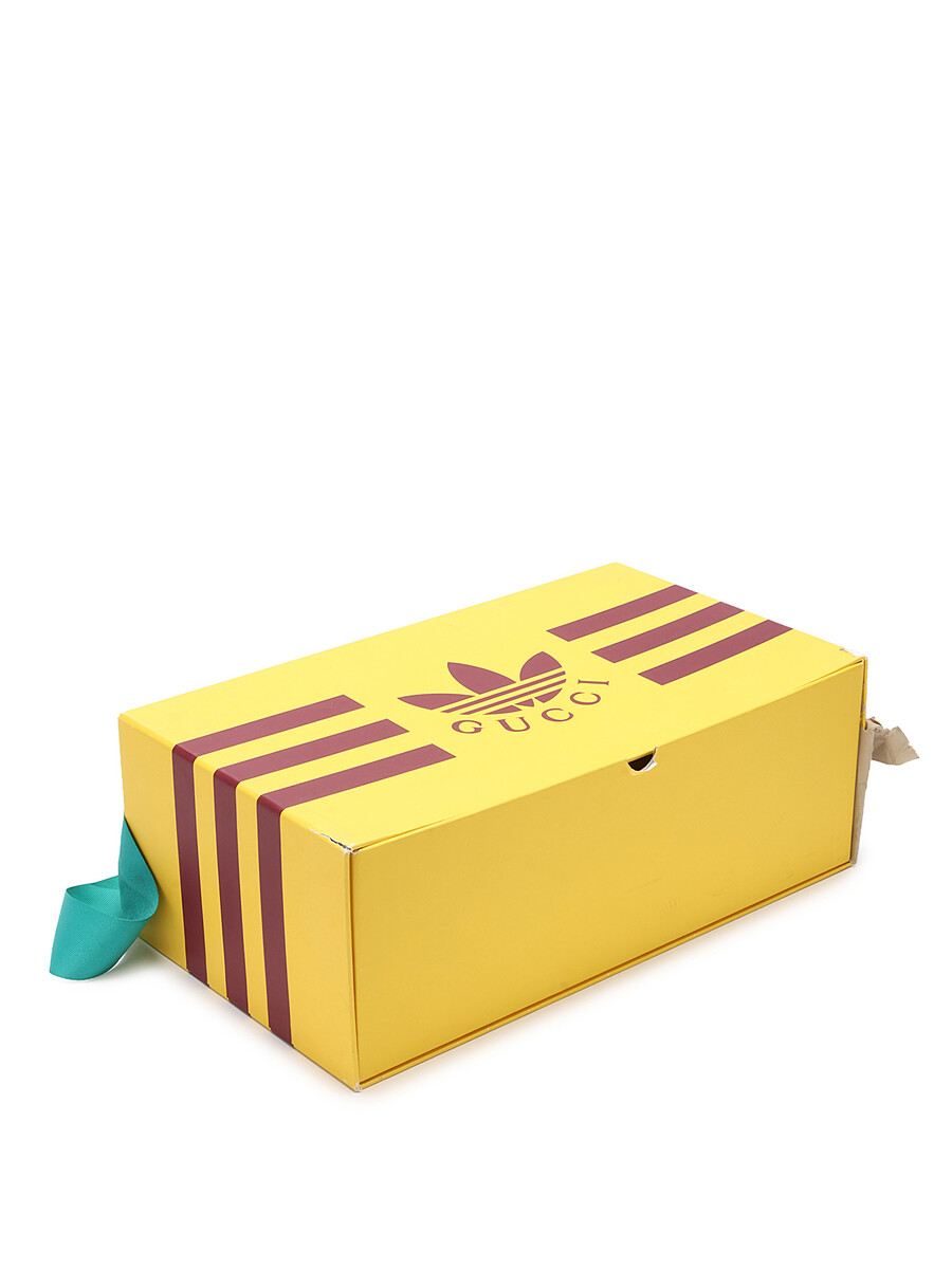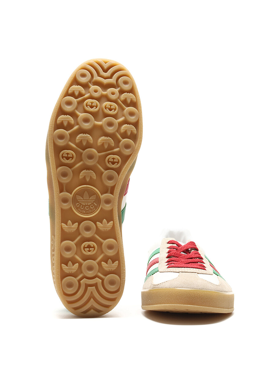 Baskets basses Gucci x Adidas en cuir lisse et suède. Rayures emblématiques en blanc, vert, rouge et beige. Bout rond. Fermeture à lacets. Semelle en caoutchouc.
