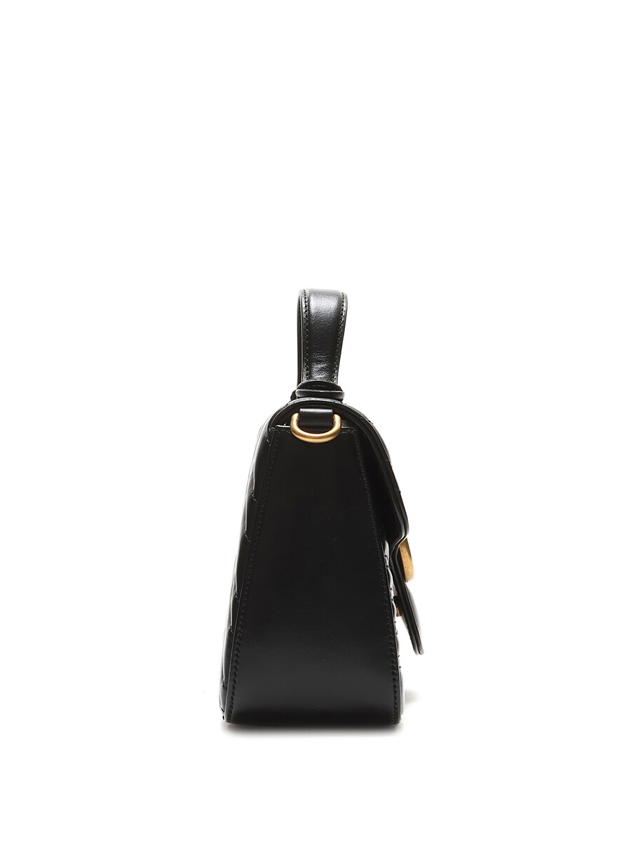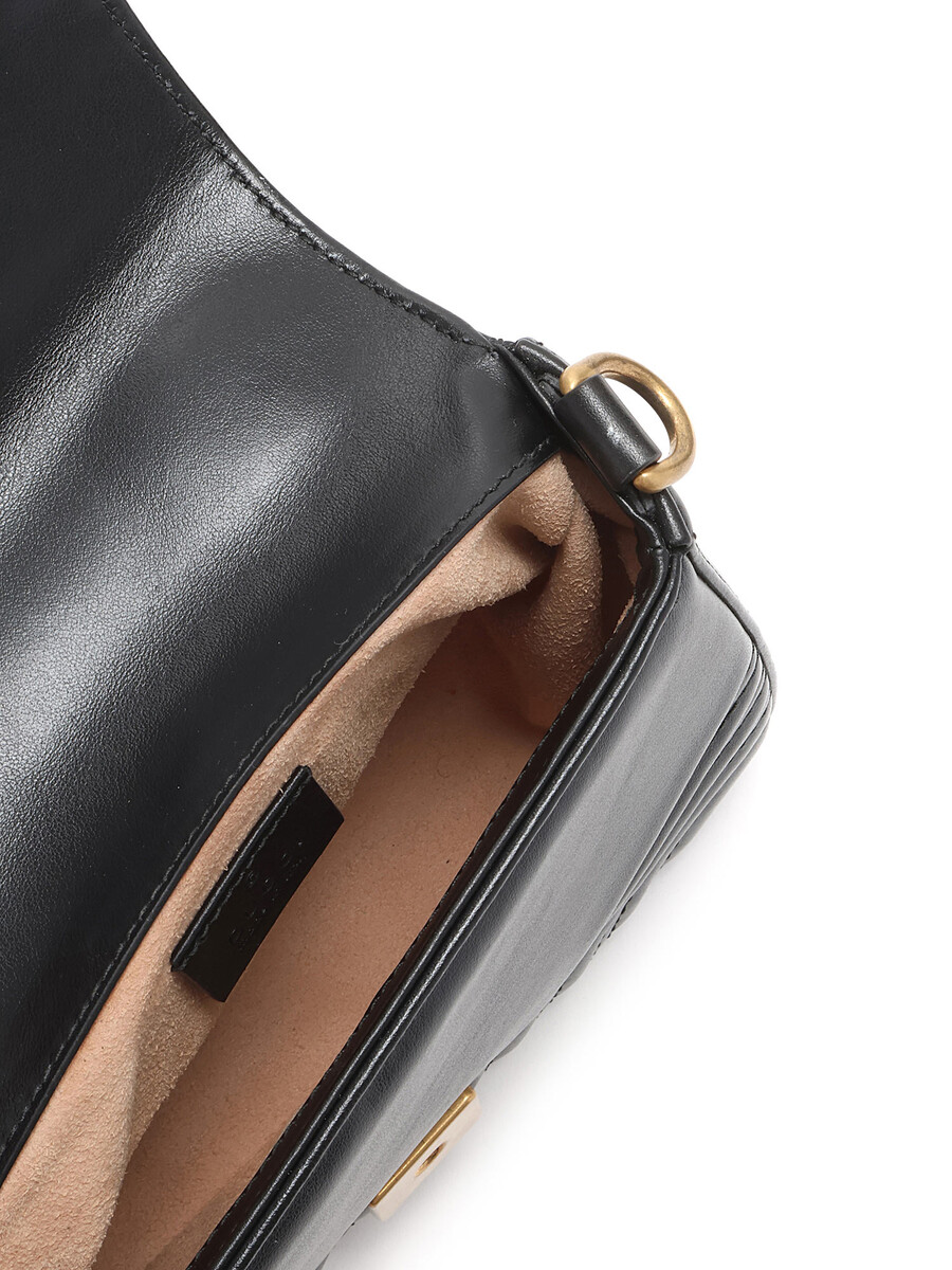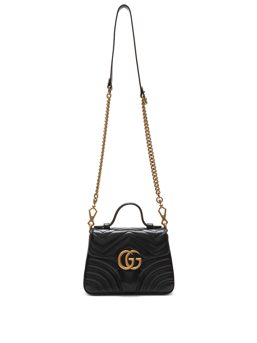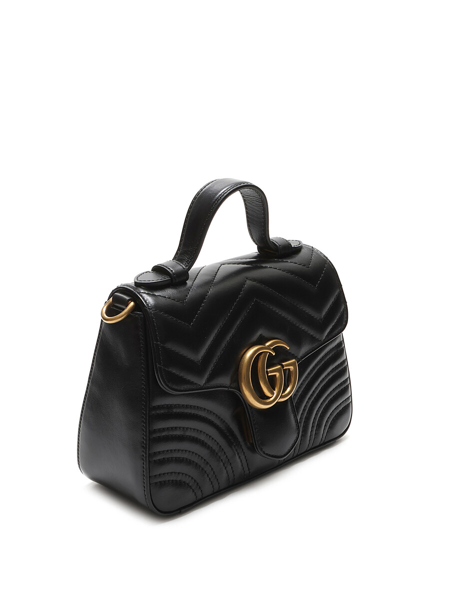 Petit sac à main GG Marmont en cuir matelassé à motif de chevrons noir. Fermeture à rabat avec pression. Bandoulière amovible en chaîne et cuir. Ferrures dorées.
