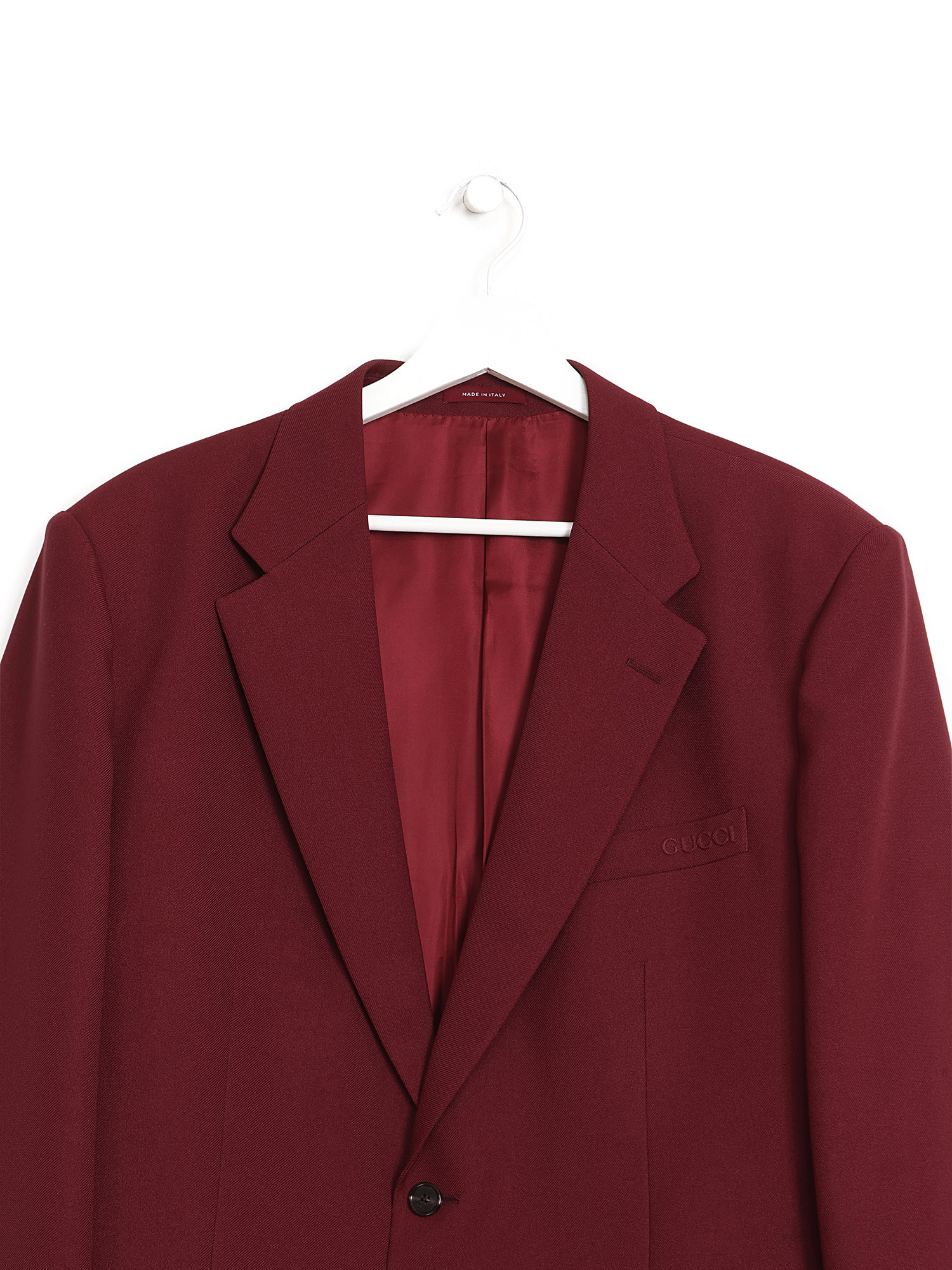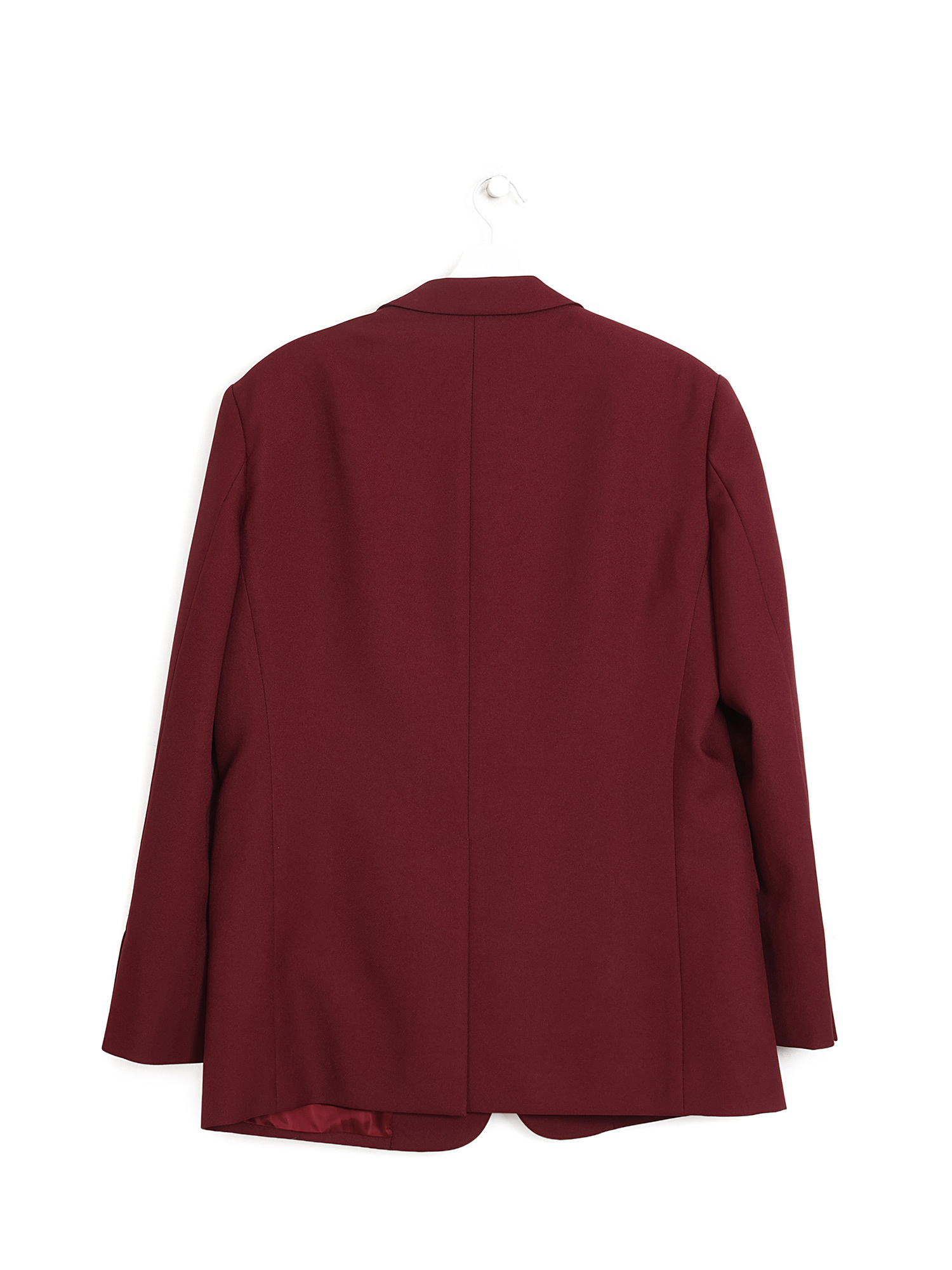 Veston en laine rouge. Col tailleur. Fermeture à boutons au devant. Poches à rabat.