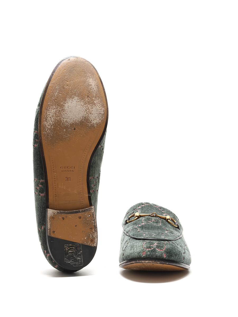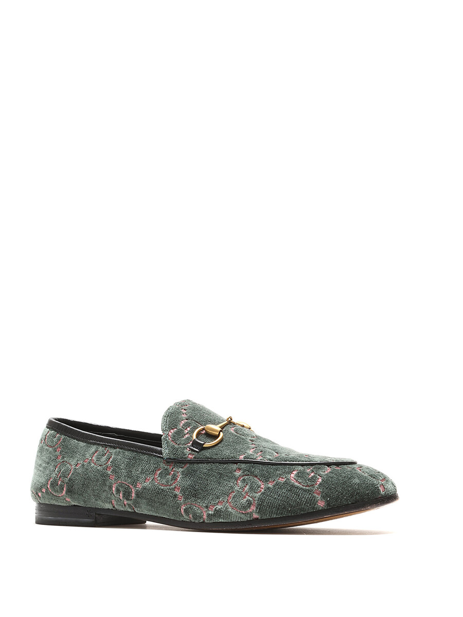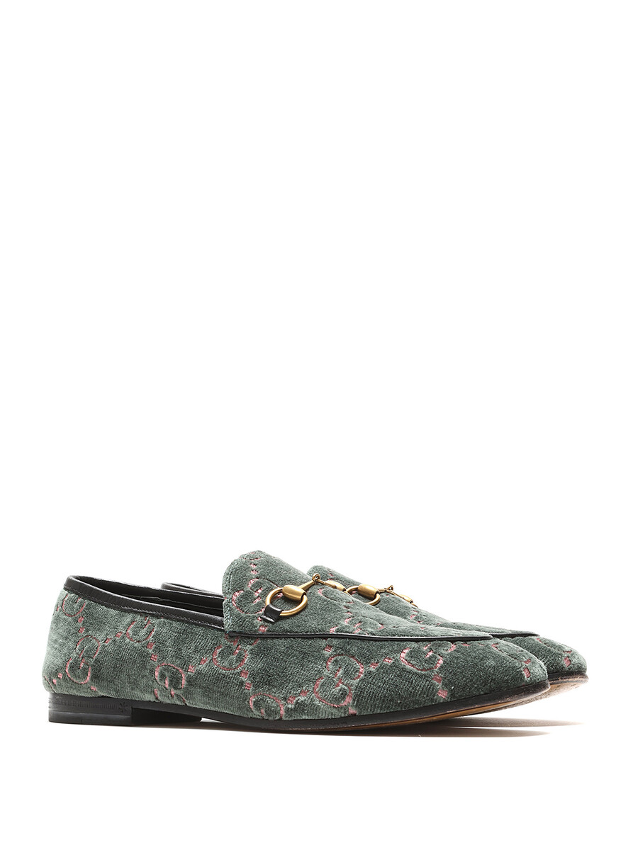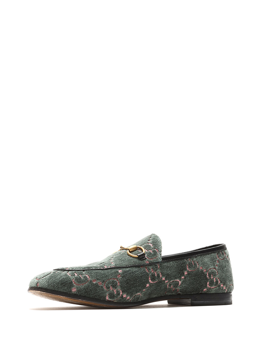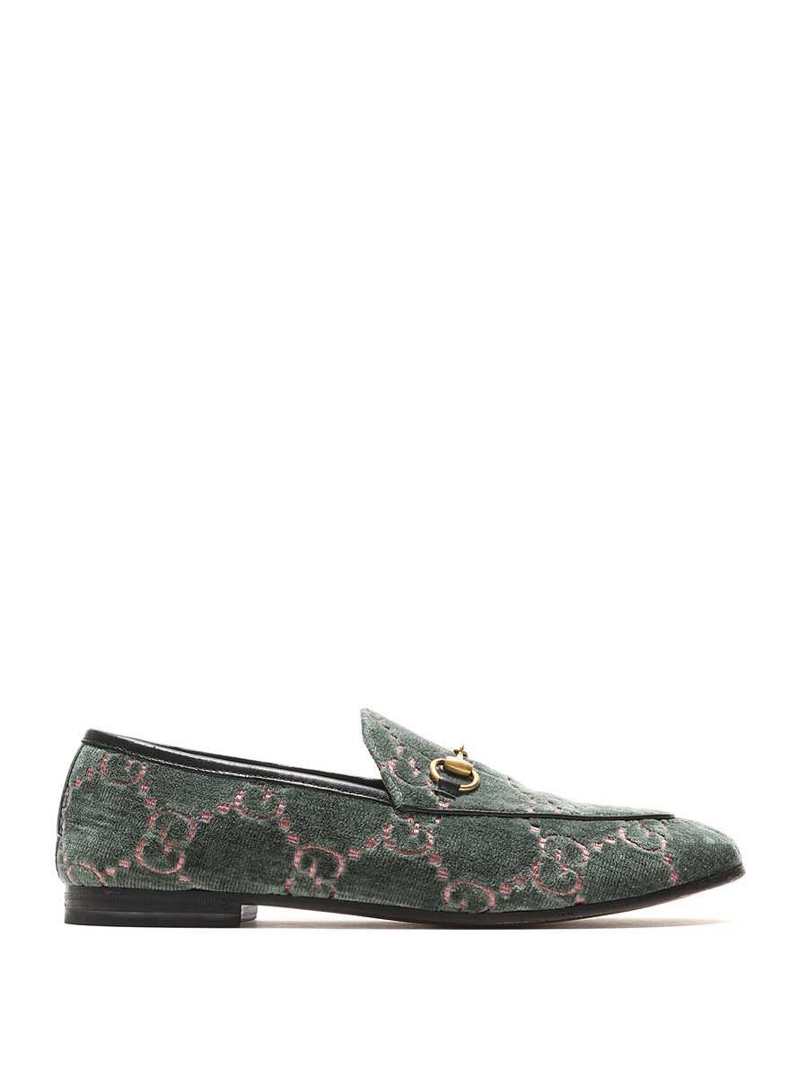 Mocassins à motif GG Supreme en velours vert et rose. Style à enfiler. Bout rond. Semelle en cuir.