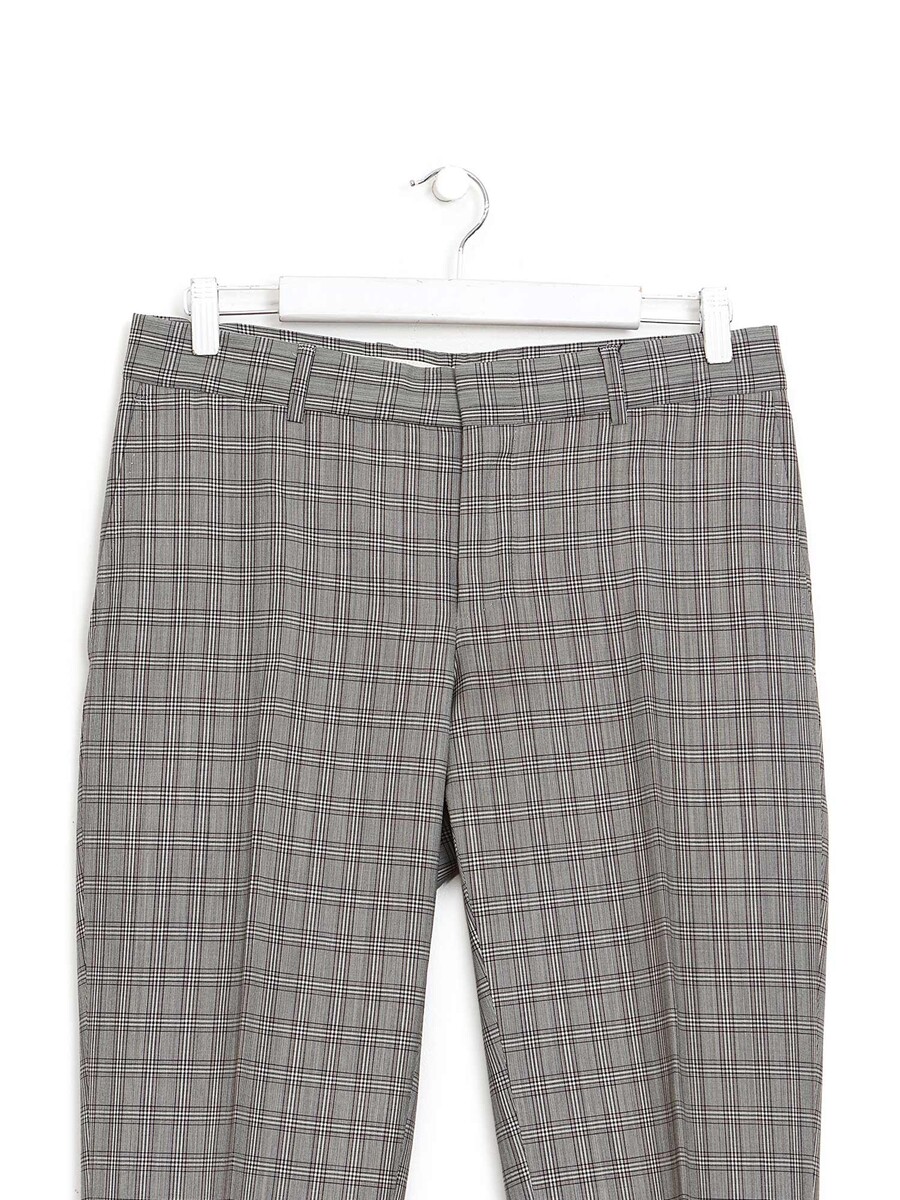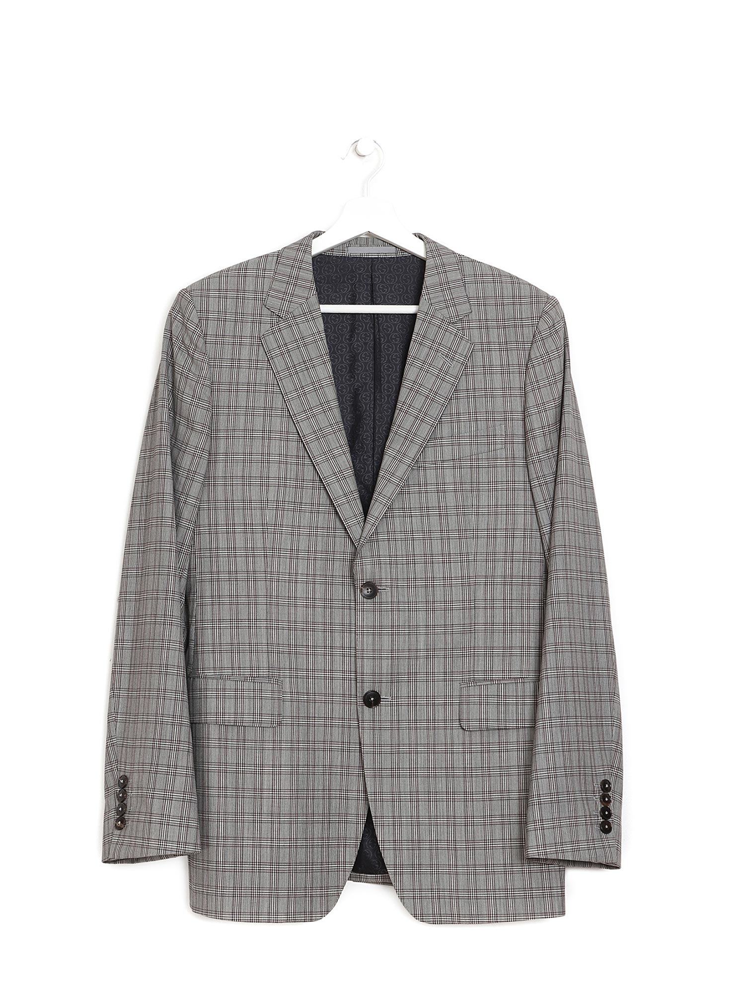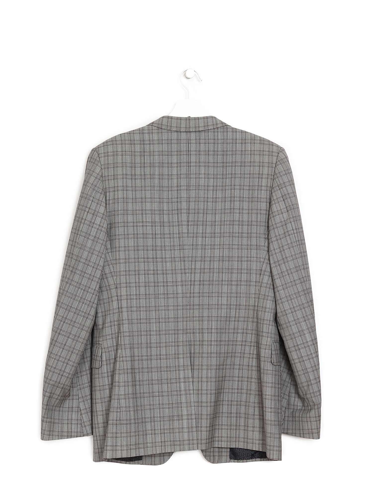 Ensemble à motif à carreaux gris comprenant pantalon à jambes ajustées et blazer à manches longues. Le pantalon possède une fermeture à boutons et poches passepoilées arrière. Le blazer est doté d'une fermeture à boutons, d'un col à revers cranté et de poches à rabat.