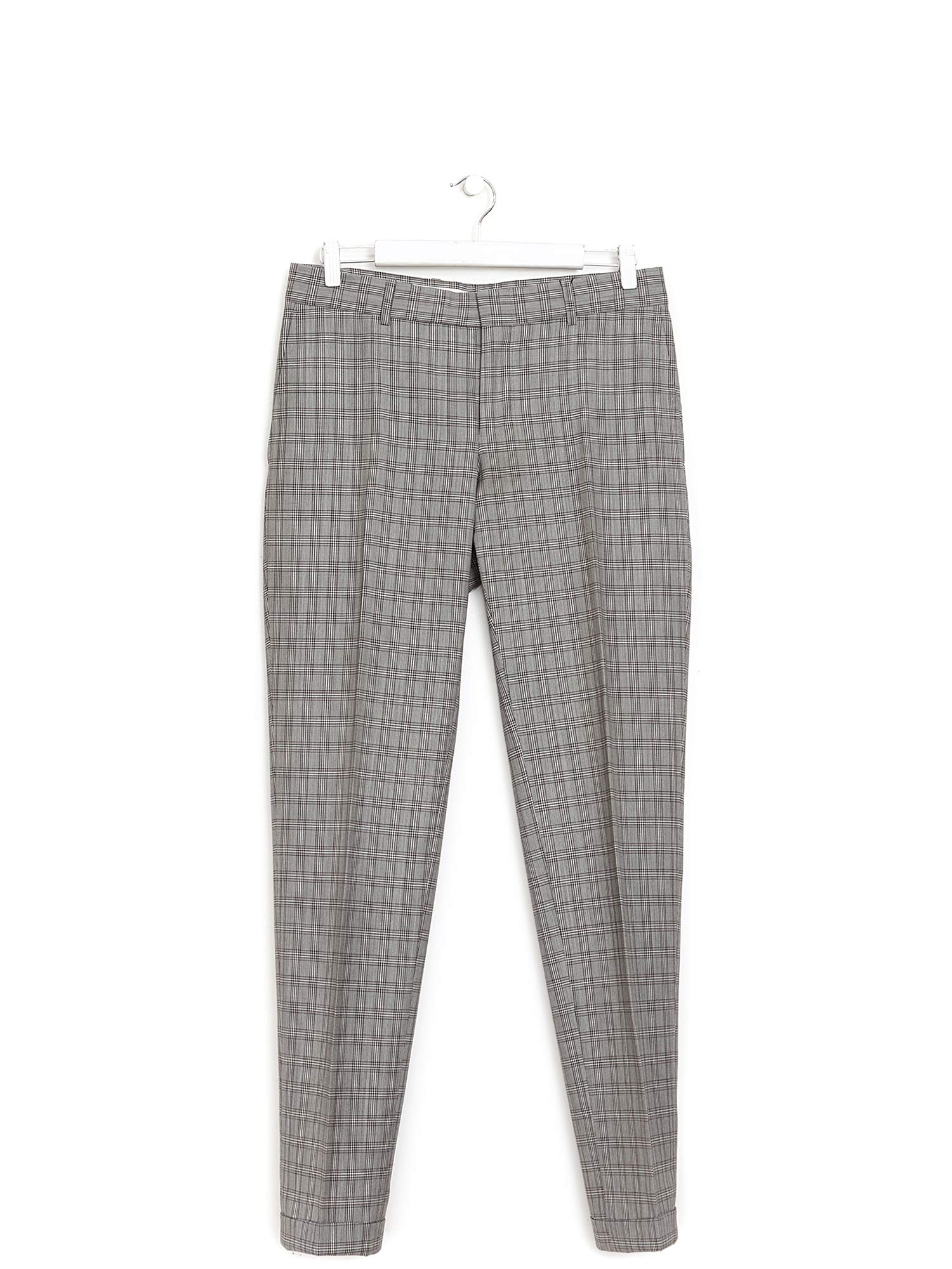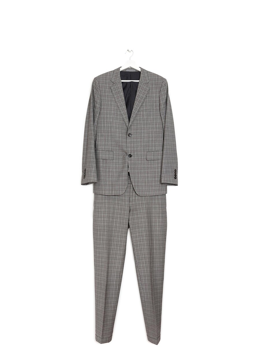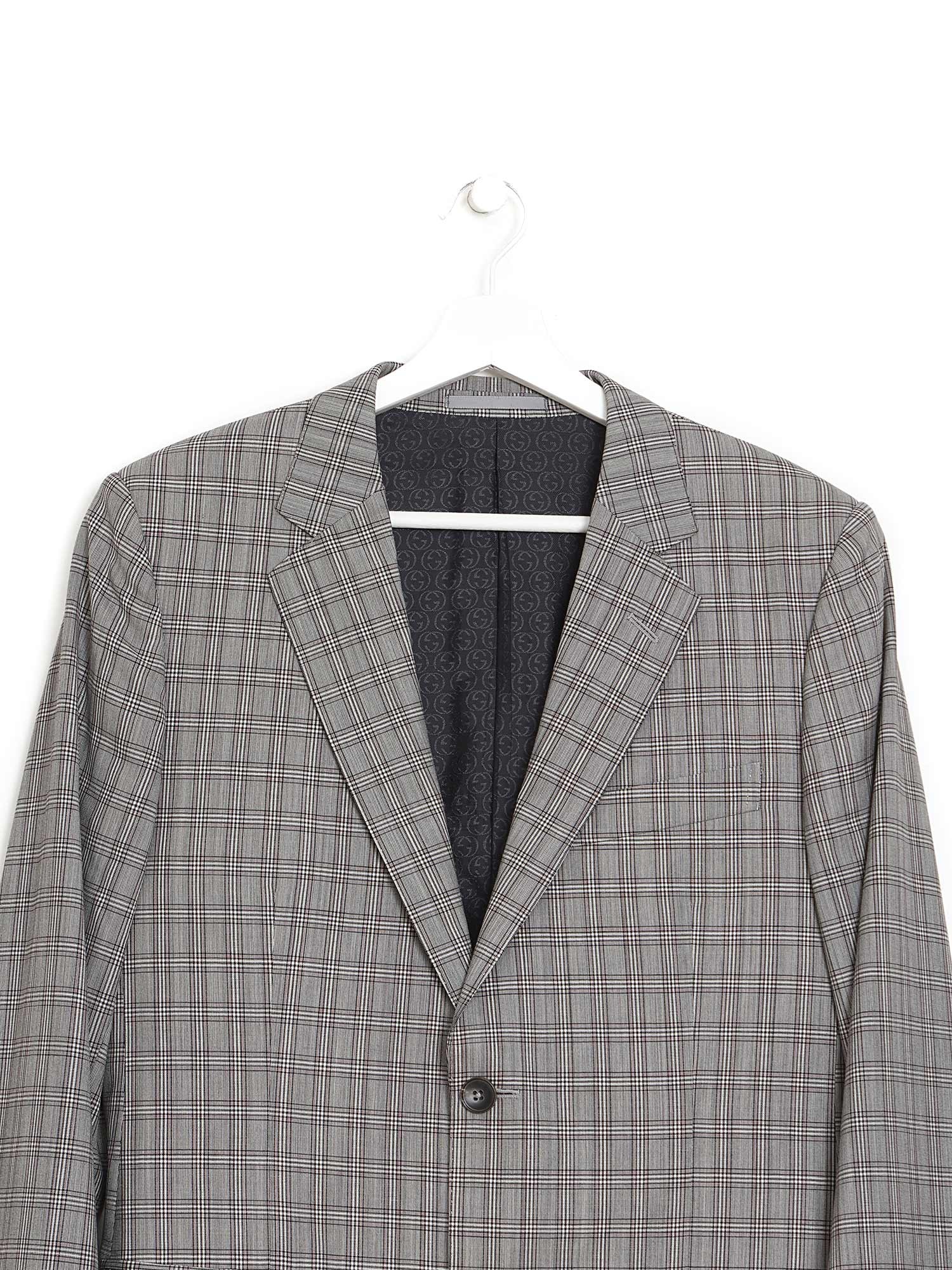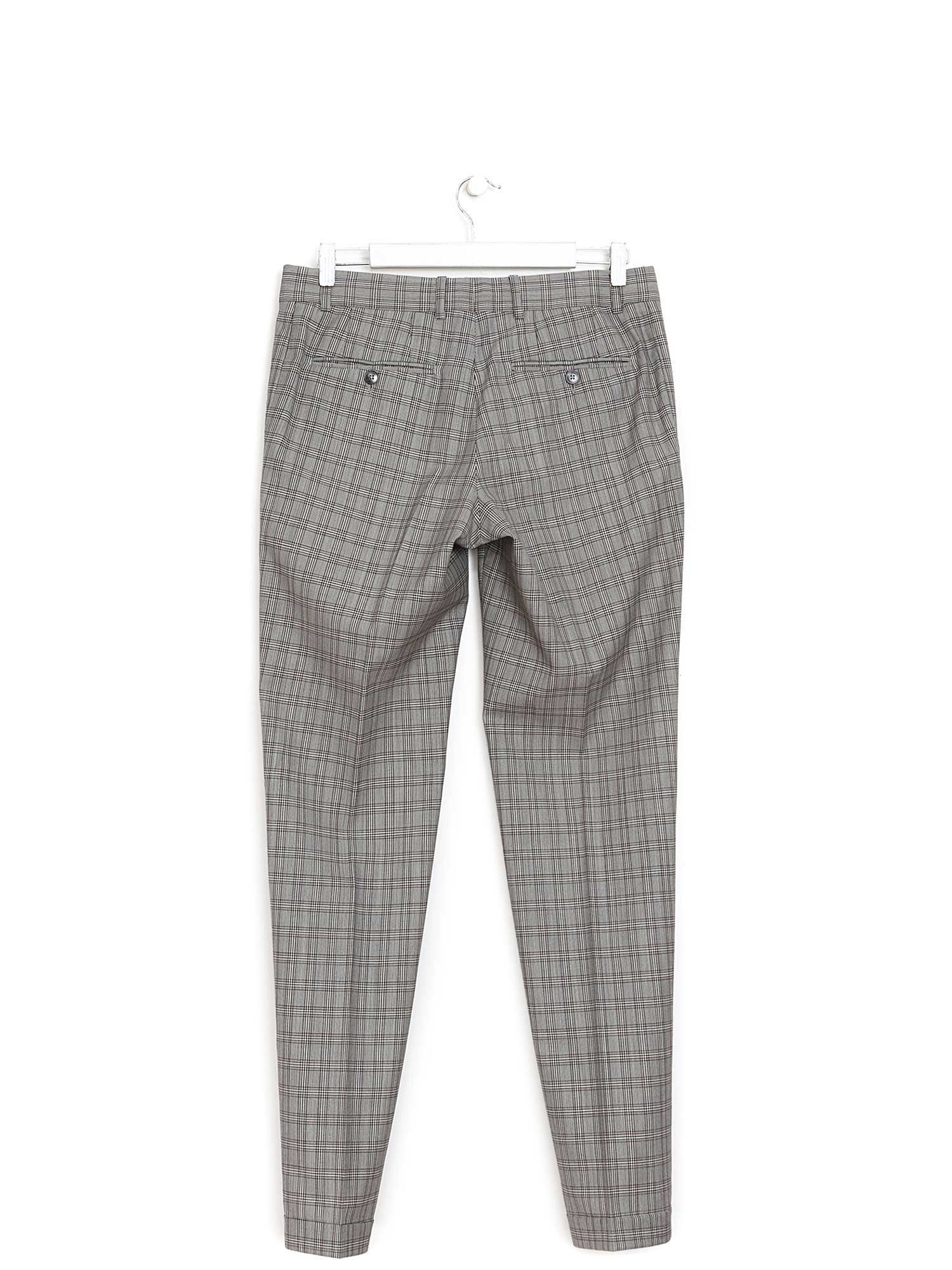 Ensemble à motif à carreaux gris comprenant pantalon à jambes ajustées et blazer à manches longues. Le pantalon possède une fermeture à boutons et poches passepoilées arrière. Le blazer est doté d'une fermeture à boutons, d'un col à revers cranté et de poches à rabat.