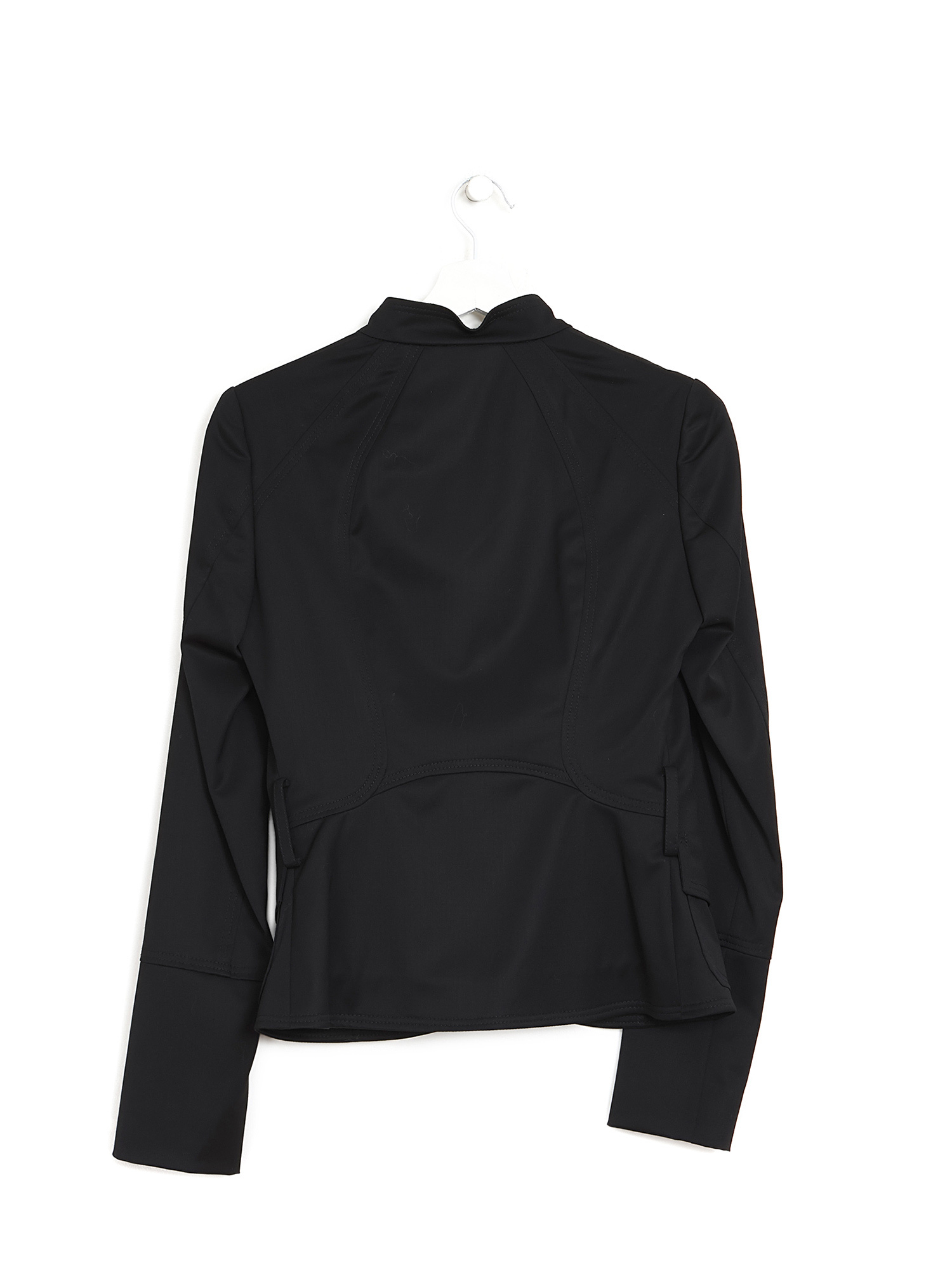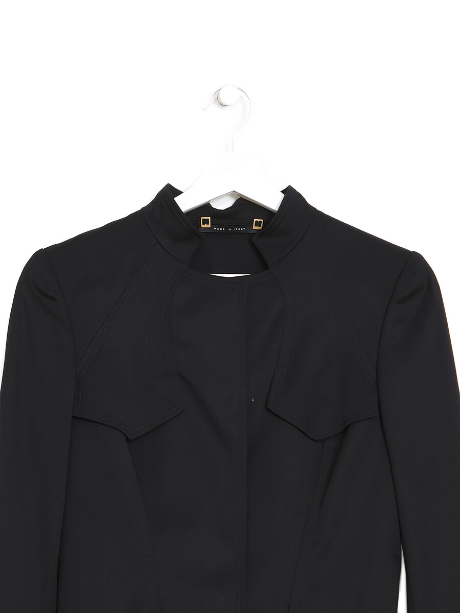 Veste noire à manches longues avec fermeture à boutons et ceinture amovible. Quatre poches à rabat. Col montant. Taille ceinturée. En laine mélangée.