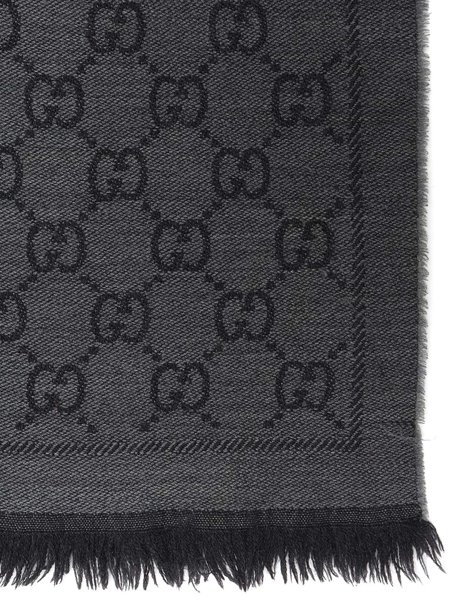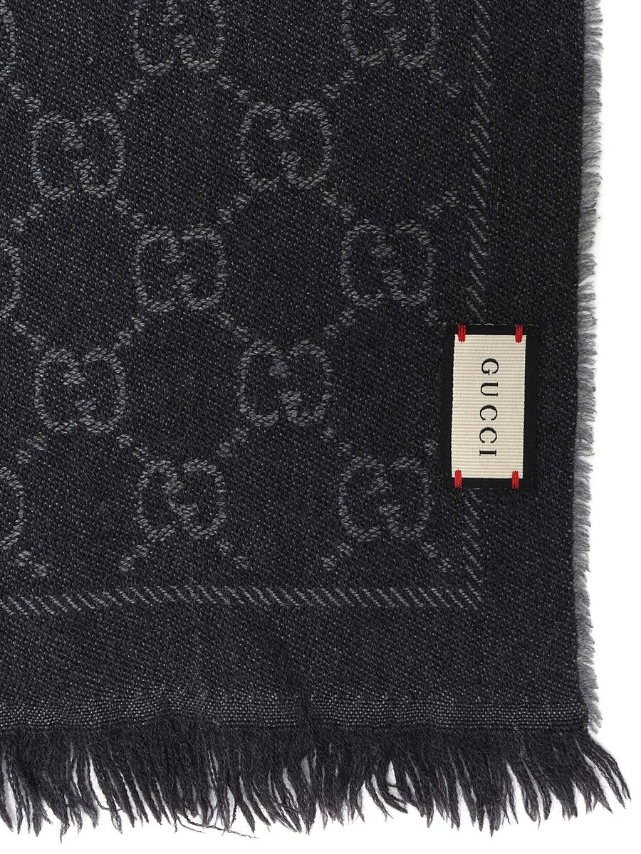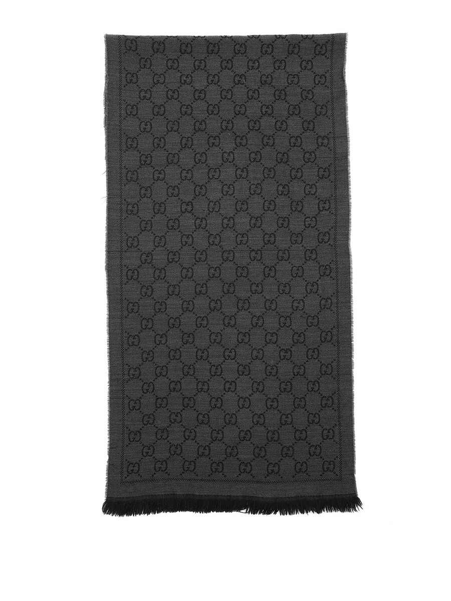 Écharpe rectangulaire avec motif logo GG dans les tons de gris. Bords à franges.